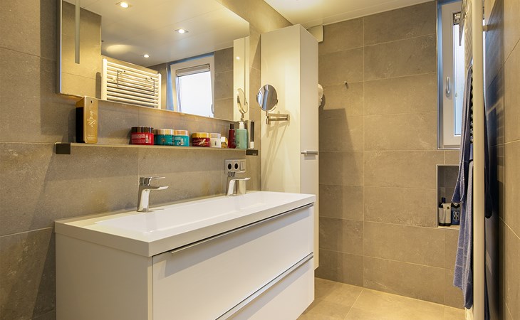 De entree van de woning geeft toegang tot een 2-persoons slaapkamer en een moderne badkamer met inloopdouche en dubbele wastafel. Tevens is er in de hal een apart gastentoilet.