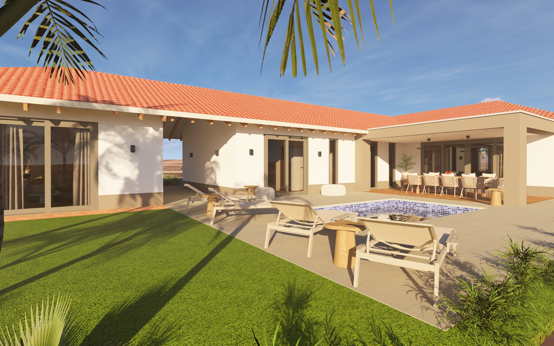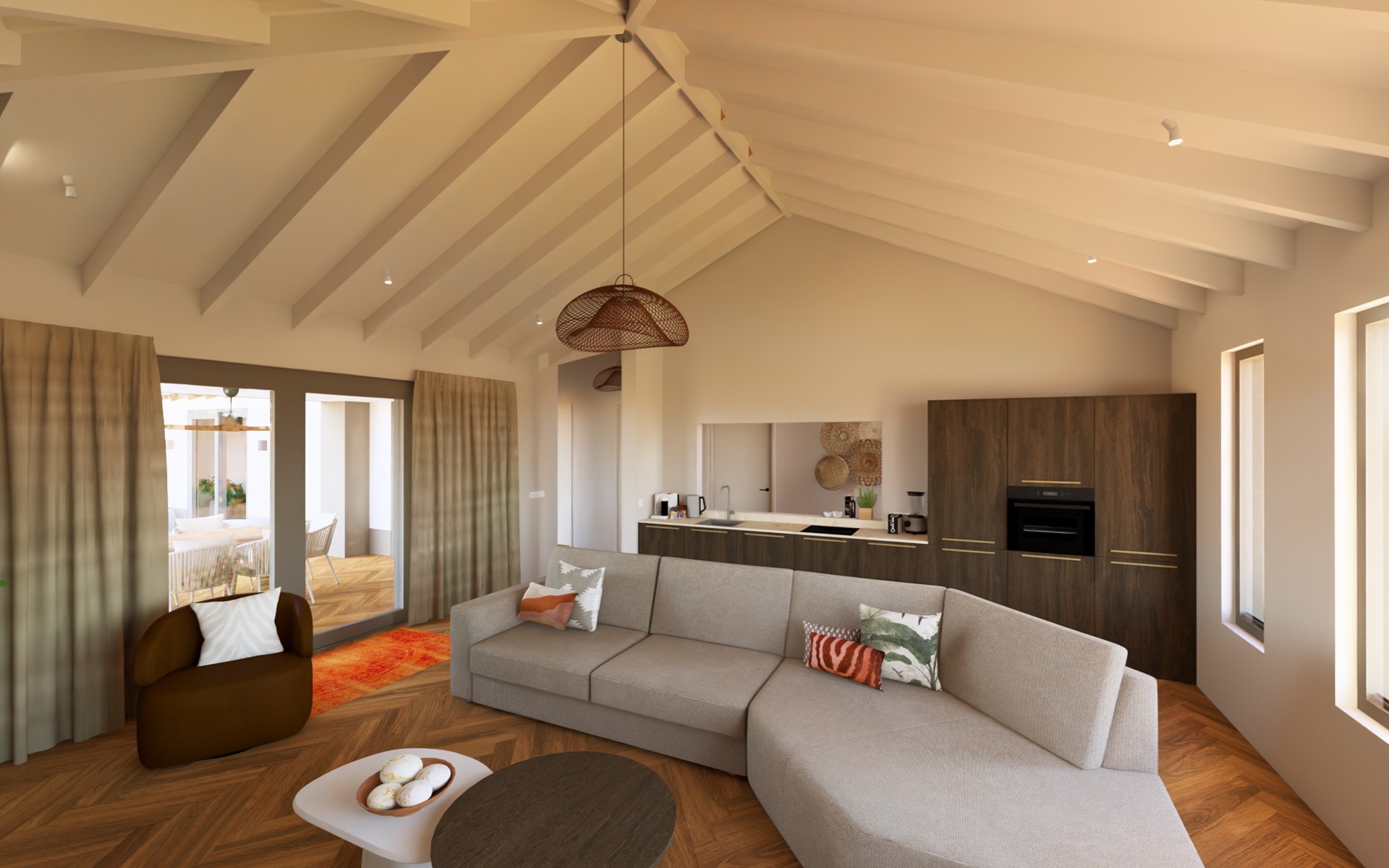 De lichte woonkamer, met compleet ingerichte, luxe open keuken, geeft toegang tot de omheinde tuin. Buiten vind je een heerlijk privézwembad met zonnig terras, waar je kunt ontspannen op luxe ligbedden of samen geniet van lange, zwoele avonden onder de sterrenhemel. Onder de veranda, met glazen vouwdeuren, staat een grote eettafel en de BBQ. Of je nu wilt afkoelen in het zwembad, uitgebreid wilt dineren in de buitenlucht of gewoon wilt genieten van de rust en het uitzicht - hier kan het allemaal.