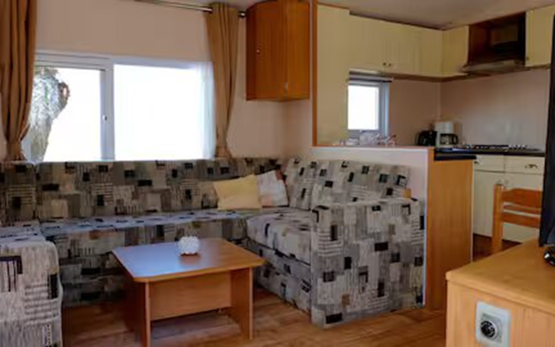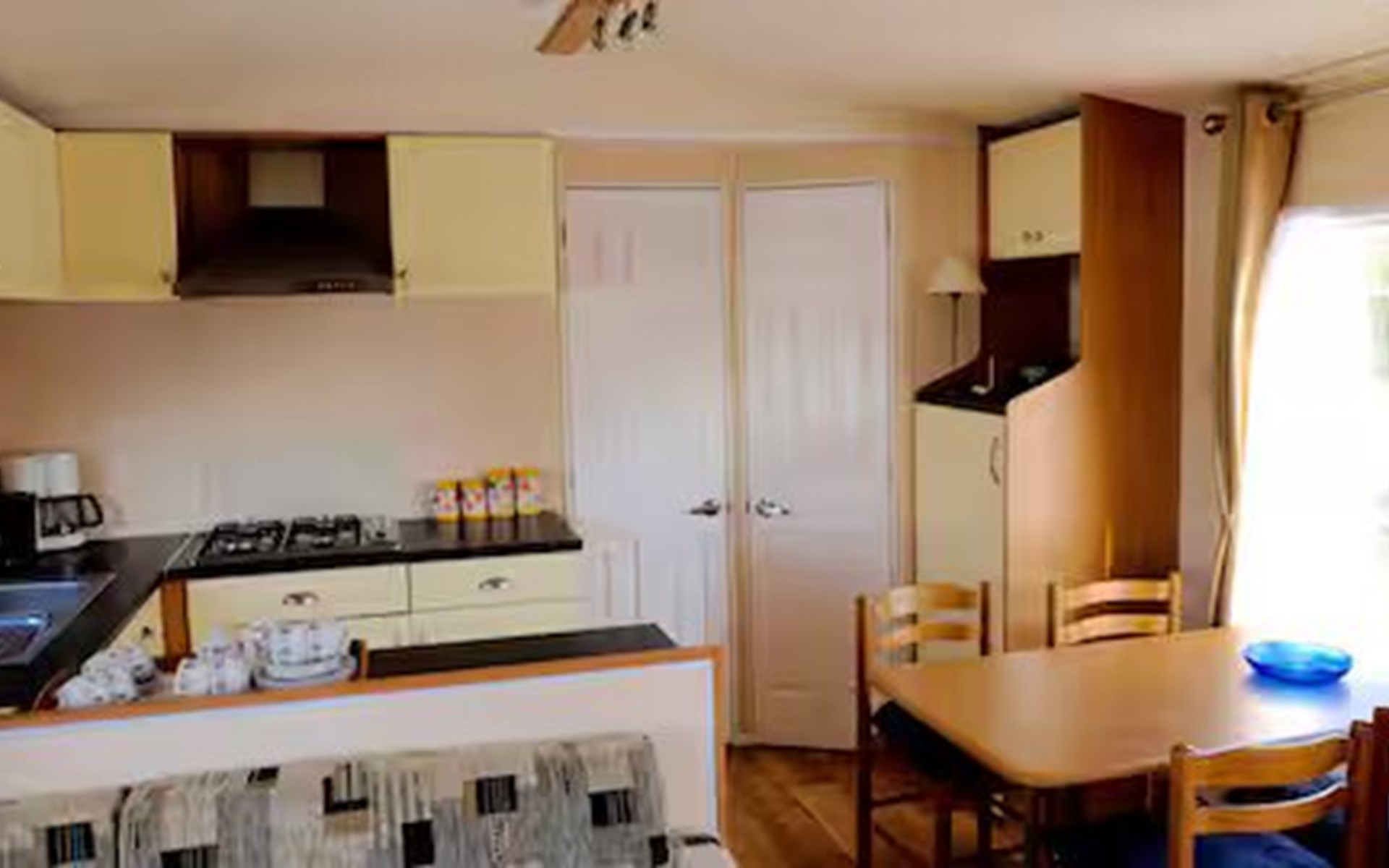 Binnen treft u een lichte en gezellige leefruimte met een comfortabele zithoek en eethoek waar u samen kunt ontbijten of ’s avonds kunt natafelen. Grote ramen zorgen voor veel daglicht en een mooi uitzicht op het omliggende landschap.