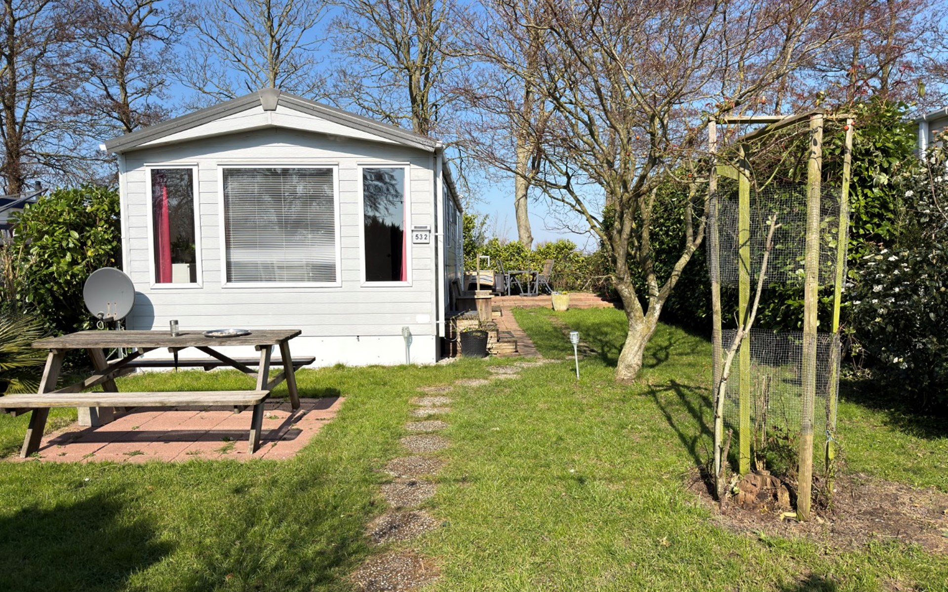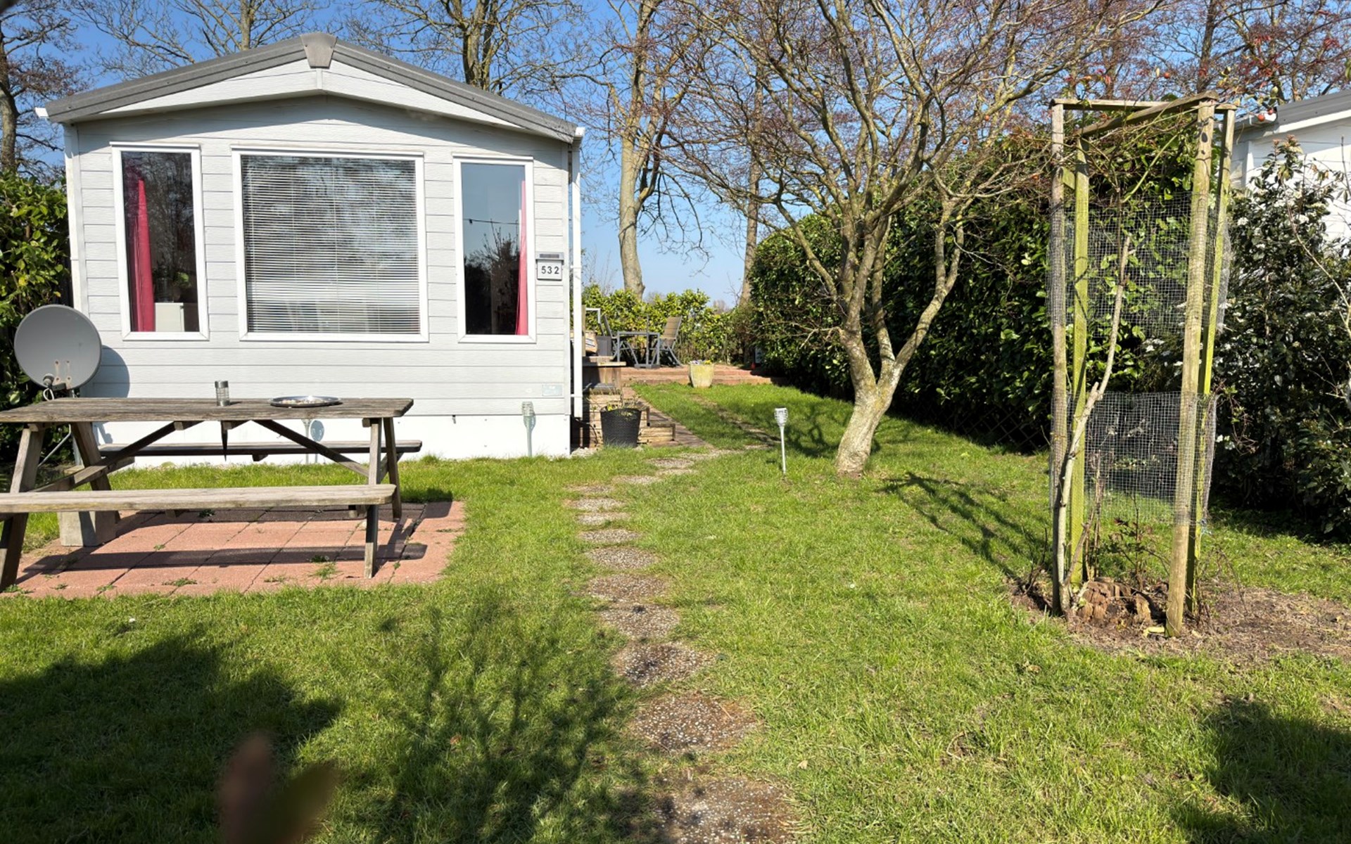 Buiten kun je genieten van een overdekt terras, waar je op elk moment van de dag heerlijk kunt zitten – of je nu wilt ontbijten, ontspannen of gezellig samen wilt eten. De royale tuin is voorzien van twee zonnebanken en een houtskool BBQ.