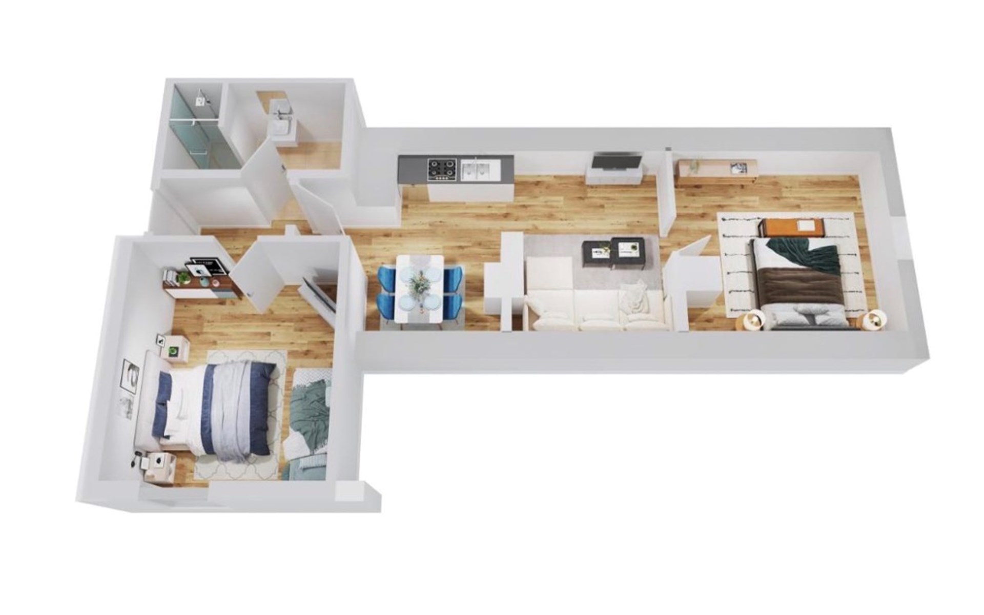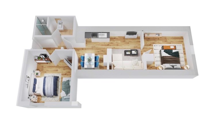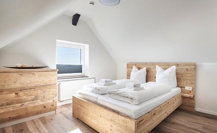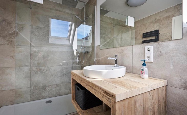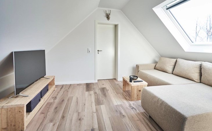 Het appartement ligt op de derde etage en voelt door de schuine wanden en dakramen meteen knus. Het daglicht valt mooi naar binnen, waardoor de woonkamer een fijne plek is om samen neer te ploffen. Na een dag in de buitenlucht zak je weg in de hoekbank, misschien met een film op de smart-tv of gewoon even helemaal niets. En voor je het weet zit je samen aan tafel, nog even napraten over de dag of plannen maken voor morgen.