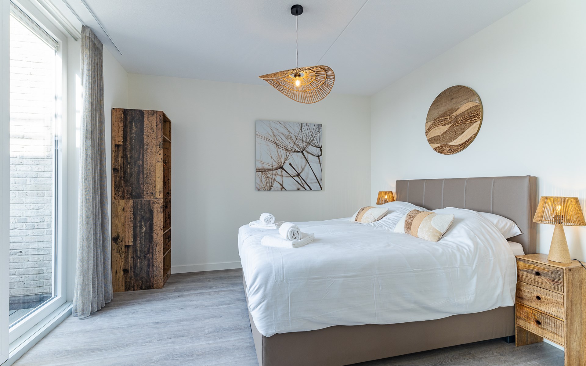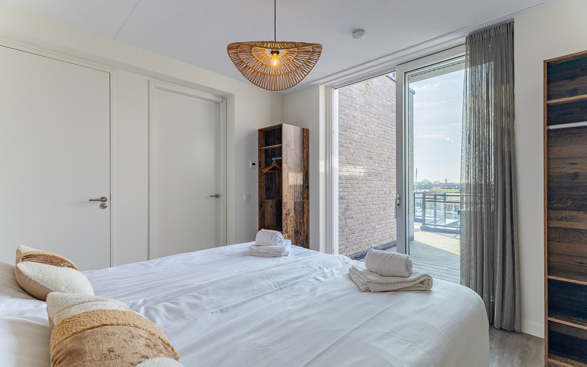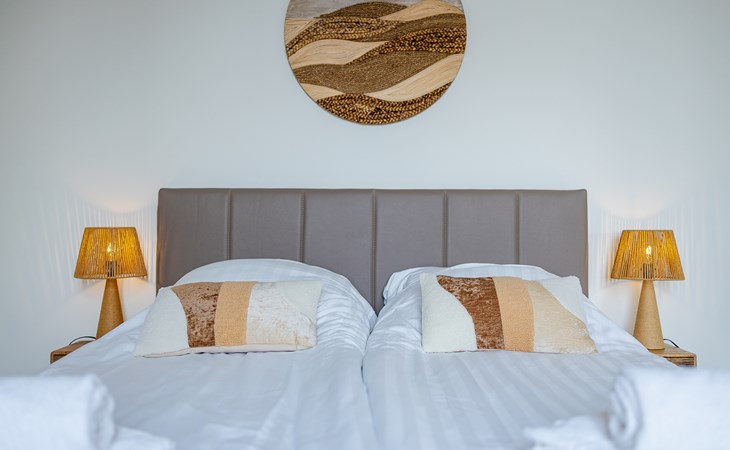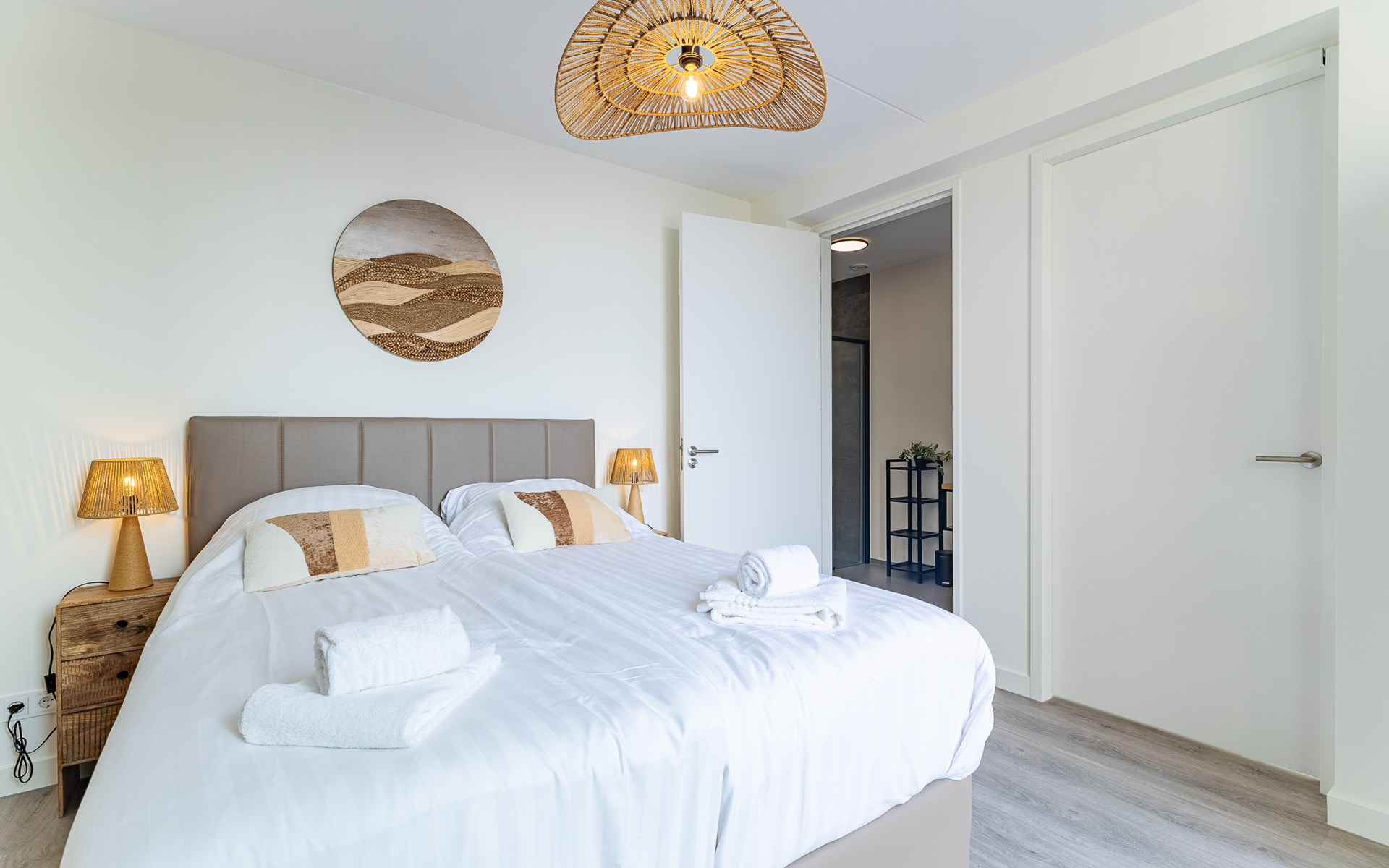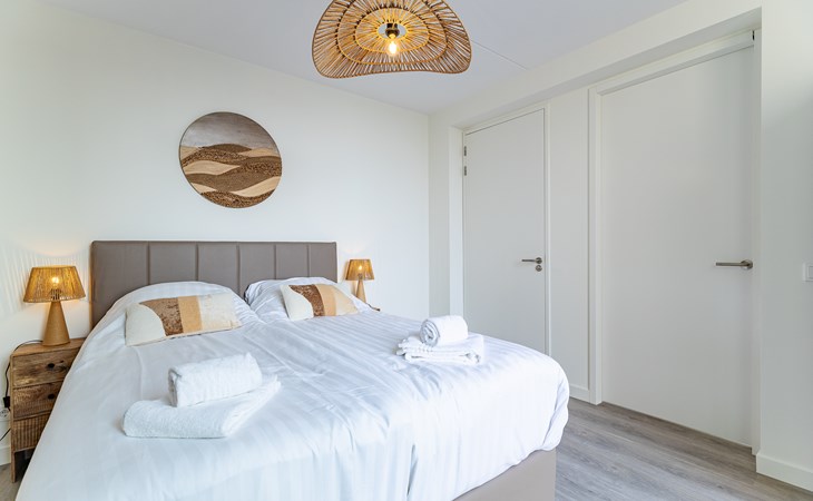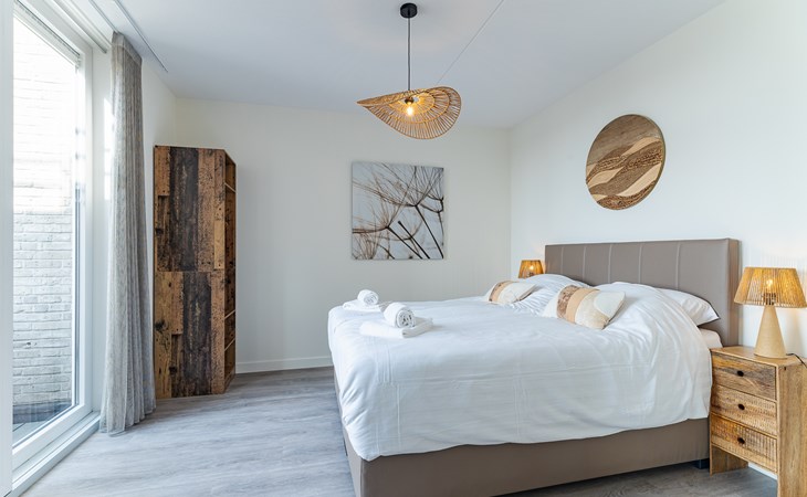 De slaapkamer straalt rust uit en is ingericht met een tweepersoonsbed (160x200 cm), nachtkastjes, bedverlichting en een kledingkast. Hier hoor je ’s avonds vooral stilte en in de ochtend misschien een meeuw in de verte. De en suite badkamer met inloop regendouche voelt fris en prettig, een fijne start en afsluiting van je dag.