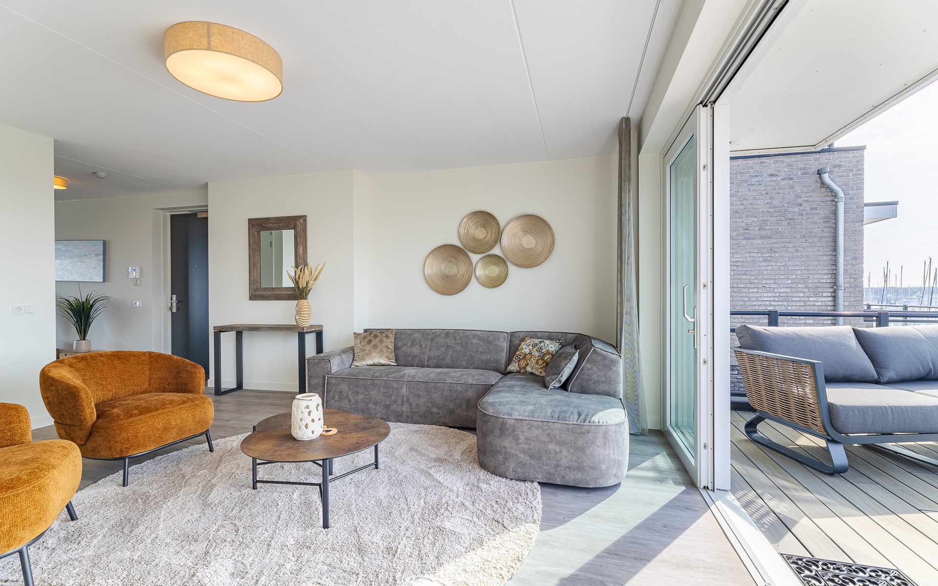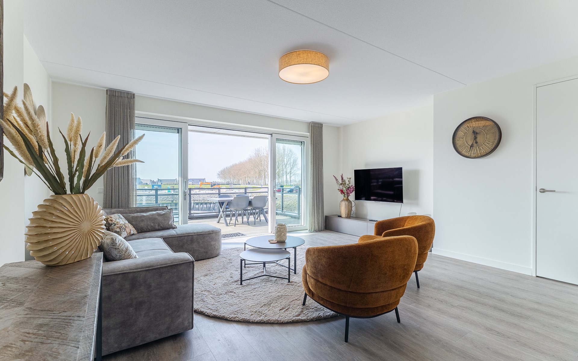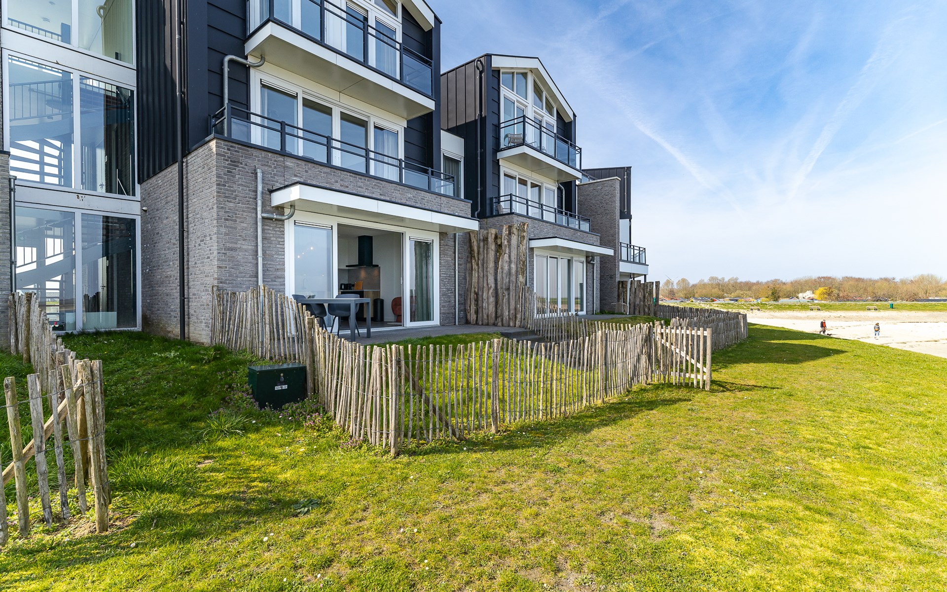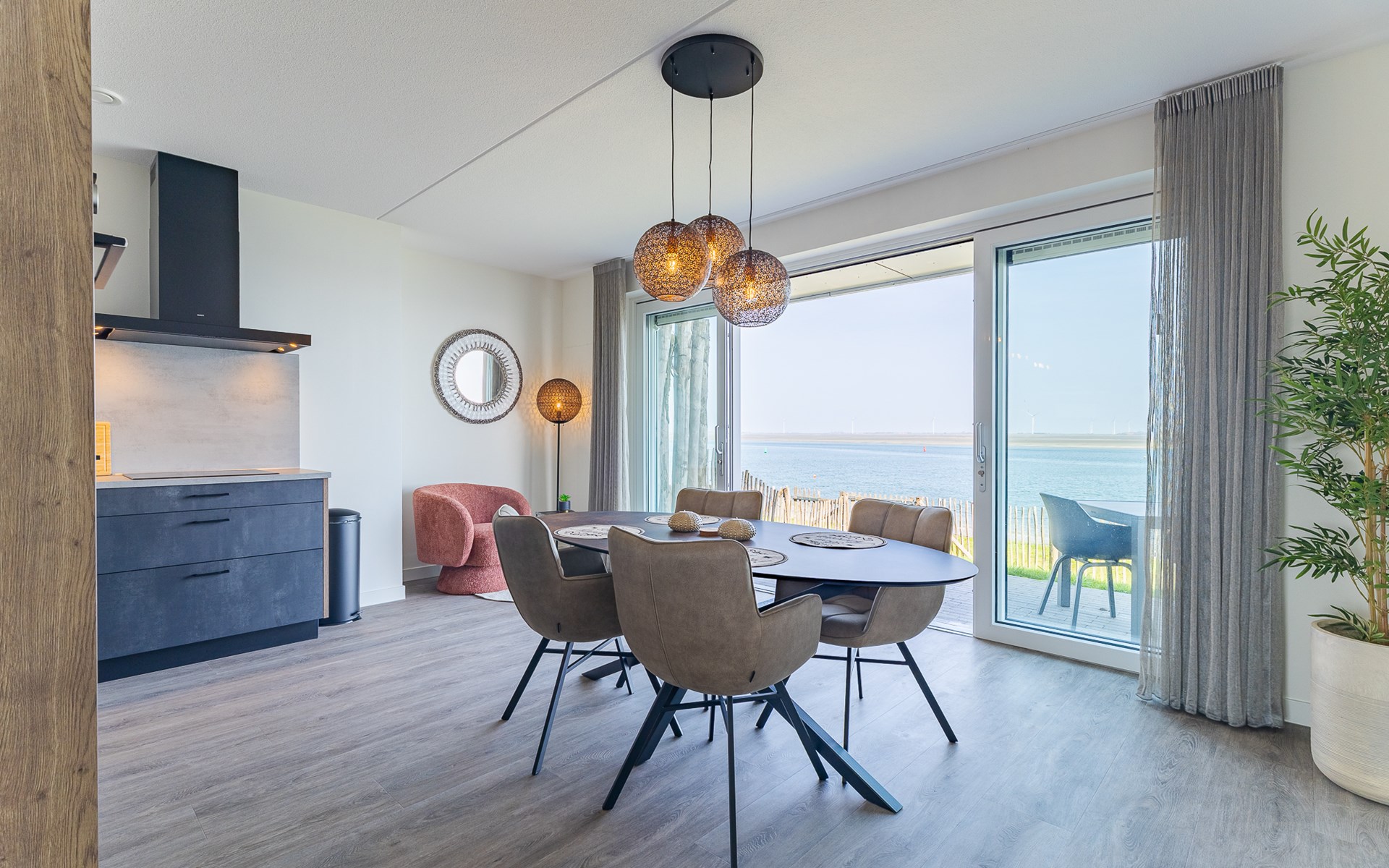 Buiten heb je keuze. Aan de voorzijde ligt het terras (30 m²) met uitzicht op de jachthaven, waar je in de middag- en avondzon zit op de loungebank of aan tafel. Aan de achterzijde vind je de tuin (22 m²) met een knus zitje voor de ochtendzon. Via een poortje loop je zo het strandje op: ideaal voor een korte wandeling of gewoon even uitwaaien. Van woonkamer tot terras ontdek je steeds weer een nieuw plekje waar je net iets langer blijft zitten dan gepland.