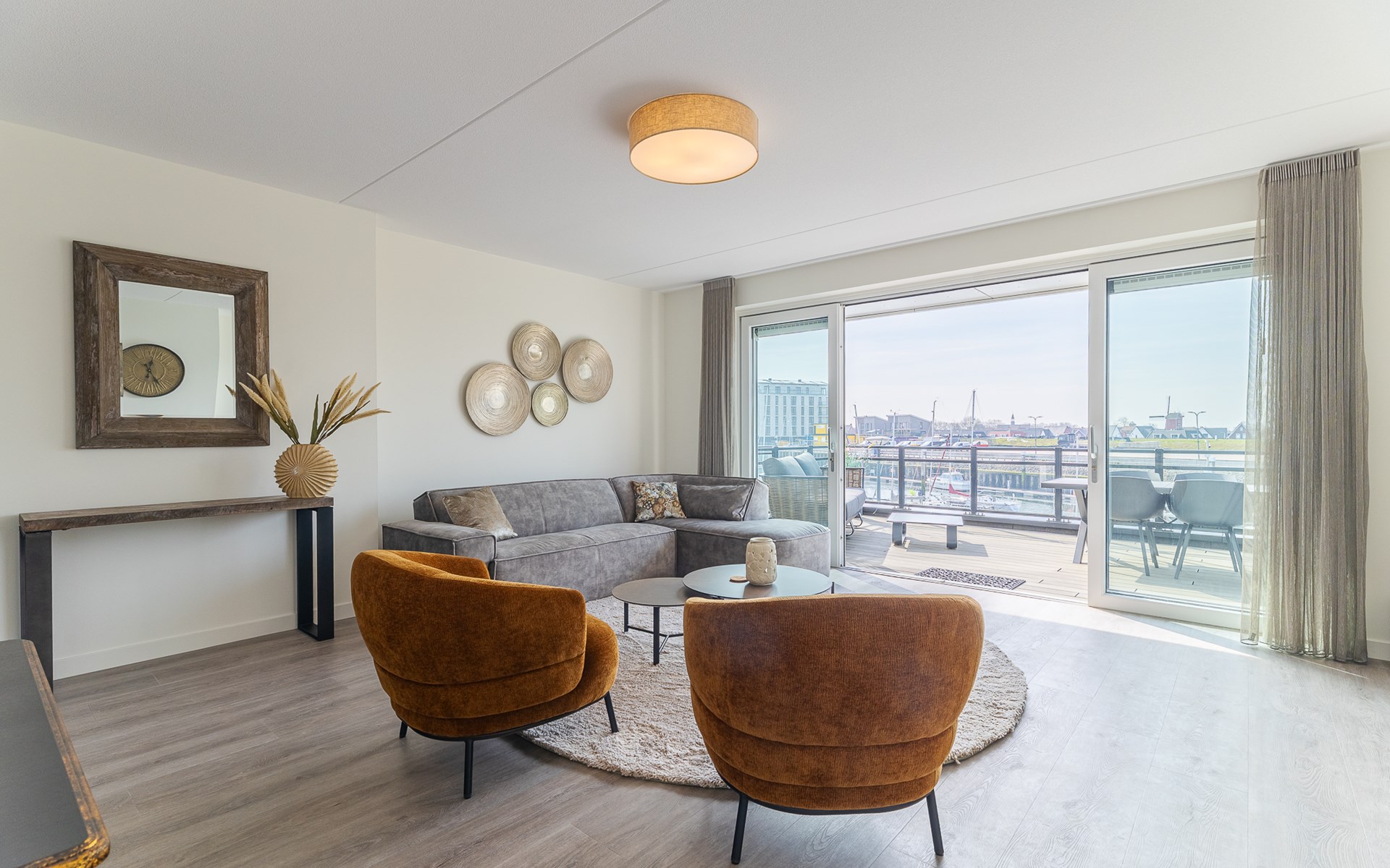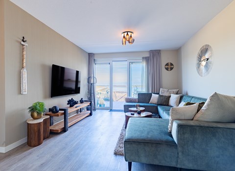Vista Maris ligt op de begane grond, maar is alleen bereikbaar via een trap; goed om te weten als je minder goed ter been bent. Eenmaal boven voelt het meteen ruim en open. De woonkamer is licht en uitnodigend, met een comfortabele zithoek en flatscreen tv, maar de echte blikvanger zijn de grote schuifpuien aan beide kanten. Waar je ook zit, je kijkt uit over het water of de levendigheid van de jachthaven.
