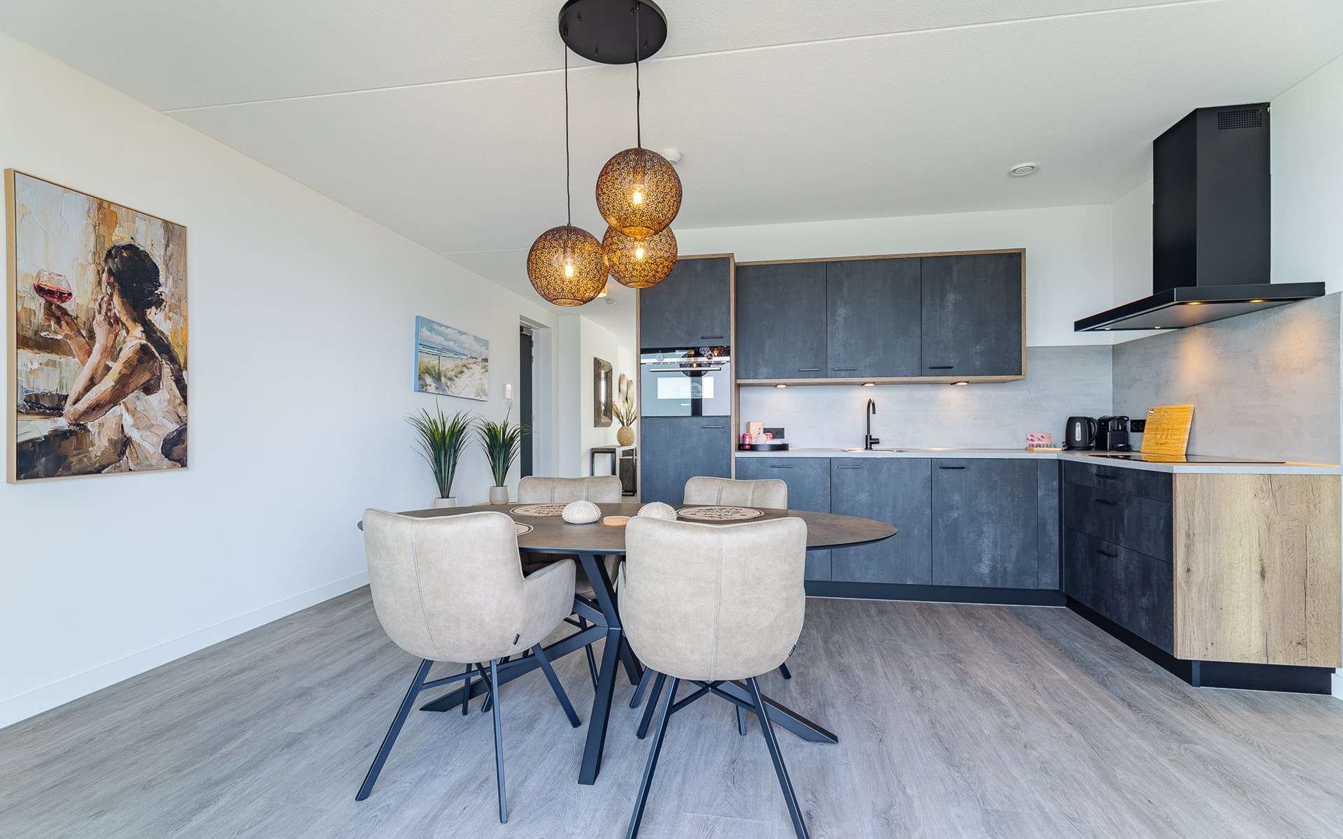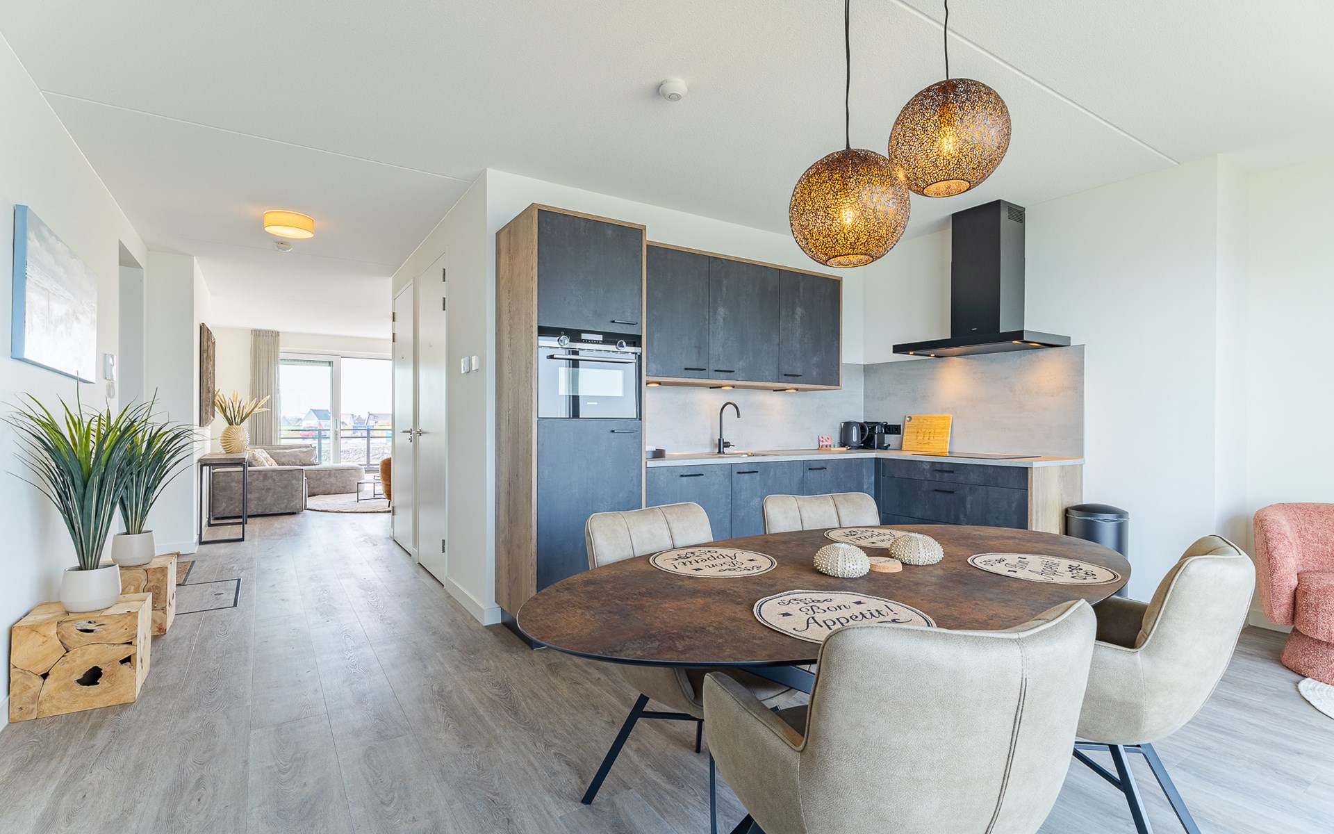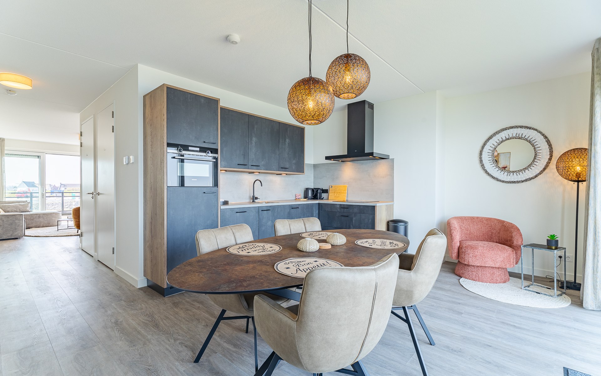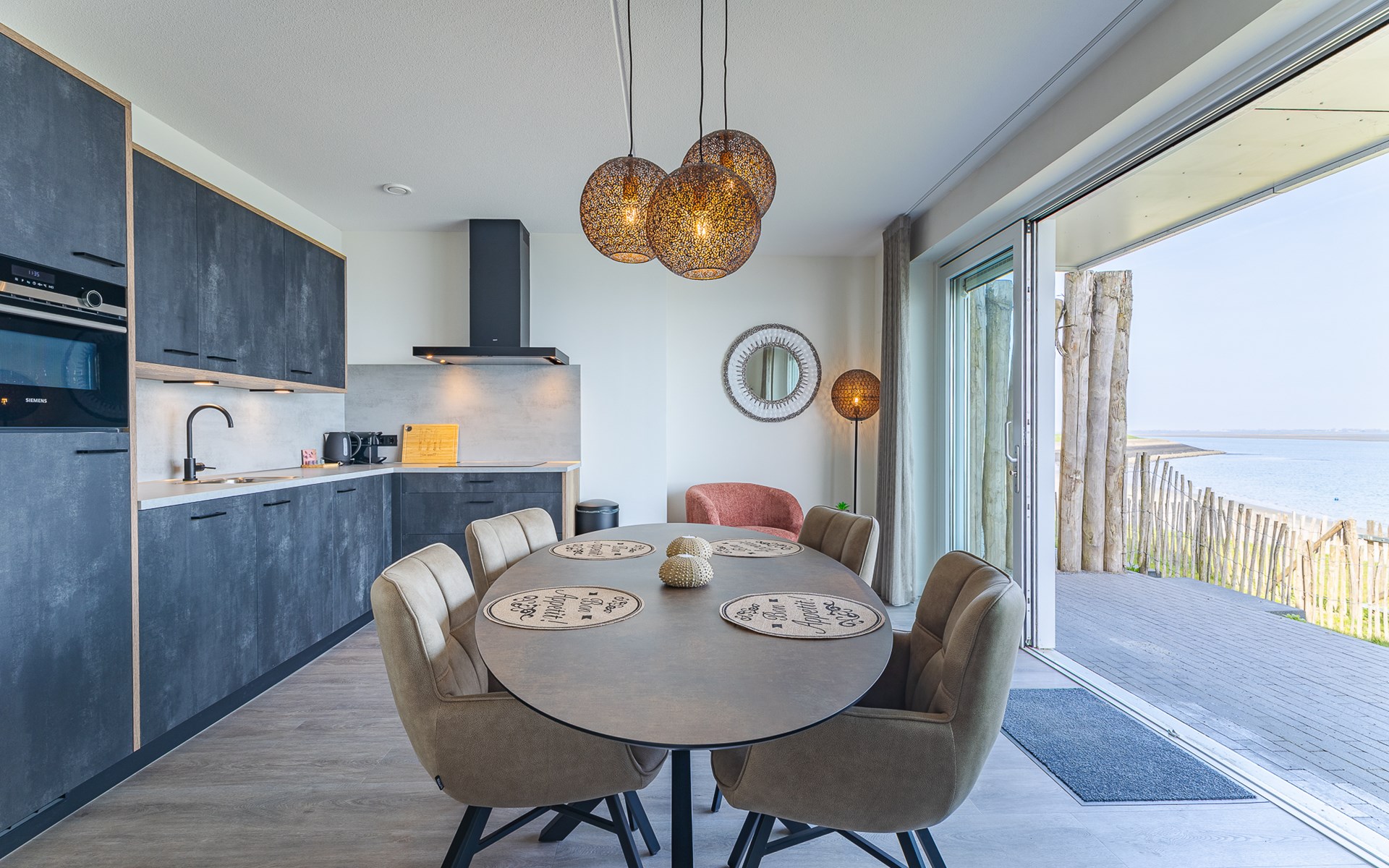 De open keuken is een plek waar je graag blijft hangen. Je kookt op de 4-pits kookplaat, terwijl je ondertussen naar buiten kijkt of even het terras oploopt. De keuken is compleet ingericht met een combimagnetron, koelkast, vaatwasser, koffiezetapparaat (filter en Nespresso), waterkoker en broodrooster. Misschien kook je uitgebreid, misschien houd je het simpel, allebei past hier.