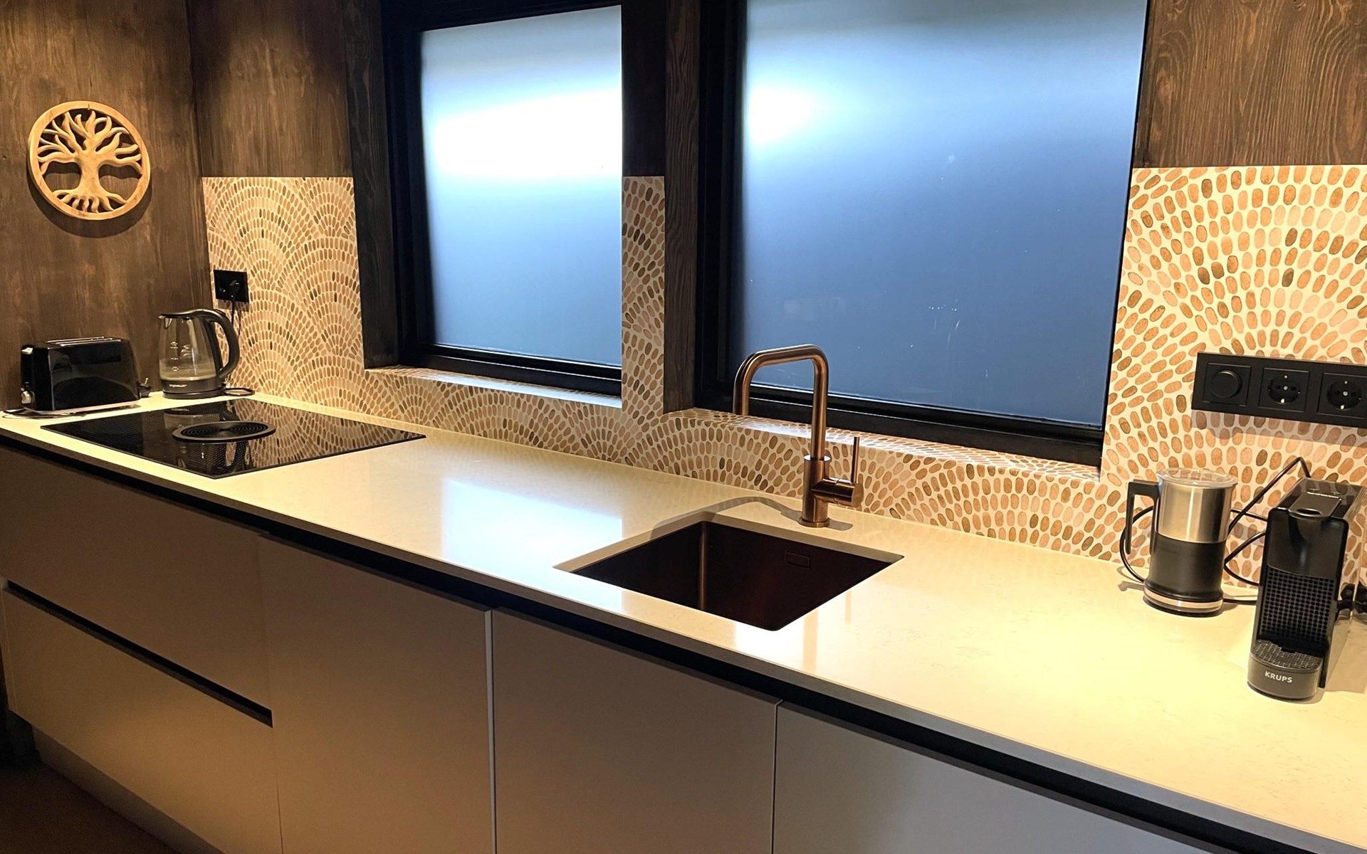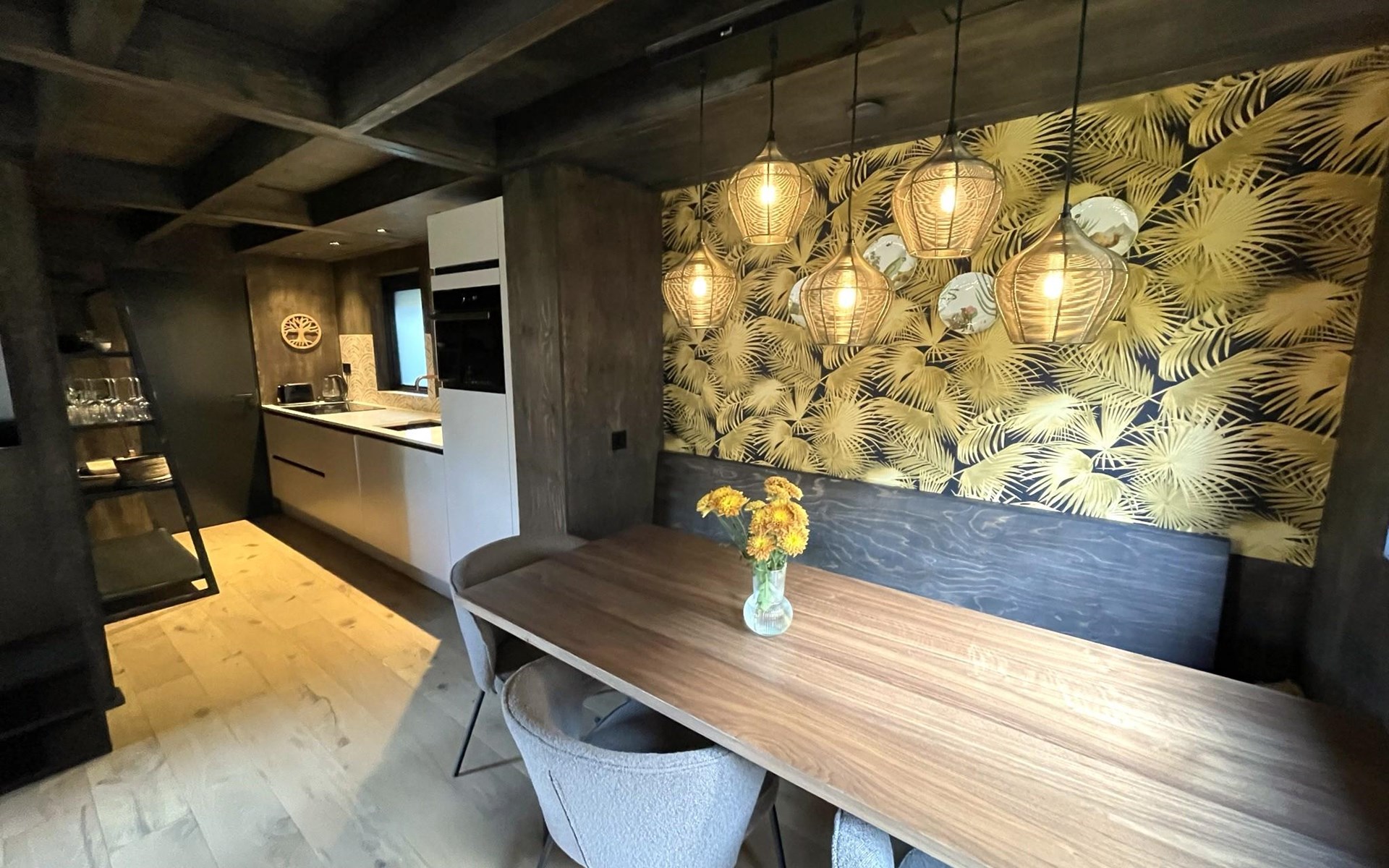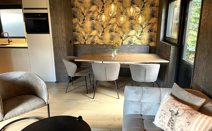 De woonkamer is warm en kleurrijk ingericht met een comfortabele zithoek, Smart TV en fijne eettafel. De open keuken is van alle gemakken voorzien, zoals een inductiekookplaat, vaatwasser, ruime koelkast en Nespresso koffiemachine.