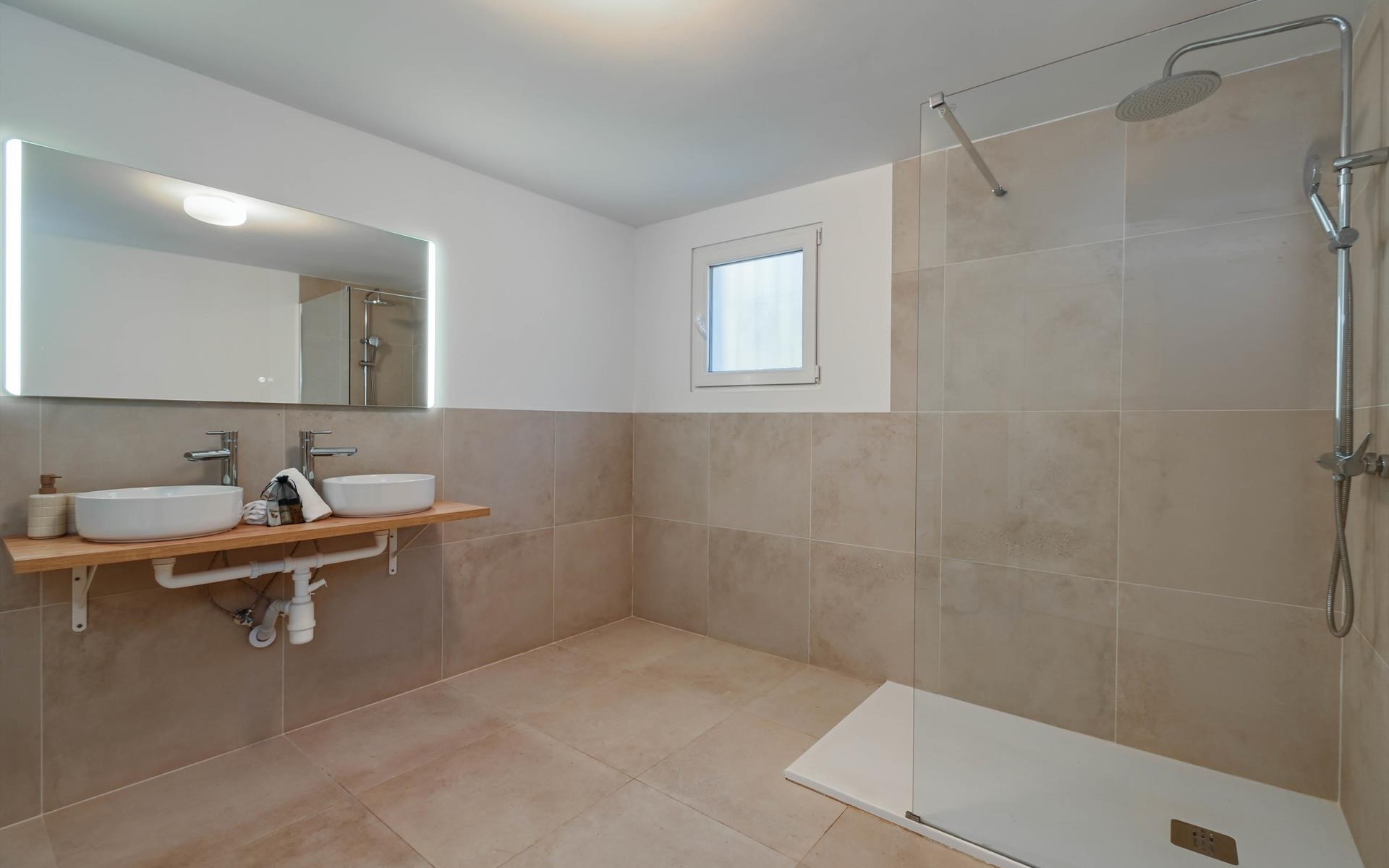 - en-suite badkamer met dubbele wastafel, douche en toilet