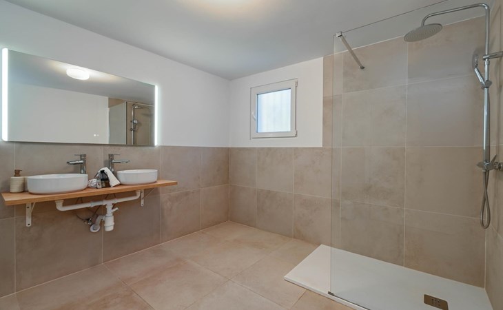 - en-suite badkamer met dubbele wastafel, douche en toilet