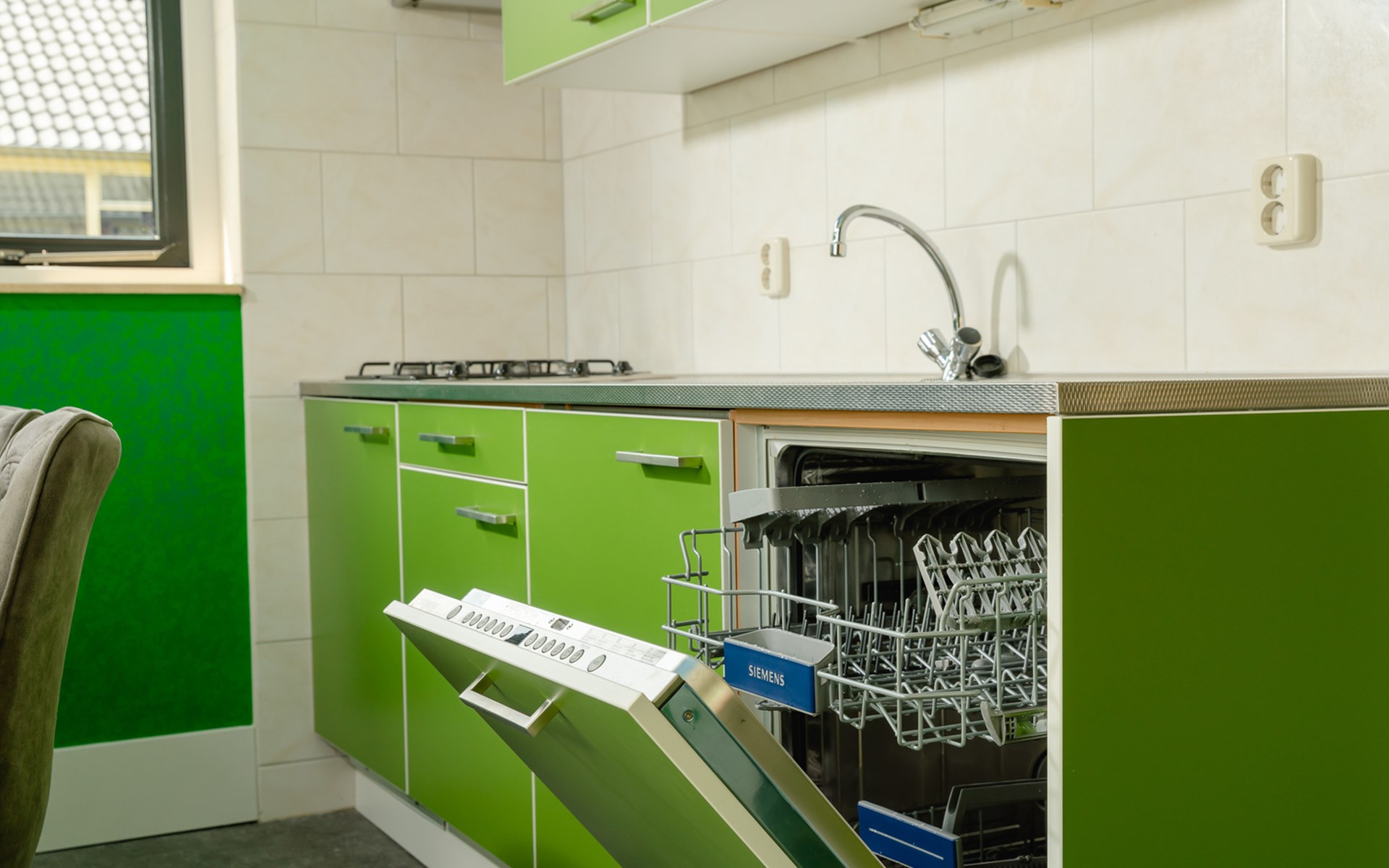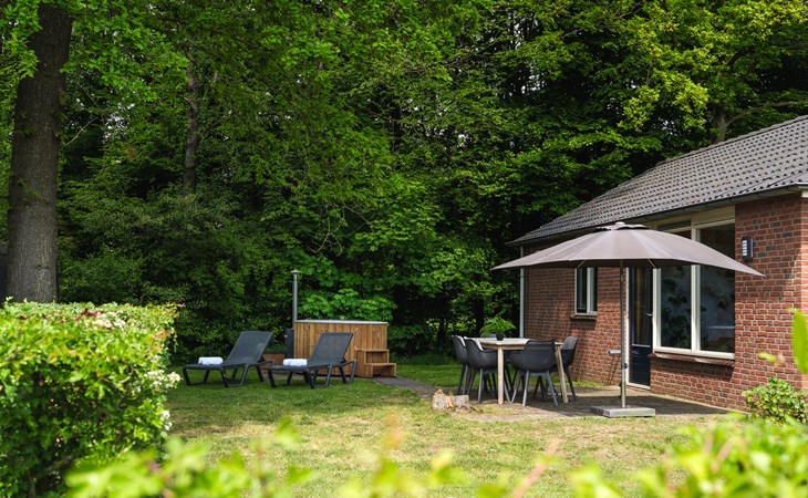 Buiten heb je lekker veel ruimte. De bungalow ligt vrijstaand, waardoor de kids alle plek hebben om te rennen, schieten en trucjes oefenen. Even naar buiten en hup: gras onder de schoenen. Precies zoals het hoort.