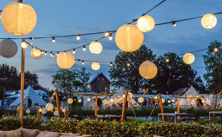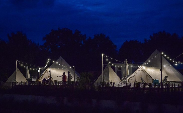 Kinderen rondje rijden in de landrover defenders. Ligging van de tenten aan het haventje. Sfeervol verlichting.