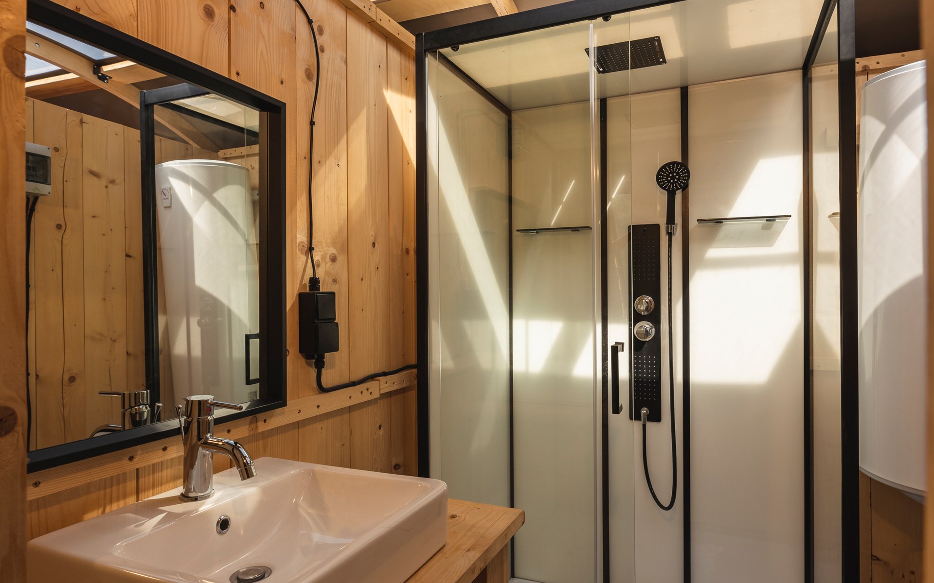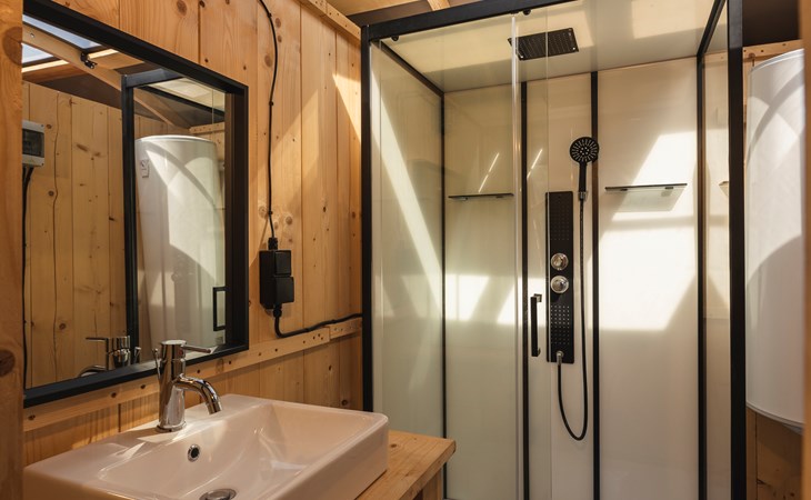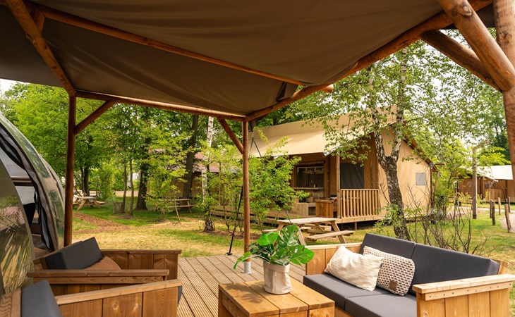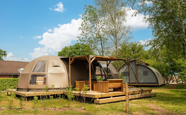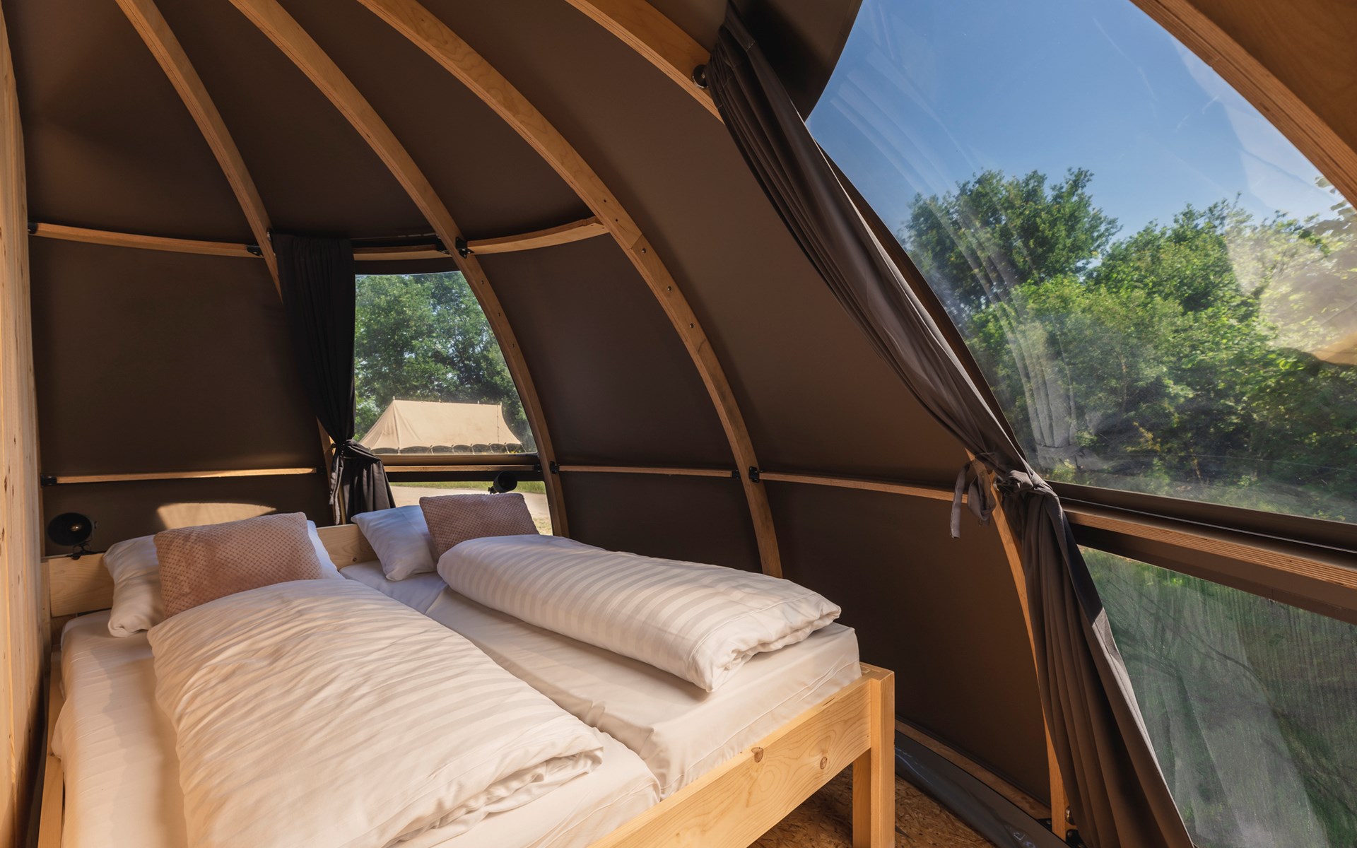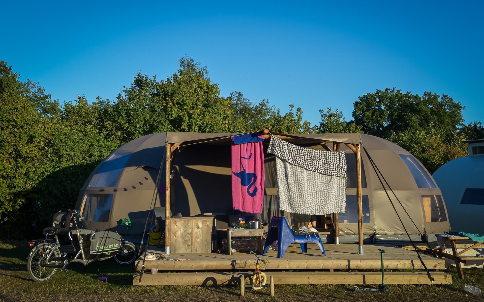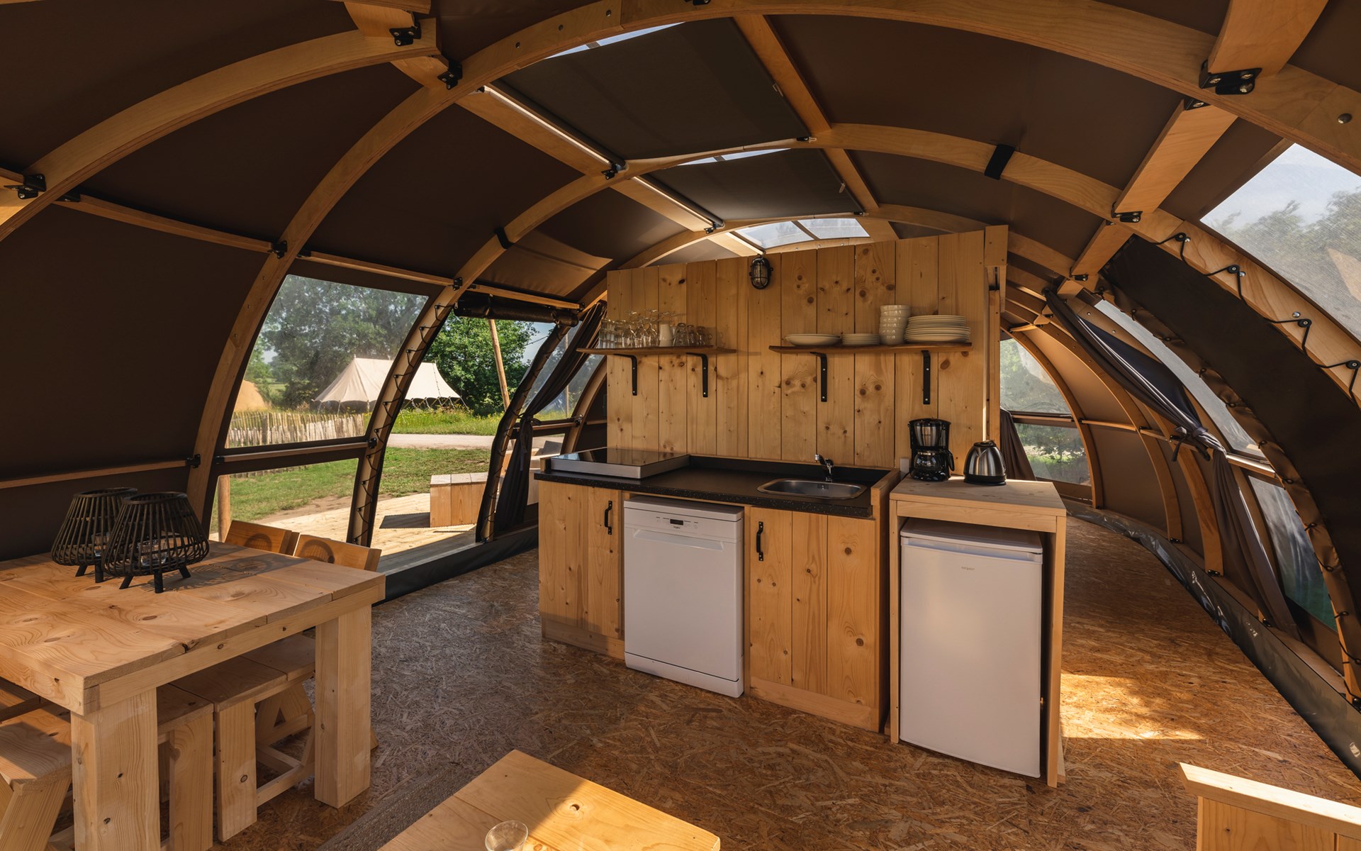 Aan alles is gedacht. Kook in je eigen keukentje met koelkast, geniet van je privé badkamer, relax in de zithoek of trek je terug in de dome wanneer het afkoelt of begint te regenen. Binnen zorgen gordijnen voor volledige privacy en buiten leef je heerlijk op je eigen terras.
