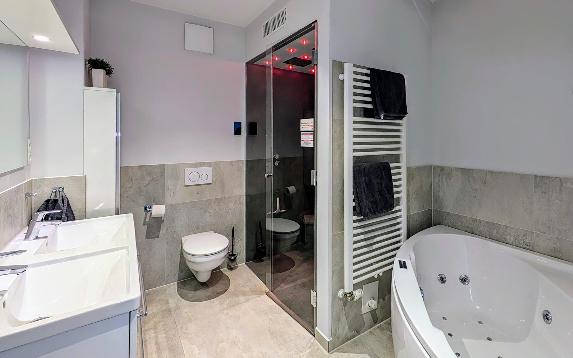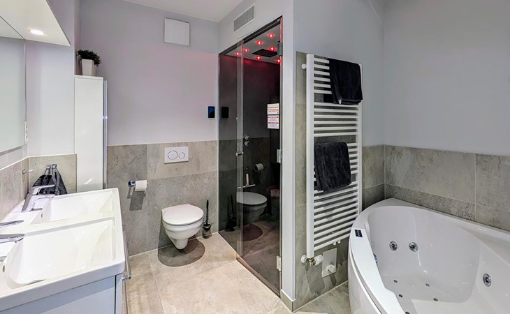 De vakantiewoning op de 1e verdieping heeft drie slaapkamers, elk met een flatscreentelevisie. Een filterkoffiezetapparaat, een handfilter of een Nespresso-apparaat (breng je eigen capsules mee) zijn beschikbaar voor je koffie. Je persoonlijke wellnessruimte bestaat uit een badkamer met dubbele regendouche, stoombad en bubbelbad. In de 2e badkamer kun je ontspannen in de sauna.