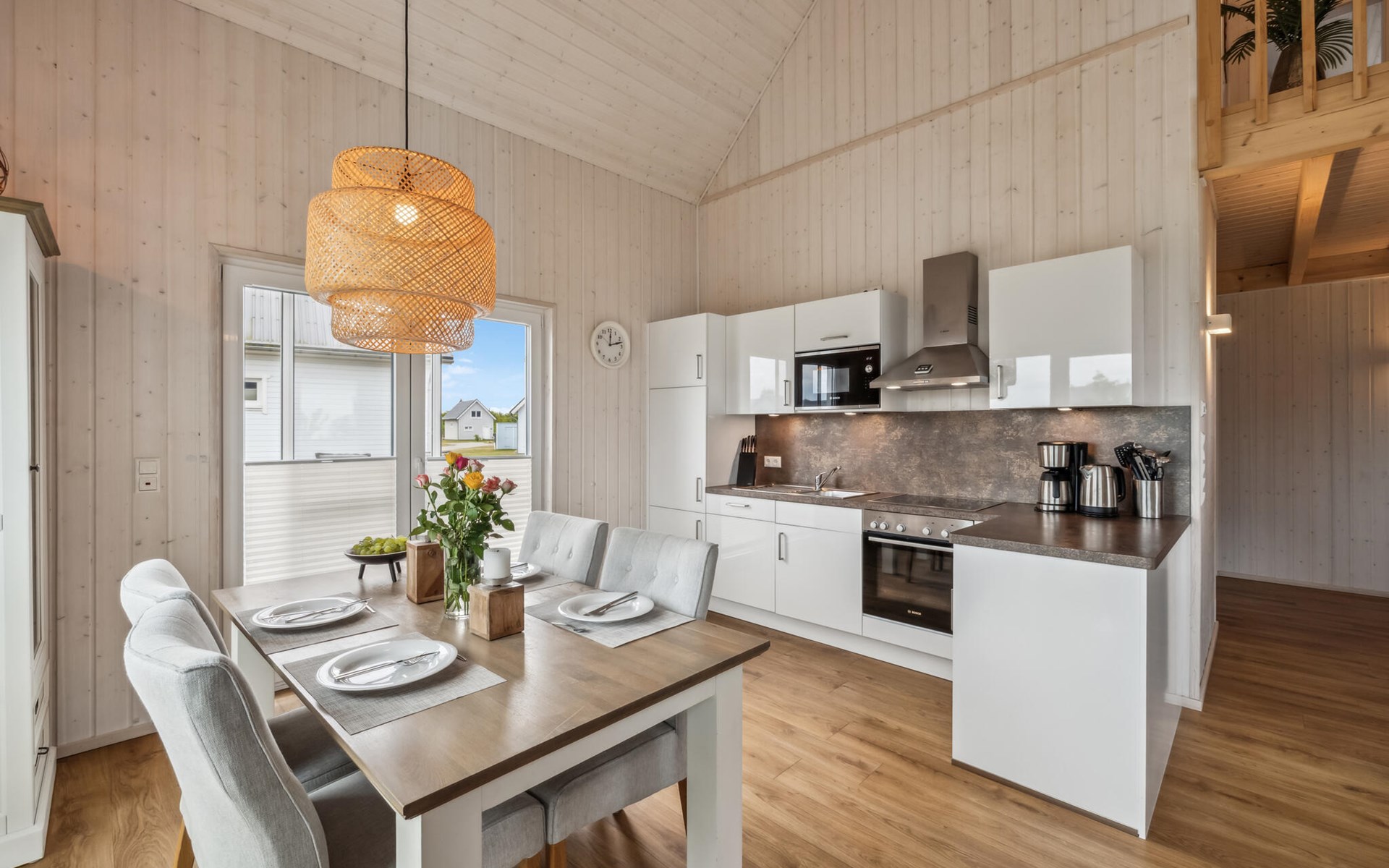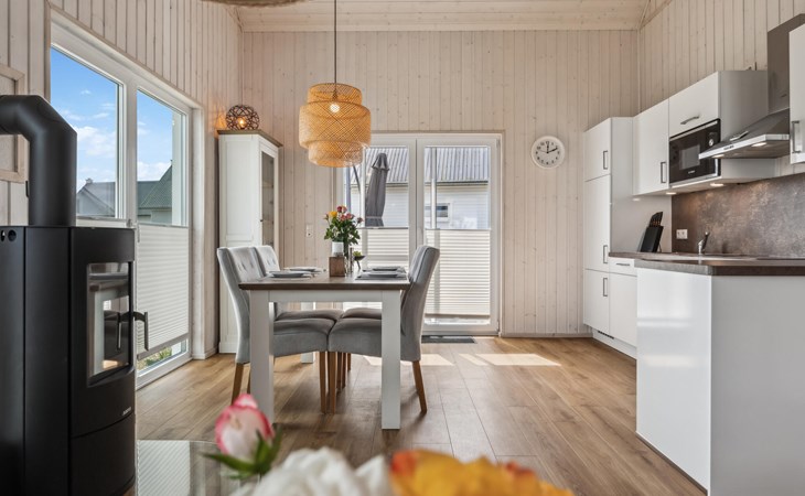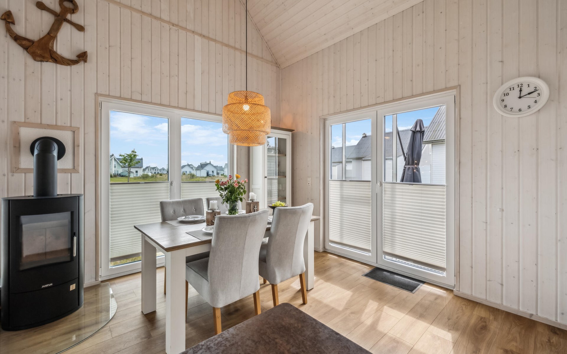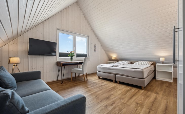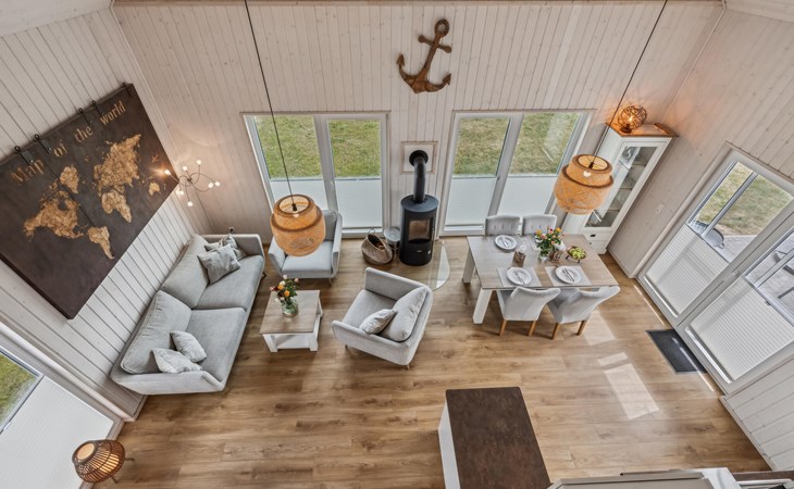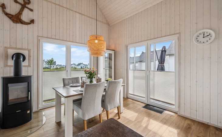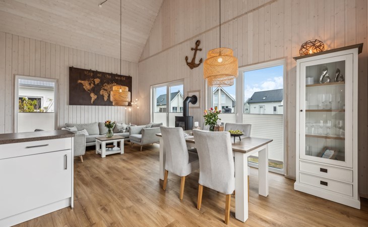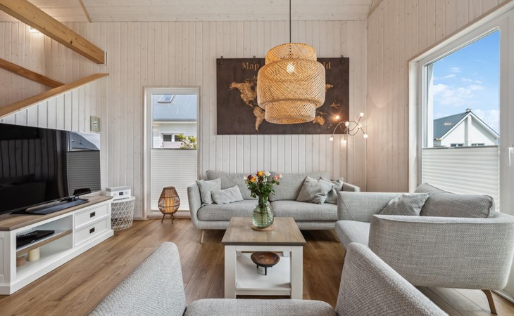 De hoge plafonds en de grote panoramische ramen zorgen voor veel licht en een heerlijk ruimtelijk woongevoel. De inrichting is modern en in lichte kleuren gehouden, zodat u zich hier tijdens uw vakantie aan de Oostzee bijzonder prettig zult voelen.