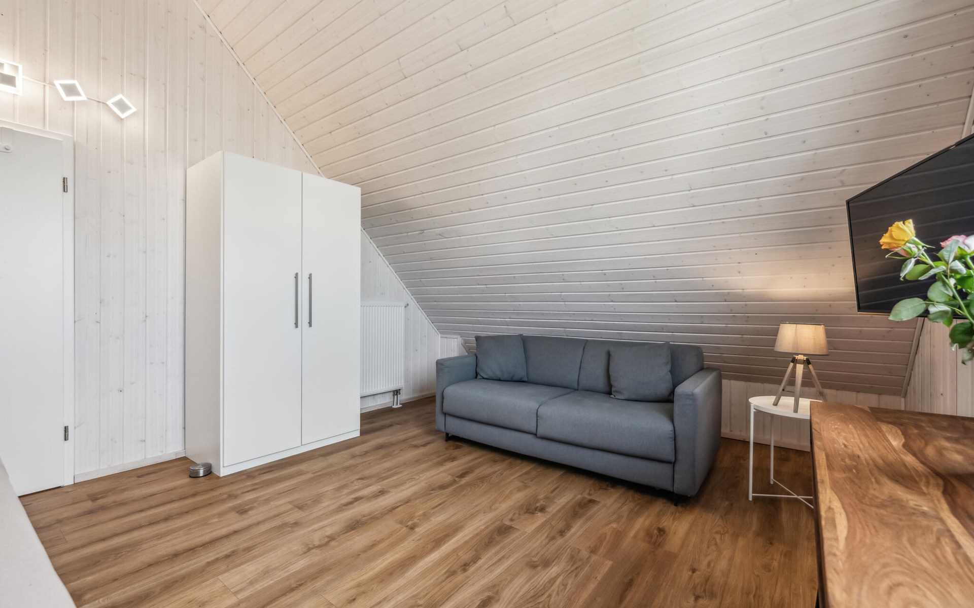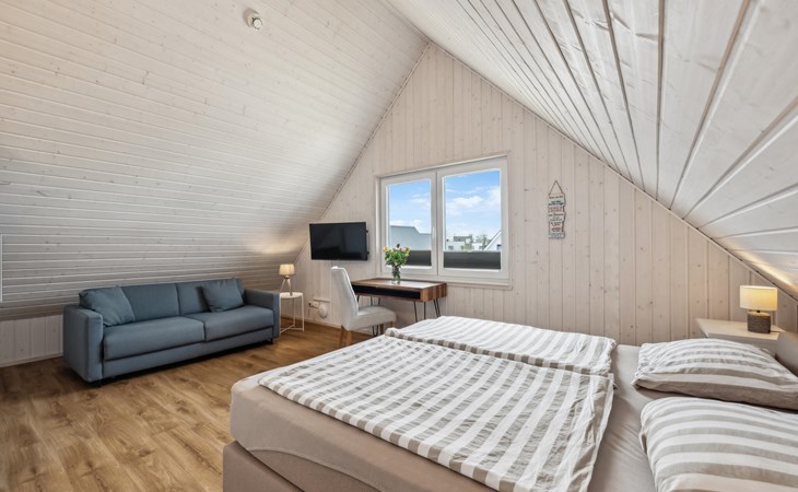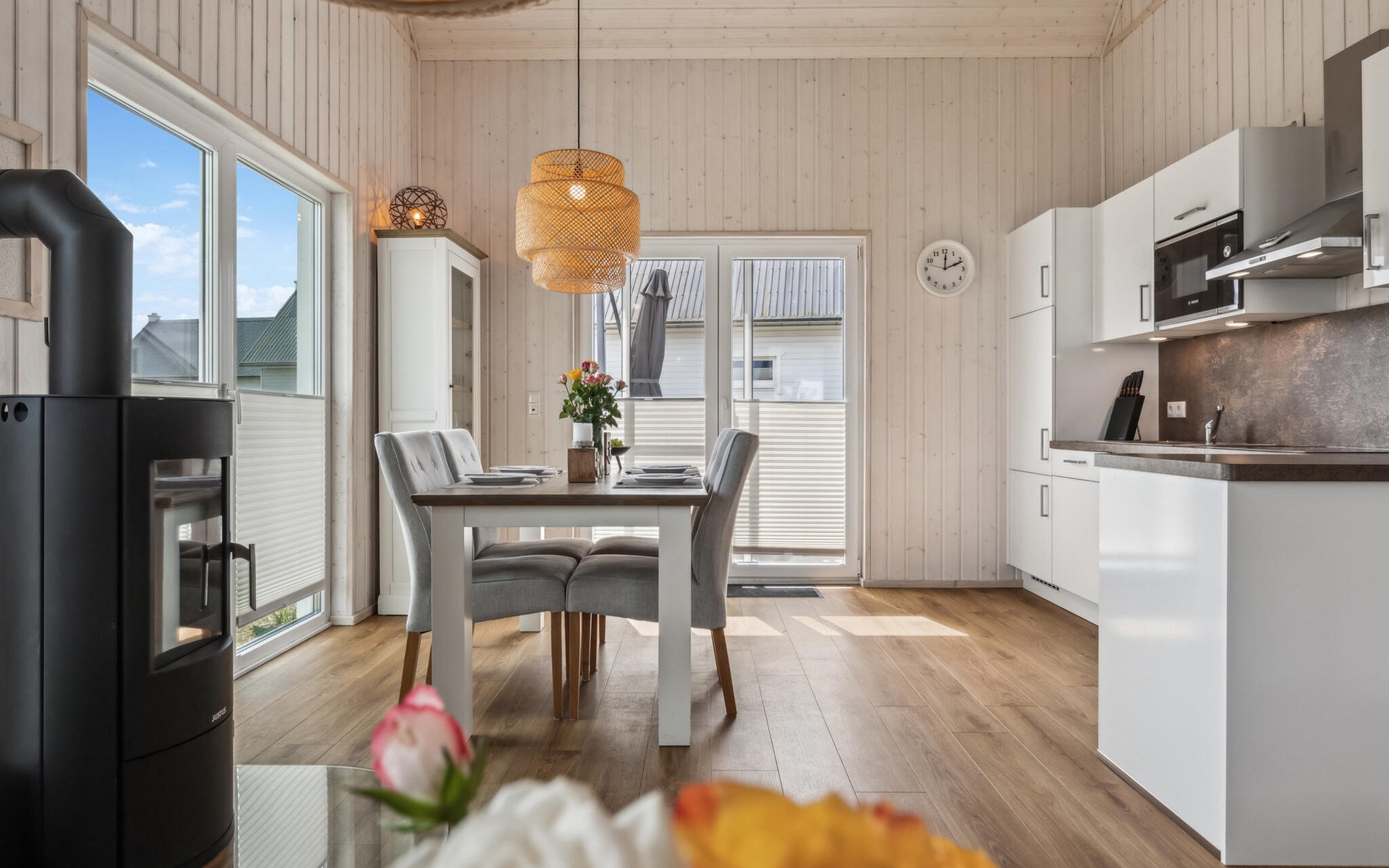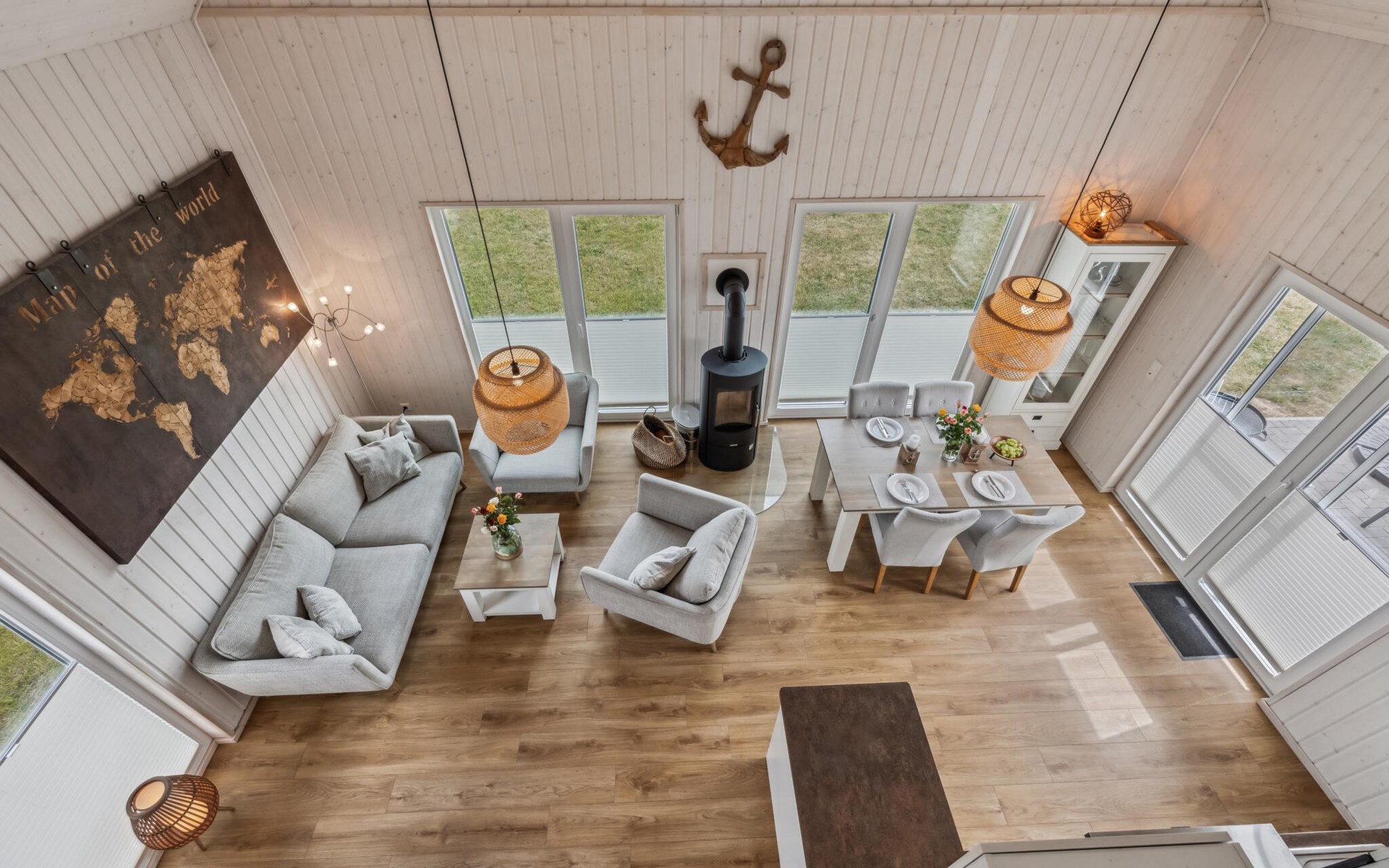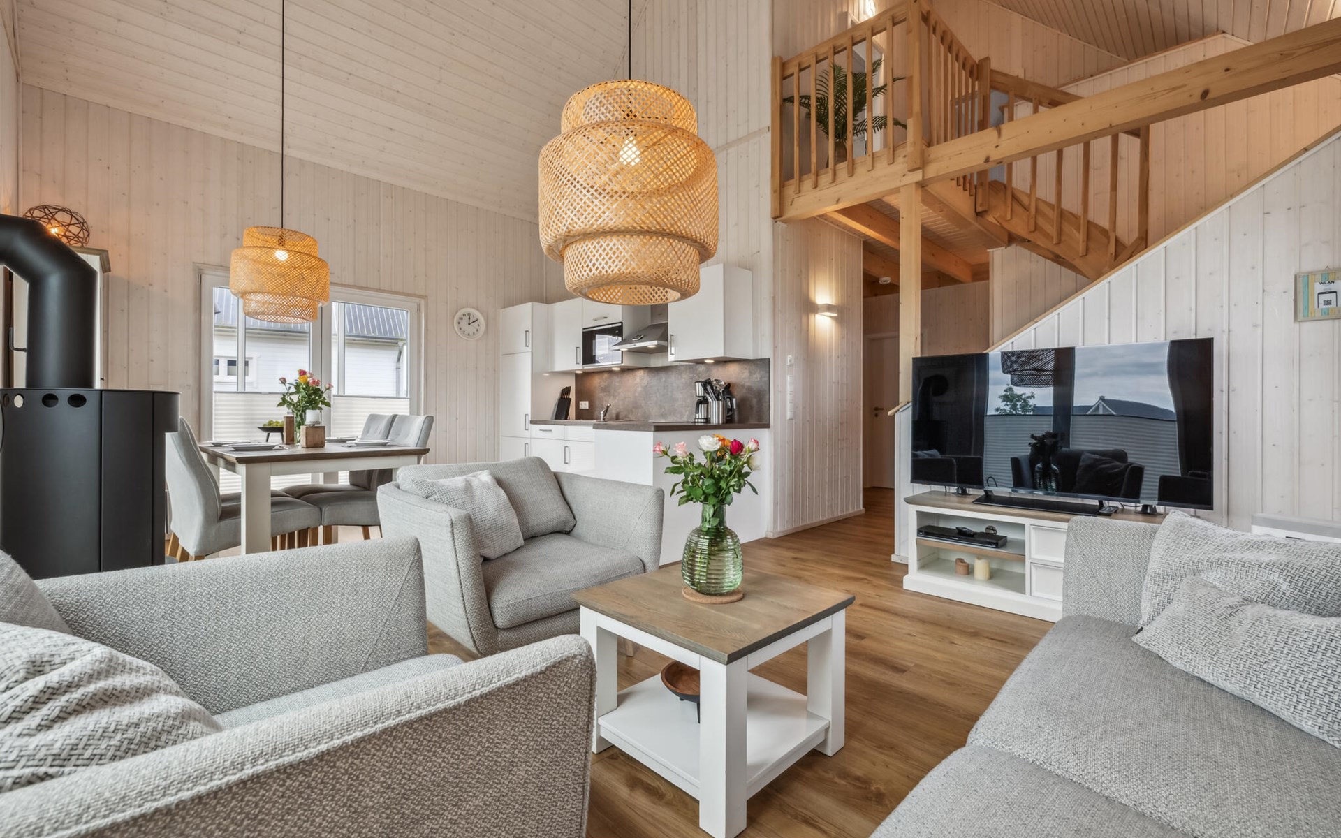 De hoge plafonds en de grote panoramische ramen zorgen voor veel licht en een heerlijk ruimtelijk woongevoel. De inrichting is modern en in lichte kleuren gehouden, zodat u zich hier tijdens uw vakantie aan de Oostzee bijzonder prettig zult voelen.