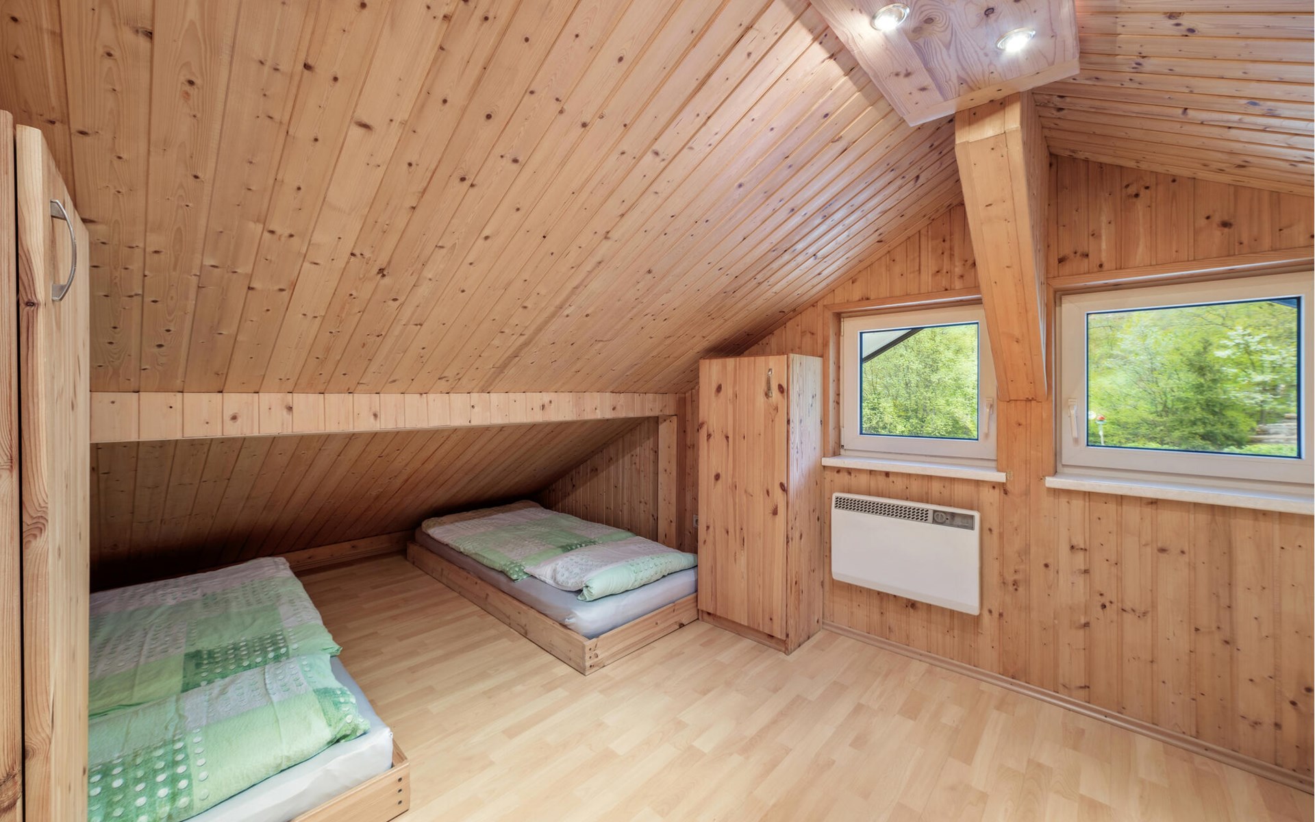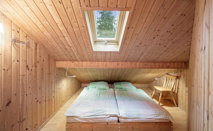 Dit gezellige en comfortabel ingerichte vakantiehuis ligt aan de rand van het bos op een ongestoorde locatie. Direct voor de deur heeft u een kleine natuurlijke vijver voor een verfrissend bad, bijvoorbeeld na een saunasessie. Voor gezellige uurtjes is er een open haard in de woonkamer. De zolderombouw met slaapkamers 2 en 3 en de sauna hebben een lage plafondhoogte en hellingen.