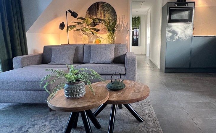 De comfortabele woonkamer met hoog plafond geeft aan alle kanten zicht op de heerlijke tuin en het buitenleven vol met twitterende vogels. In de open design keuken met eethoek geniet u van smaakvolle diners. In de koudere maanden zorgt de haardkachel voor gezellige warme avonden. In het zitgedeelte bevindt zich een nieuwe geriefelijke zitbank (december 2025). Via de 2 sets met dubbele openslaande deuren (1 voorzien van hordeuren) stapt u zo vanuit keuken en woonkamer de terrassen op en de tuin in. In deze gelijkvloerse woning bevinden zich tevens 1 ruime master slaapkamer met hoog plafond met dubbele openslaande deuren voorzien van hordeuren. Deze grote slaapkamer heeft een deurketting zodat de deur in de nacht open kan blijven en u 's morgens ontwaakt met de geur van bos en het gefluit van de vogeltjes. U loopt zo het beschutte terras op om te genieten van de ochtendzon. Verder is er een 2e kleinere slaapkamer. Beide slaapkamers hebben 2 bedden (koppelbaar, ‘klikken’ aan elkaar) en zijn voorzien van luxe toppers. De badkamer heeft een inloopdouche en wastafelmeubel en er is een apart toilet.