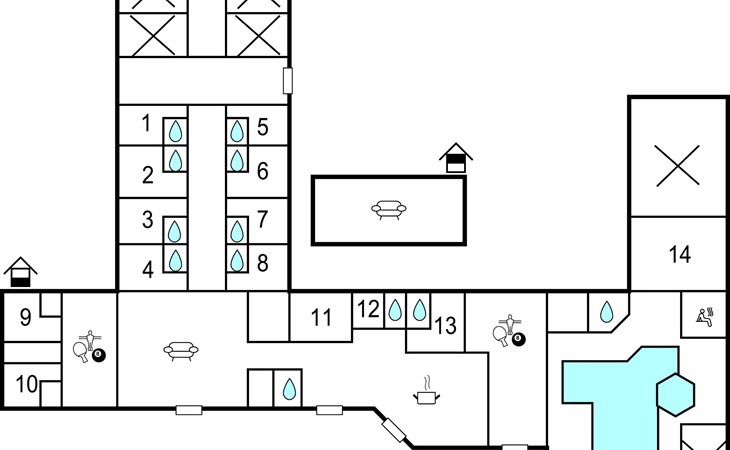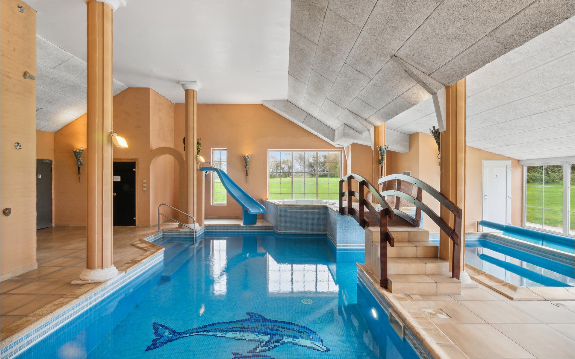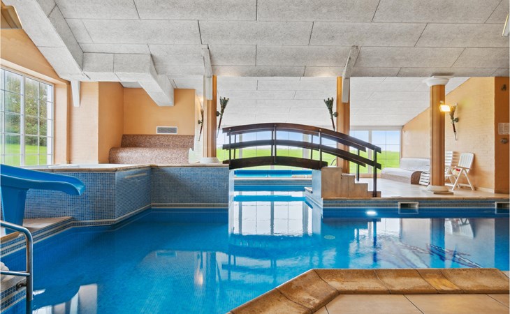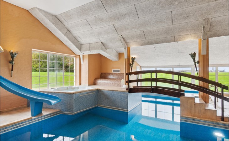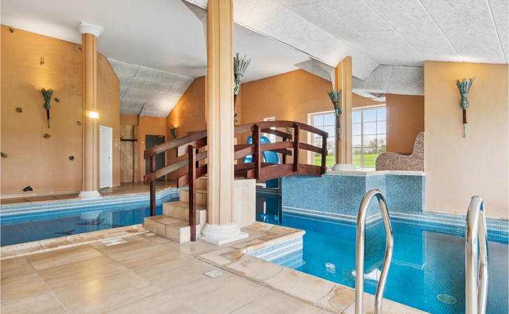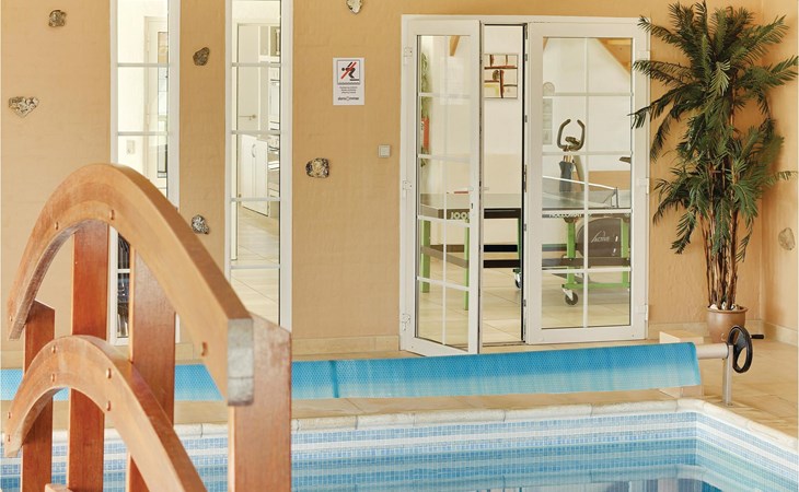 Het zwembad van 165 m2 is gemodelleerd naar Romeinse thermale baden. De hal is versierd met klinkers en natuursteen in zachte natuurlijke kleuren, en het zwembad van 50 m² wordt omringd door imposante zuilen en flikkerende fakkels op de muren. De sauna en het solarium bieden ook ontspanning en gezelligheid na het zwemmen.