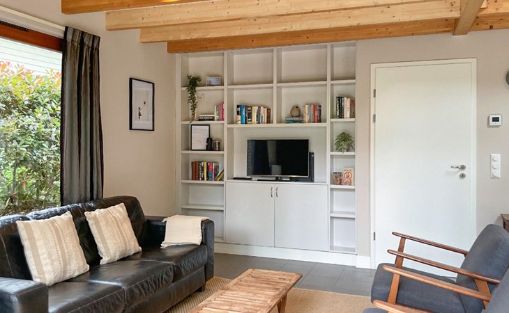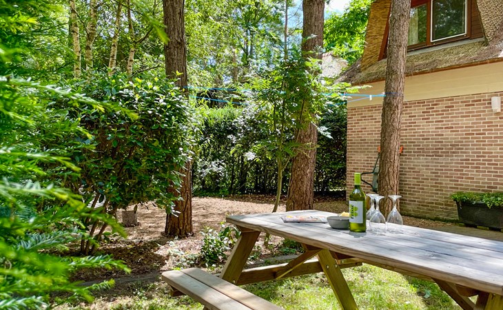Stap door de grote schuifdeuren direct op het terras en geniet van de liefdevol aangelegde tuin. Luister naar de geluiden van het bos, kijk naar roodborstjes en eekhoorns of ontspan met een goed boek in de buitenlucht. Het vakantiepark heeft ook een speeltuin, visvijvers en een zwemmeer met zandstrand, ideaal voor warme zomerdagen.