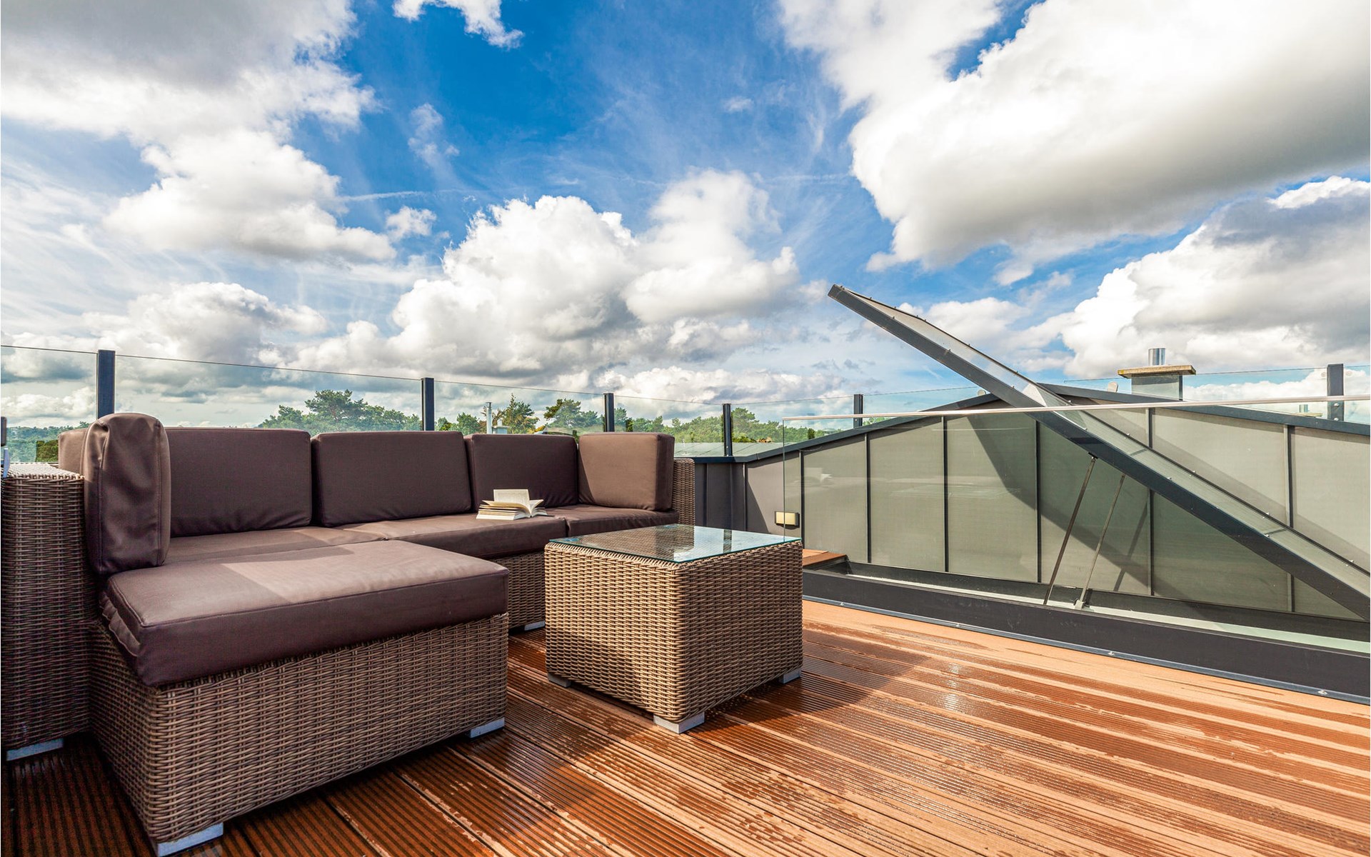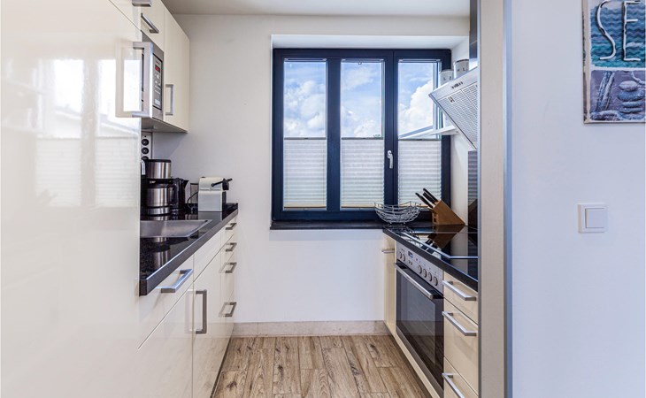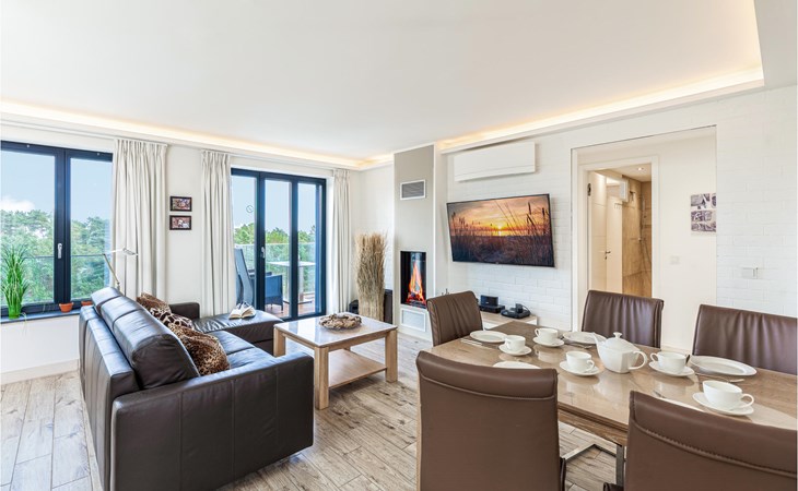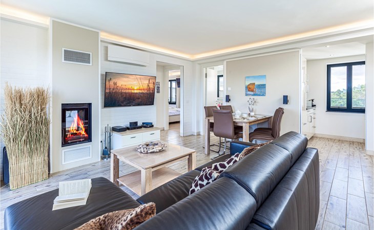 Dit luxueuze penthouse met dakterras is zonder twijfel het pronkstuk van de "Prora Solitaire". Vanuit het lichtovergoten woongedeelte met panoramische ramen op de 5e verdieping van het monumentale pand kun je al genieten van een adembenemend, onbelemmerd uitzicht over de Baltische Zee. De houtkachel zorgt voor een bijzonder gezellige sfeer in het appartement. Dankzij het ingenieuze ontwerp kun je zowel in de woonkamer als in de slaapkamer genieten van de speciale sfeer die de vlammen in de kamers oproepen.