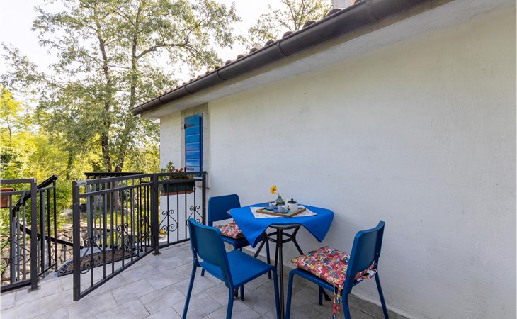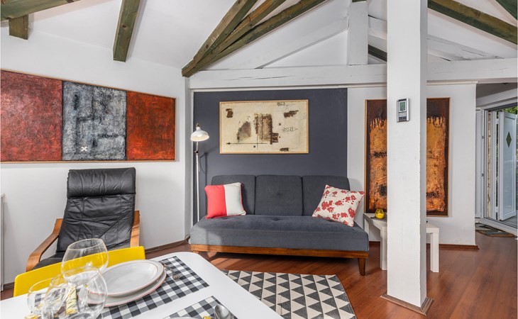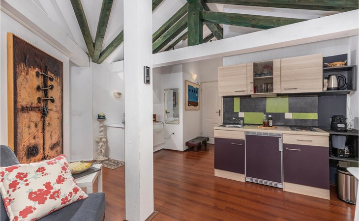 Dit mooie vakantiehuis ligt op de 1e verdieping van een gebouw met mooie terrassen en buitenruimtes. Binnen vind je een modern interieur en de zichtbare houten balken in het plafond geven een gezellige sfeer. Er zijn nog 2 slaapplaatsen in het woongedeelte. Er is ook 1 badkamer.