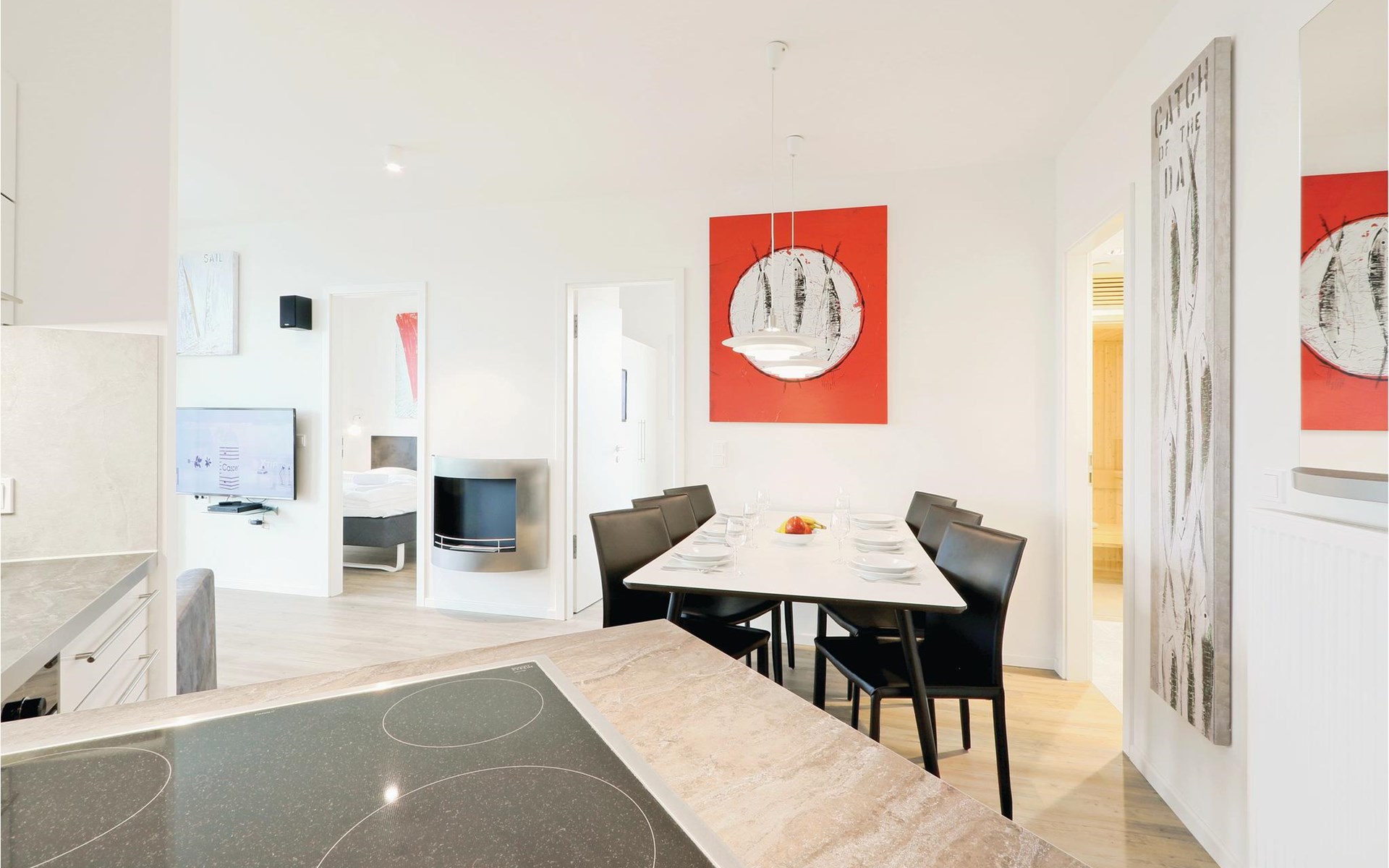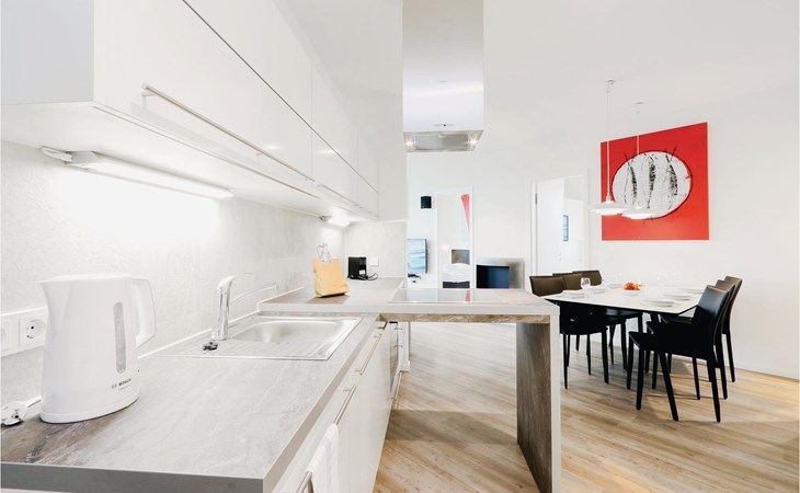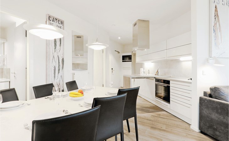 Het moderne entertainmentsysteem met Blu-Ray speler, muziekinstallatie met MP3 aansluiting en 4 flatscreen TV's zorgt voor voldoende entertainment. Alle kamers zijn ingericht in Scandinavische stijl en zijn licht en overspoeld met licht dankzij de ramen van vloer tot plafond. De moderne kitchenette biedt voldoende ruimte om te koken en is uitgerust met hoogwaardige merkapparatuur. Liefhebbers van geuren vinden hier een Nespresso-apparaat (breng uw eigen capsules mee), evenals een thermosfles en een handfilter om thuis te zetten, voor het geval u toch de voorkeur geeft aan de klassieke filterkoffie.