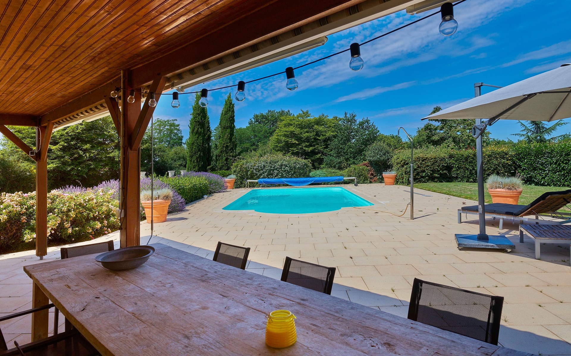 Uitzonderlijk mooie villa (170m²) met wifi voor 8 personen op een enorm terrein, voorzien van veel luxe, comfort en een schitterend groot privé zwembad. Bij aankomst gaat u langs een smeedijzeren hekwerk de oprijlaan op naar de villa. In de ruime woonkamer is een comfortabele zithoek met flat-screen TV en internationale Canal Digital zenders waar u heerlijk kunt relaxen. Vanuit de living heeft u uitzicht over de tuin die tientallen meters breed en diep is. Aangrenzend aan de living is een volledig uitgeruste keuken met o.a. kookplaat, vaatwasser, oven, magnetron en koffiezetter. In de bijkeuken staat de wasmachine, wasdroger en een extra grote koel-vries combinatie. De vier slaapkamers hebben twee comfortabele boxspring bedden. Er zijn drie badkamers: een met bad, douche, wastafel en toilet, een met douche, wastafel en toilet en een met douche en wastafel. Daarnaast is er nog een apart toilet. De terrasdeuren geven toegang tot een heerlijk en ruim overdekt terras met gerieflijke tuinstoelen. In de tuin zijn verschillende terrassen zodat u een plek kunt kiezen in de zon of juist in de schaduw. De grote tuin is voor kinderen een fantastische speelplek. Een geweldig zwembad met zonneterras en ligbedden is beschikbaar voor u. Het zwembad is geopend van de vierde week in april tot de vierde week van september en is verwarmbaar. U kunt dit als betaalde voorkeur bij uw boeking doorgeven. Diverse villa's hebben een oplaadpunt om elektrische auto's op te laden. Indien dat het geval is kunt u dit als optioneel artikel bijboeken. Het betreft een standaard stopcontact net als alle andere stopcontacten in het huis. U dient evt. zelf een verloopstekker mee te nemen.