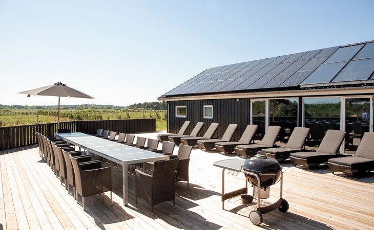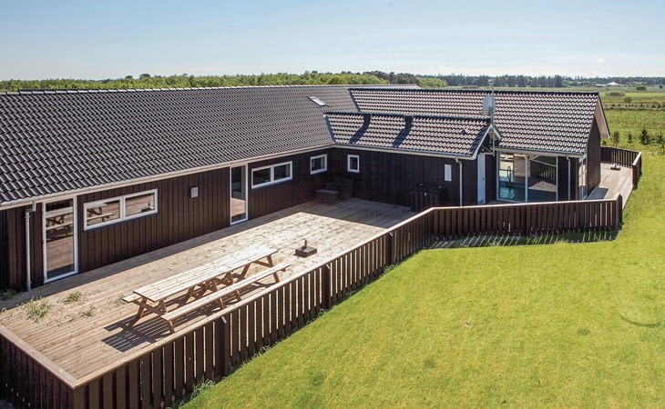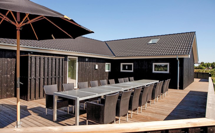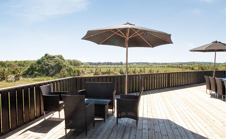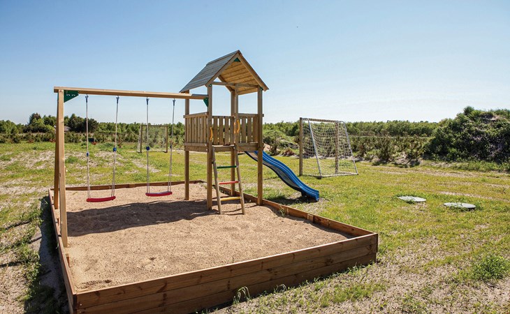 Vanuit de ruime woonkamer heb je direct toegang tot het grote houten terras van het vakantiehuis. Kijk hoe je kinderen spelen in de zandbak of op de schommels en speeltoren en serveer heerlijke barbecues in de buitenlucht.