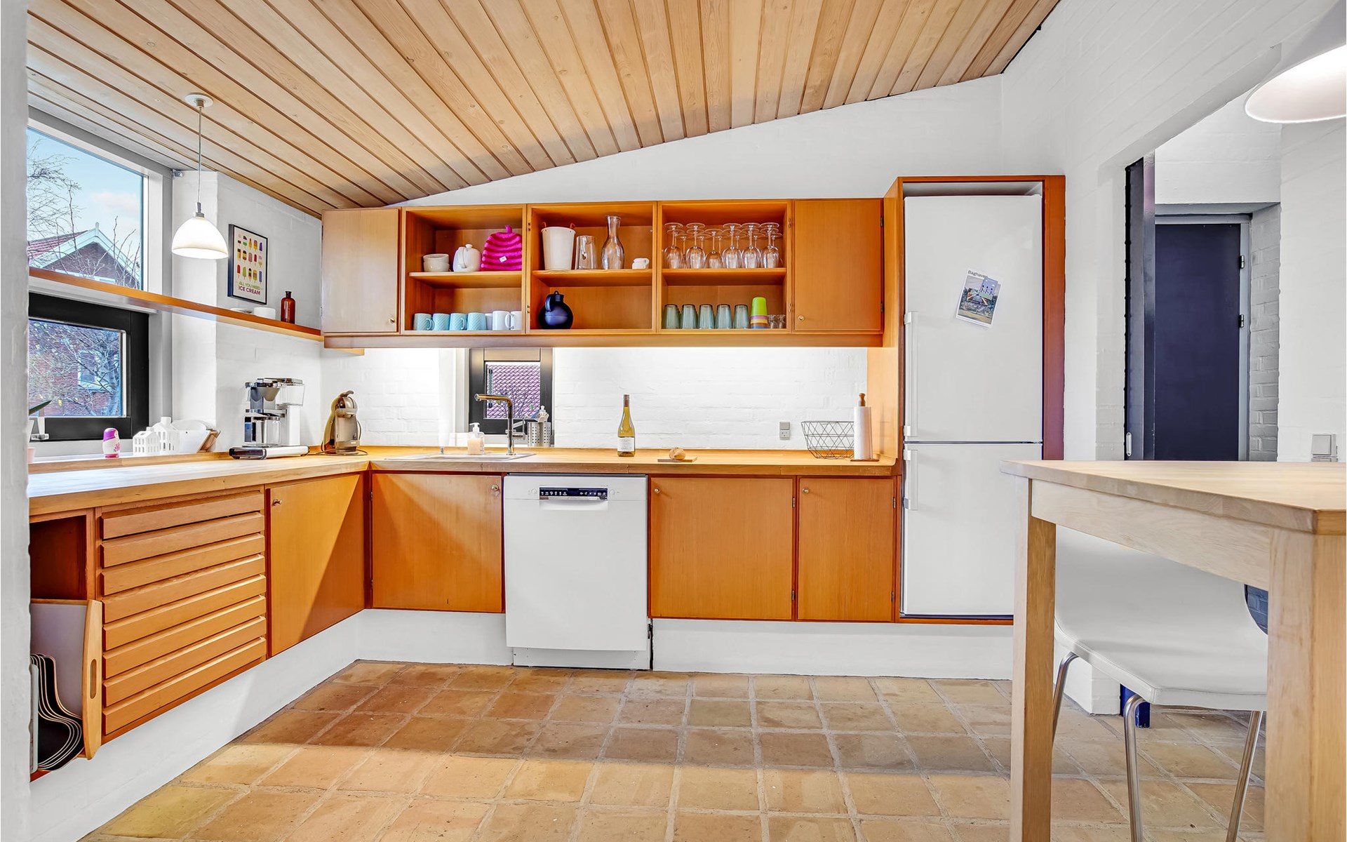 Dit huis maakt een zeer mooie indruk met zijn vele goede faciliteiten, en de vele raampartijen en de ruimte die helemaal open is tot aan de gevel zorgen voor een lichte, aangename sfeer. Bereid uw lekkernijen in de ruime en goed uitgeruste keuken en geniet samen met uw familie of vrienden van de maaltijden aan de eettafel. De lichte serre met zijn grote raampartijen is ook op koelere dagen een heerlijke plek voor rust en ontspanning. Leg uw voeten omhoog in de winter terwijl u zich verwarmt bij de open haard. In de zomer kunt u zich terugtrekken op het open terras en op zomeravonden barbecueën.