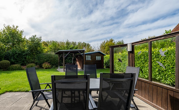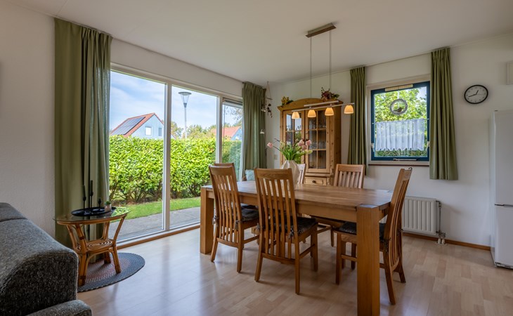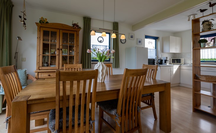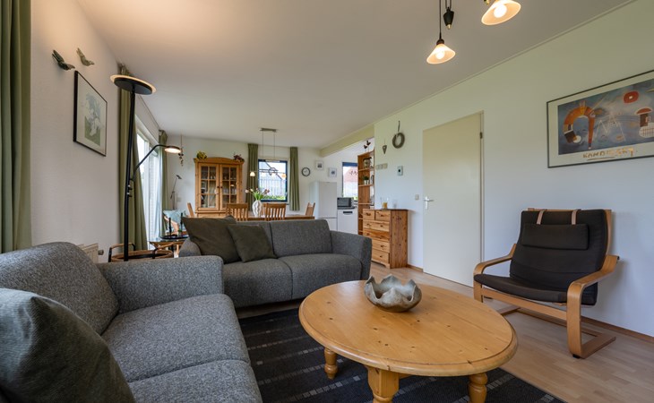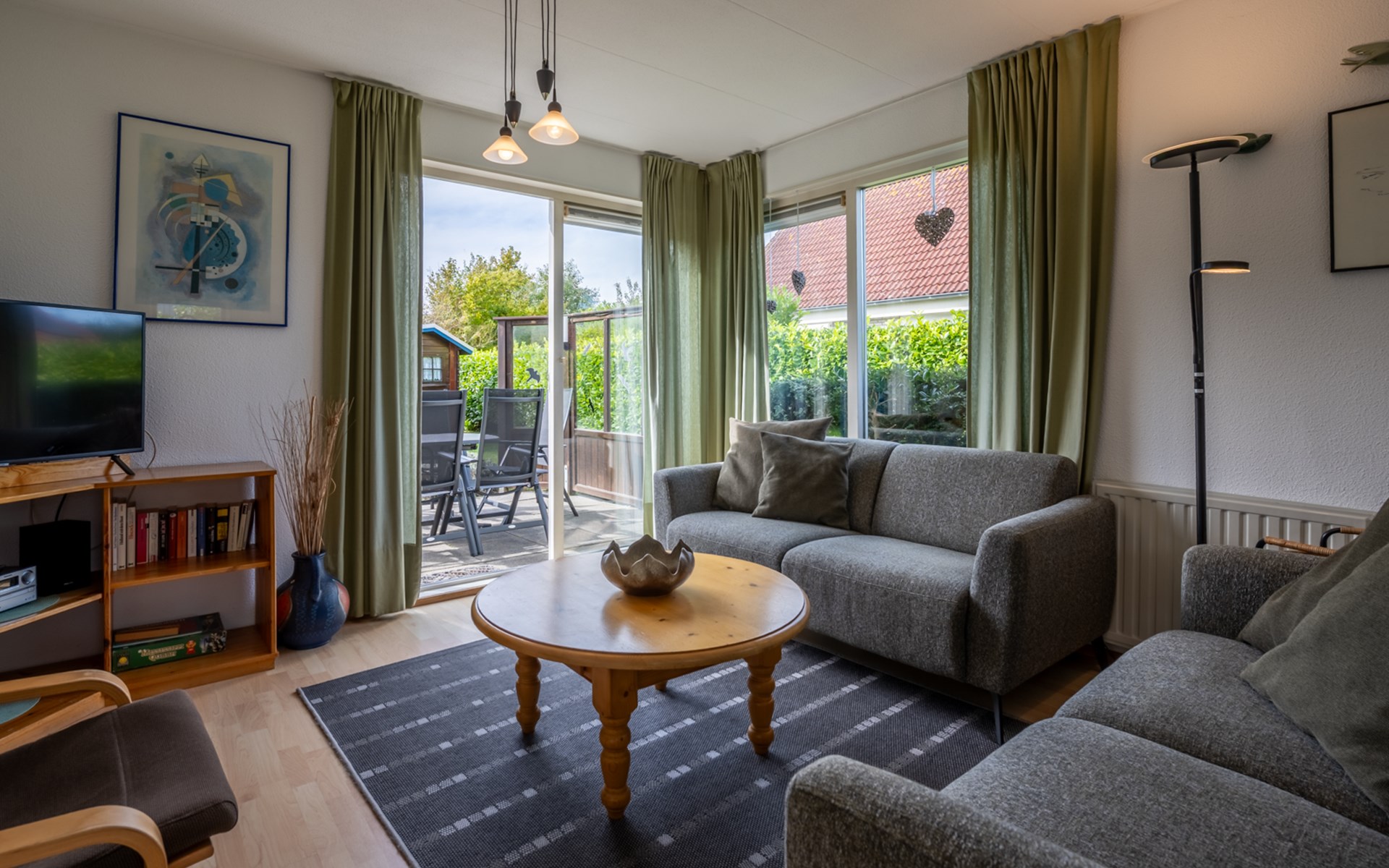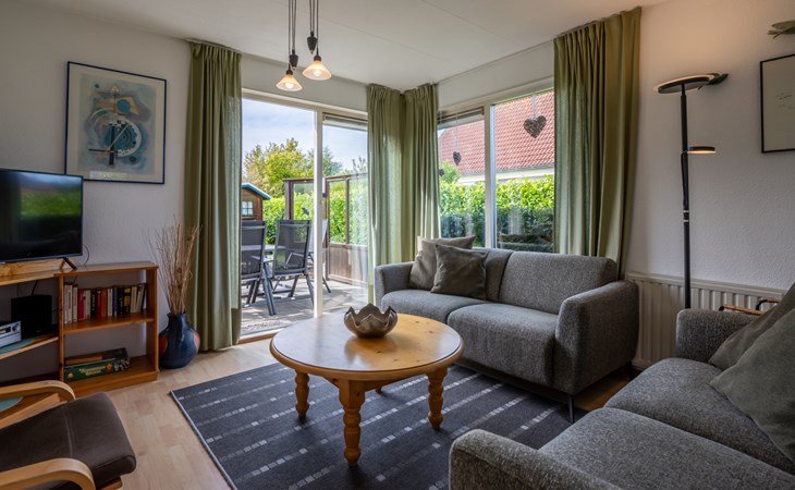 De woonkamer met open keuken is comfortabel en gezellig ingericht. Een tuindeur geeft toegang tot de dichtbegroeide beschutte tuin en het terras met comfortabele tuinmeubelen. In de woonkamer vindt u een zithoek met een flatscreen televisie.
