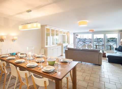 De woonkamer is heerlijk licht door de vele raampartijen. Vanuit de woonkamer heeft u toegang naar het terras en de beschutte tuin met veel privacy en comfortabele tuinmeubelen. In de woonkamer vindt u een zithoek met sfeervolle open haard en flatscreen TV met digitale televisie en extra buitenlandse zenders, DVD speler en iPod Dockingstation. Vanuit de woonkamer komt u in de open keuken met eetgedeelte. Deze is volledig uitgerust met o.a. een magnetron, vaatwasser, twee koelkasten en Nespresso koffiemachine.