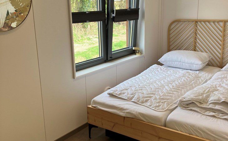 Er zijn twee slaapkamers. Een kamer met een twee-persoonsbed (2 matrassen van 90x200 cm) en een kamer met een stapelbad (2 matrassen van 90 x 200 cm). Er is in beide kamers een kledingkast.