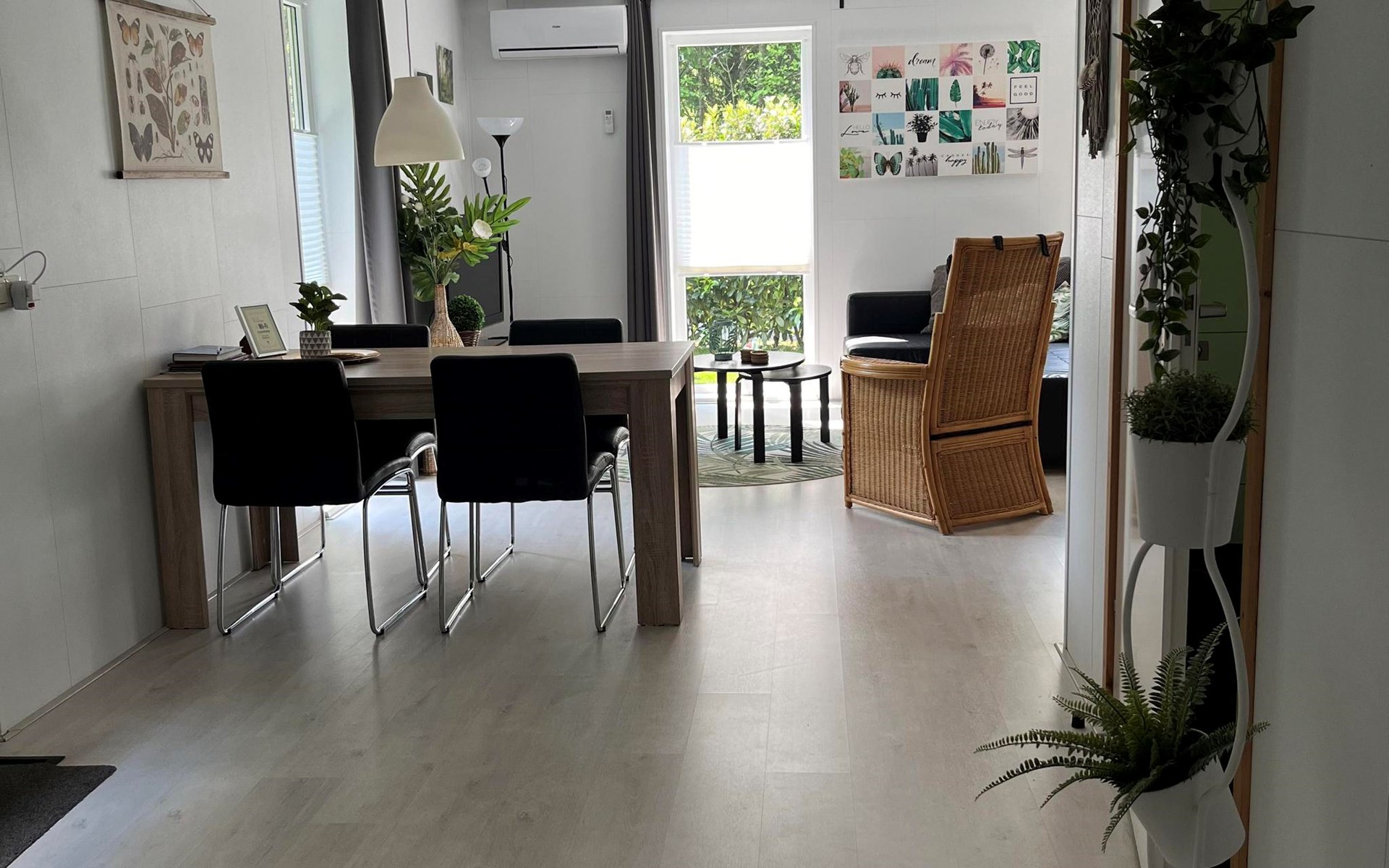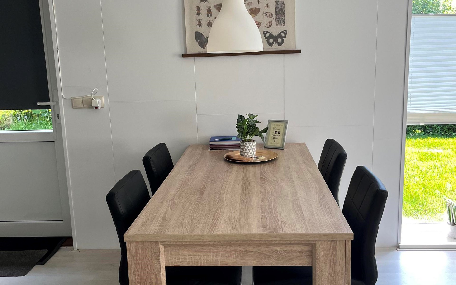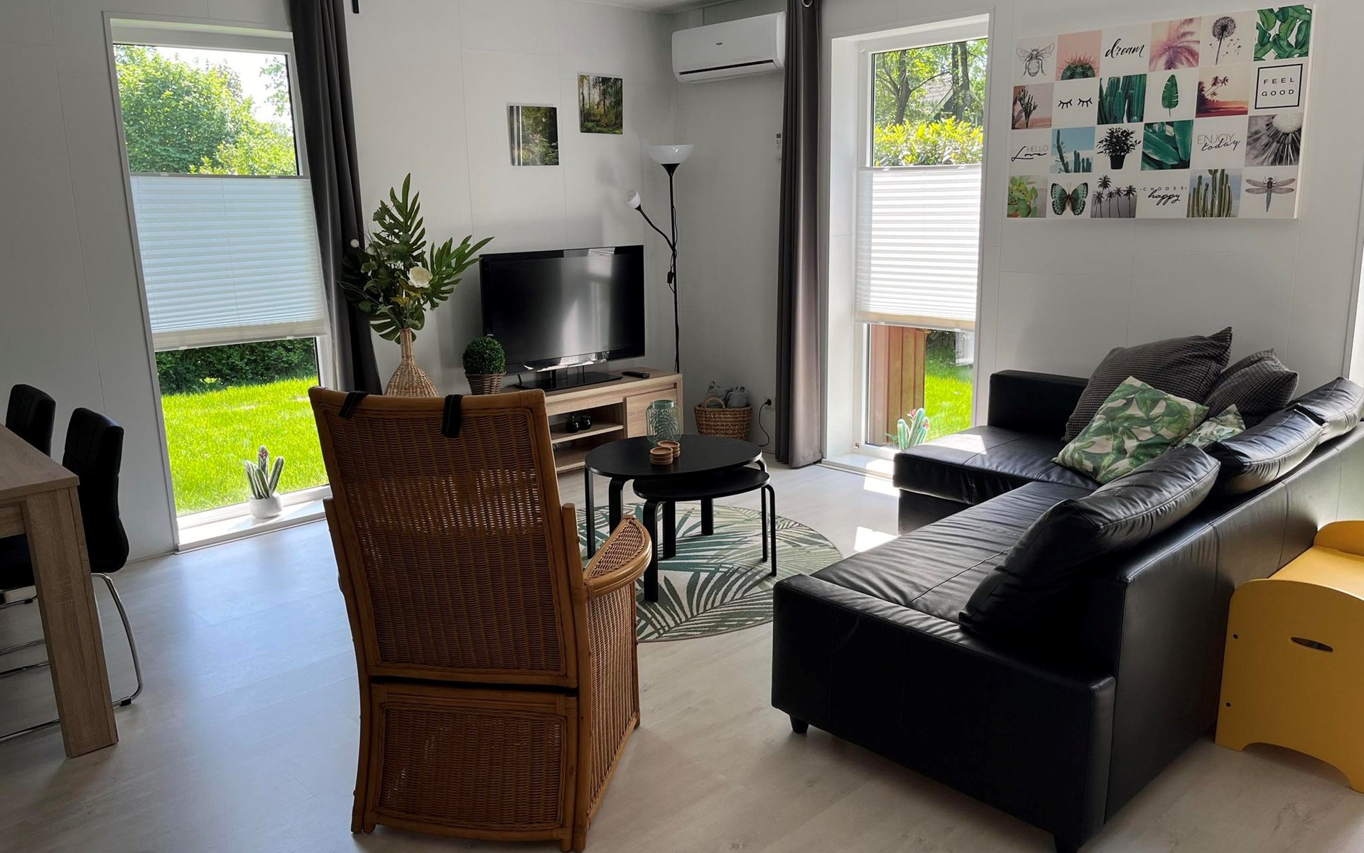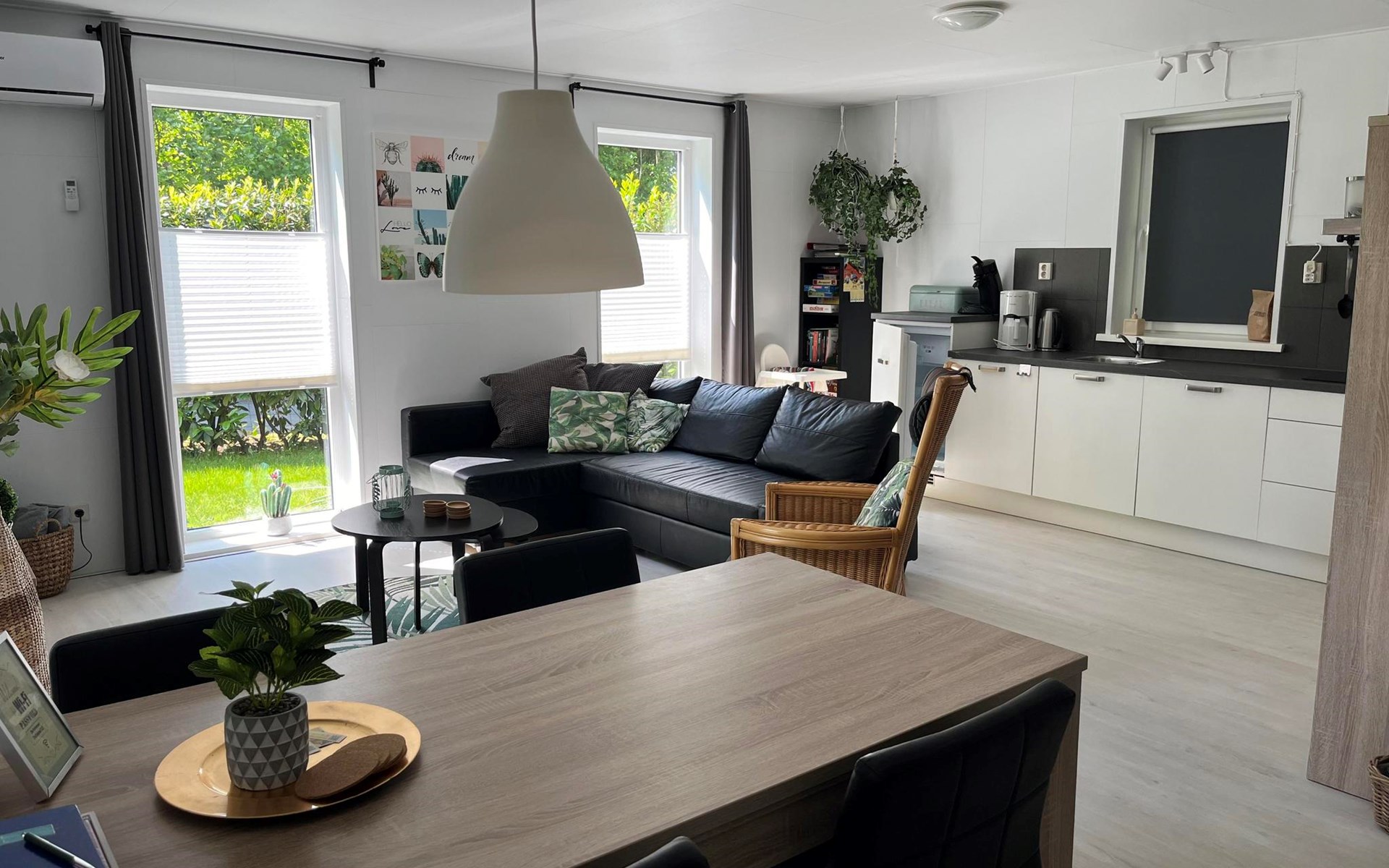 De bungalow biedt het ultieme comfort dat je mag verwachten, met een ruime woonkamer en een open keuken. De keuken is voorzien van een magnetron, koelkast, 4-pits inductie-kookplaat, vaatwasser, koffie(filter)- en senseo-apparaat en een waterkoker. De inrichting is zeer compleet, inclusief een ruime 4-persoons bank, eethoek, groot tv-scherm en tal van accessoires die zorgen voor een aangenaam verblijf. Uiteraard is er gratis wifi en een parkeerplaats naast de bungalow voor uw auto. Op het zonnige overkapte terras vind je een tafel met 4 stoelen.
