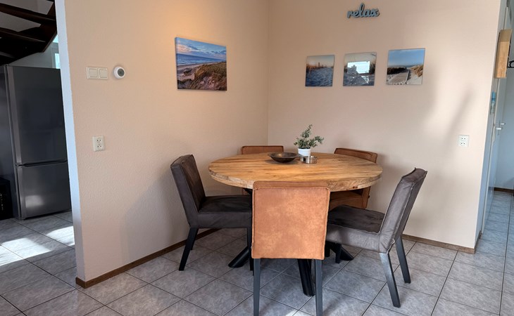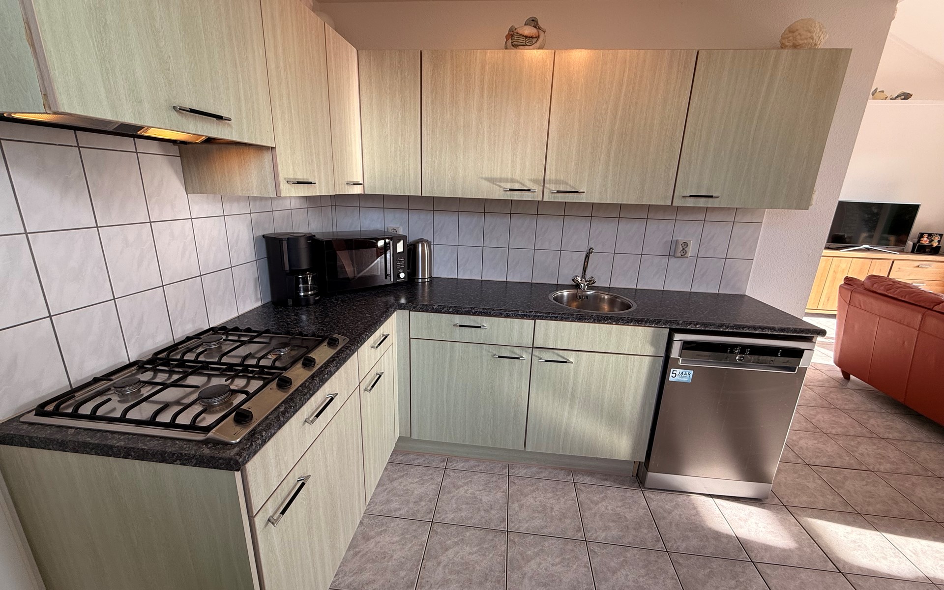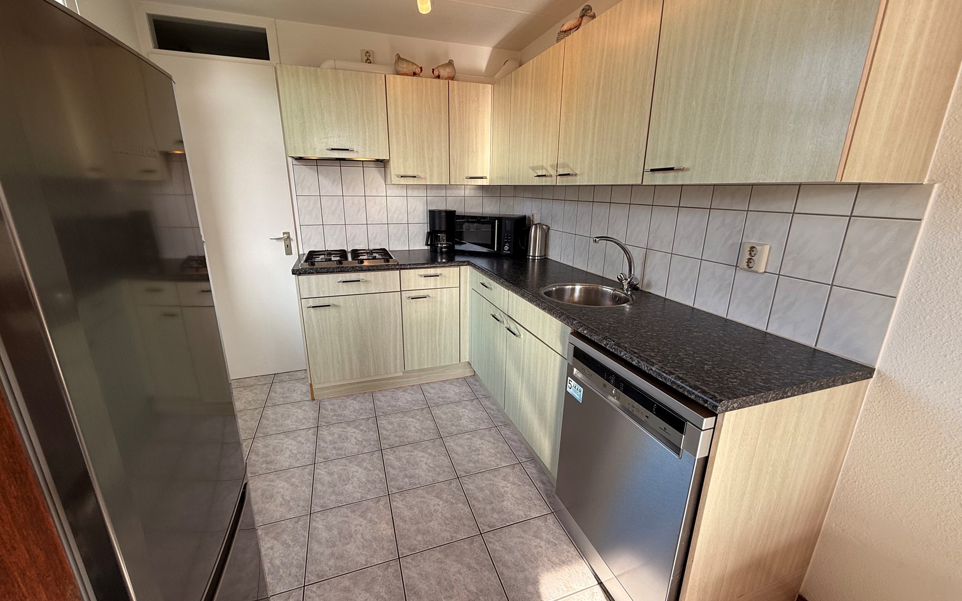 De open keuken is compleet uitgerust met onder andere een combimagnetron, vaatwasser, gaskookplaat, koelkast met vriesvak, koffiezetapparaat, waterkoker en broodrooster.