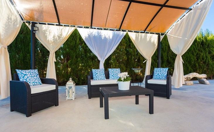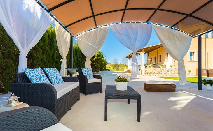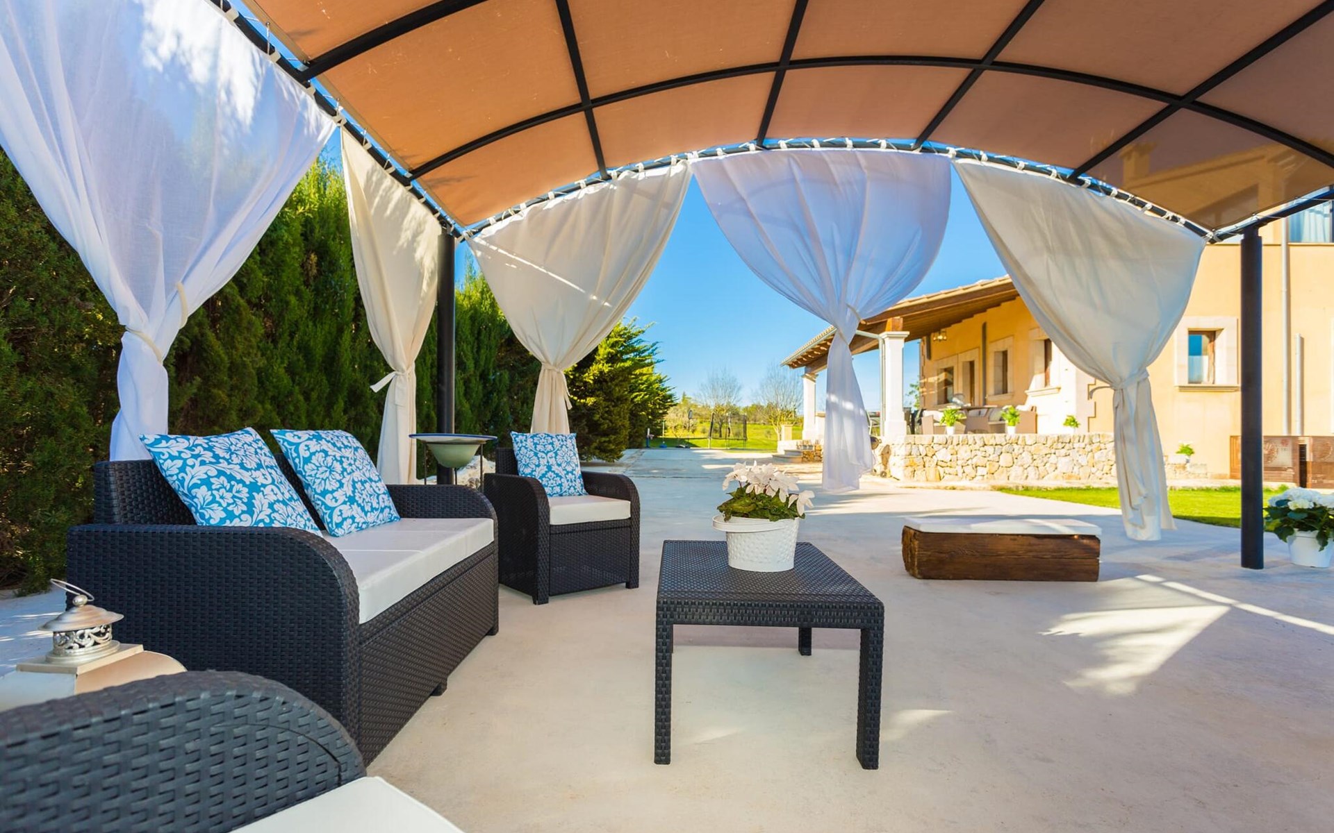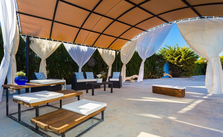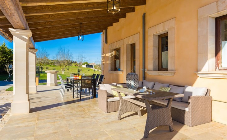 Game, set and match: Voor gasten met een dorst naar beweging biedt het landgoed omringd door weiden en velden genoeg ruimte en apparatuur om te basketballen of voetballen of op de trampoline te springen en misschien zelfs de kans te krijgen om naar de wedstrijd te kijken - tennissers in de dop: de Rafa Nadal Tennis Academy ligt om de hoek. Je kunt snel het zweet afspoelen onder de buitendouche of in het buitenzwembad voordat je naar het zwembad gaat voor nog een verfrissende duik. Je deelt het uitzicht op de bergen met je buurman, maar verder is er genoeg ruimte en privacy voor iedereen. Halfhoge heggen vormen een natuurlijke grensafscheiding (er is ook een alarmsysteem met camera's). De lange oprijlaan leidt naar de buitentrap van je Villa Llum, waar je wordt begroet door twee marmeren engelen die klaar staan om je te overladen met een overvloed aan voorzieningen. Je zult op het eerste gezicht verliefd worden op het luchtige zwembadpaviljoen, want het biedt je privacy en bescherming tegen de wind en de zon, zowel overdekt als onoverdekt; het is ook fijn om onder de pilaren bij het huis op de rieten bank of aan tafel te zitten, in alle rust te ontbijten, van een barbecue te genieten of de hoogtepunten van een stranddag door te nemen. Het onbeveiligde, licht verhoogde terras is niet geschikt voor kleine kinderen.