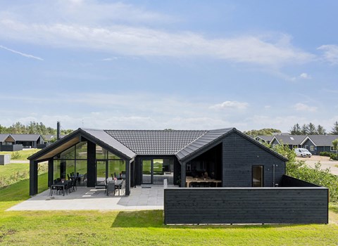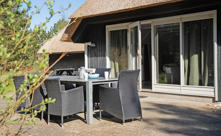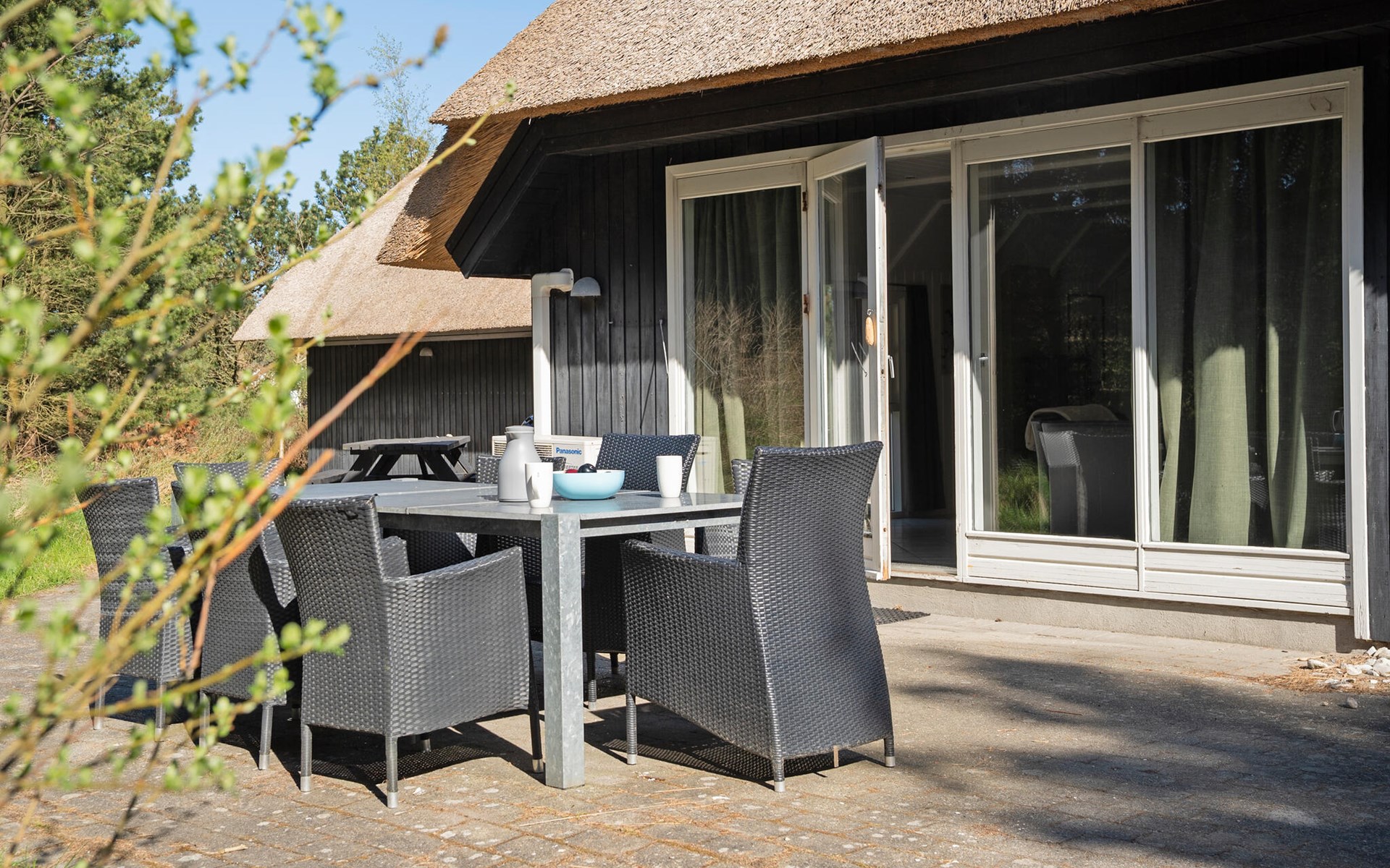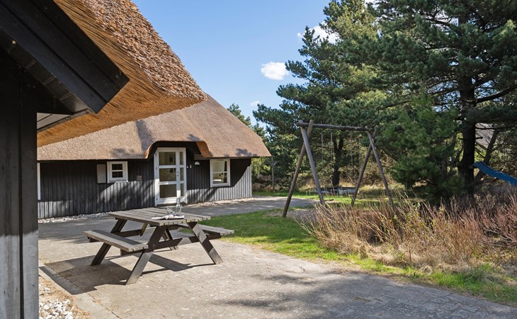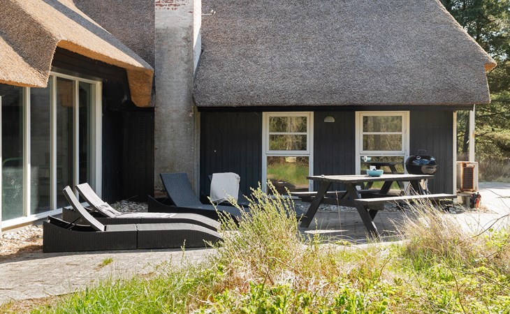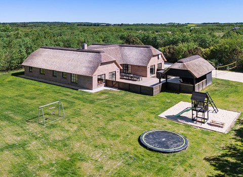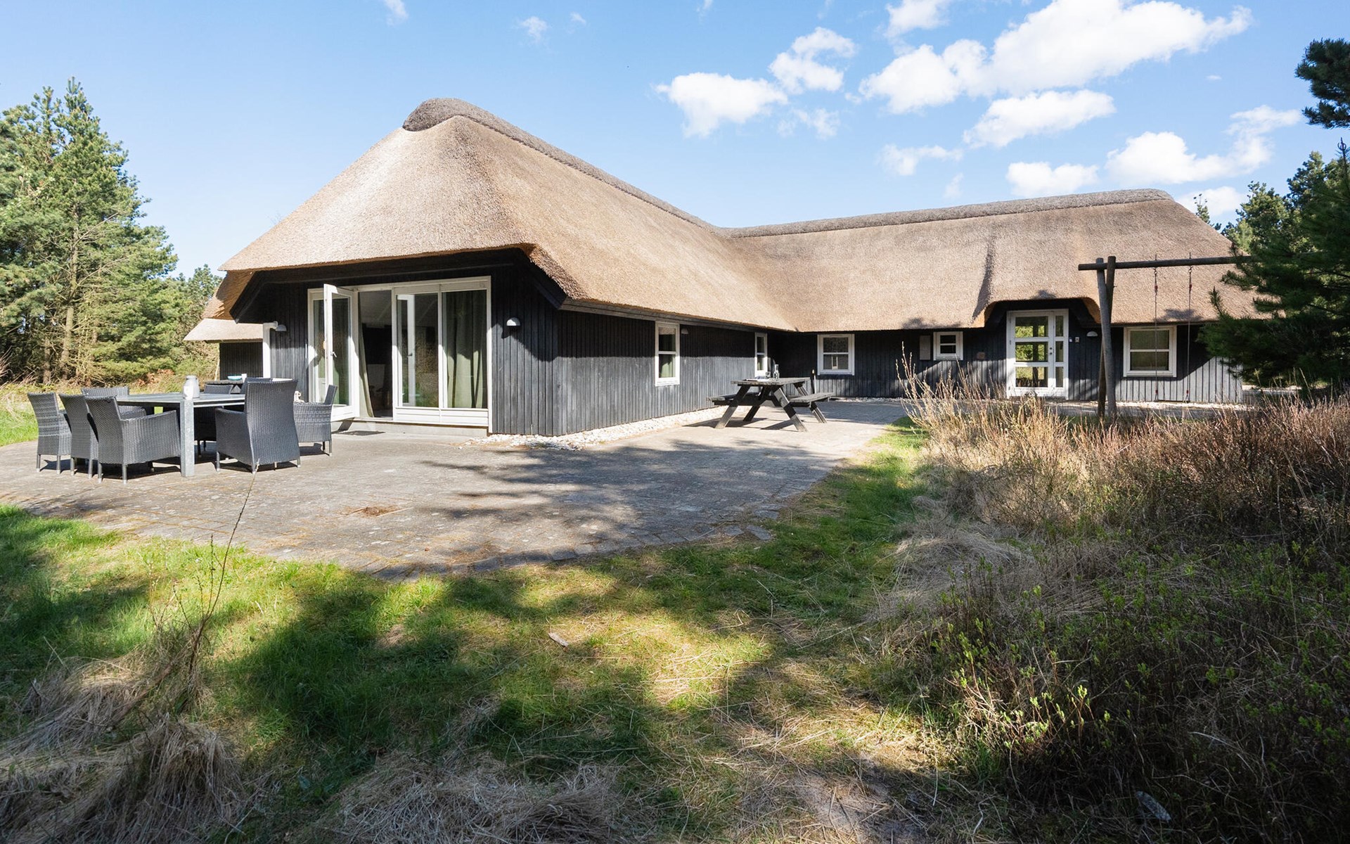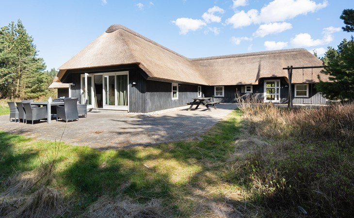 Breng een ontspannende vakantie door in het populaire vakantieoord Blåvand in een ruim rietgedekt huis met zwembad en sauna.