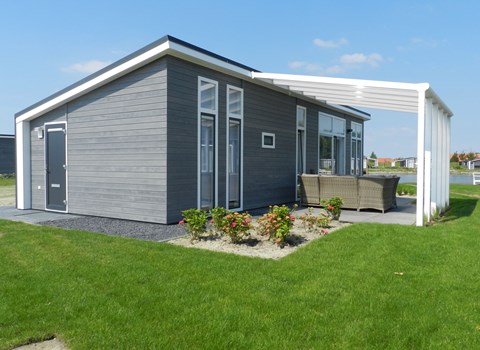 Luxe vakantiebungalow voor 5 personen. De woning beschikt over 2 slaapkamers, een luxe keuken, een prachtige serre en een tuin met veel privacy.