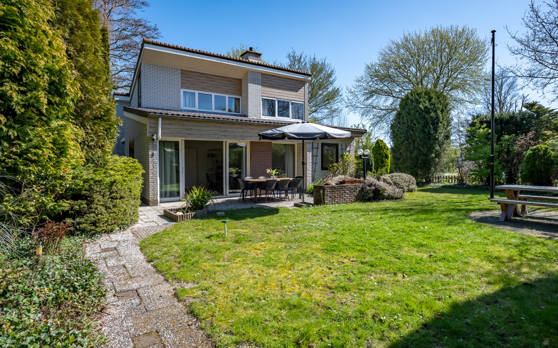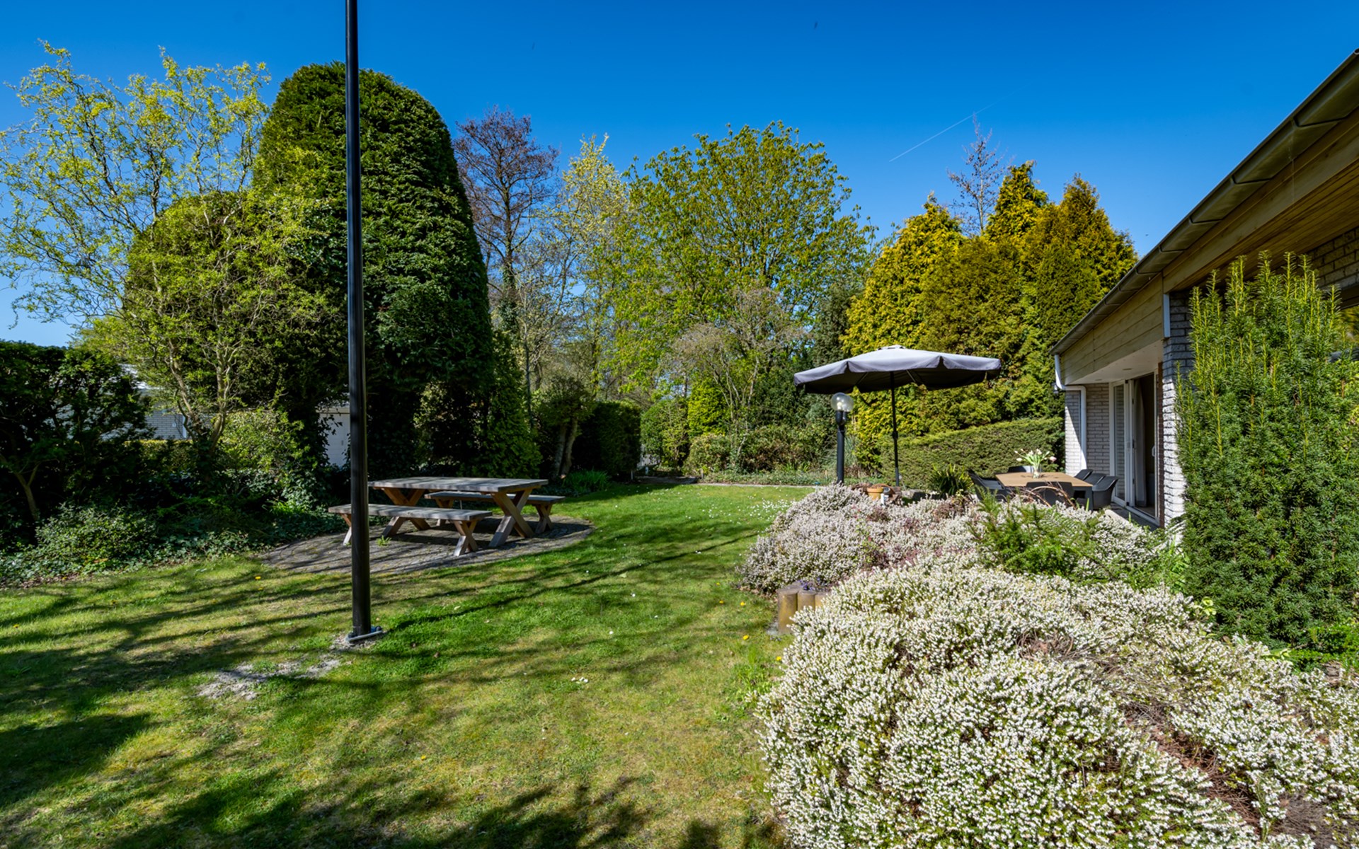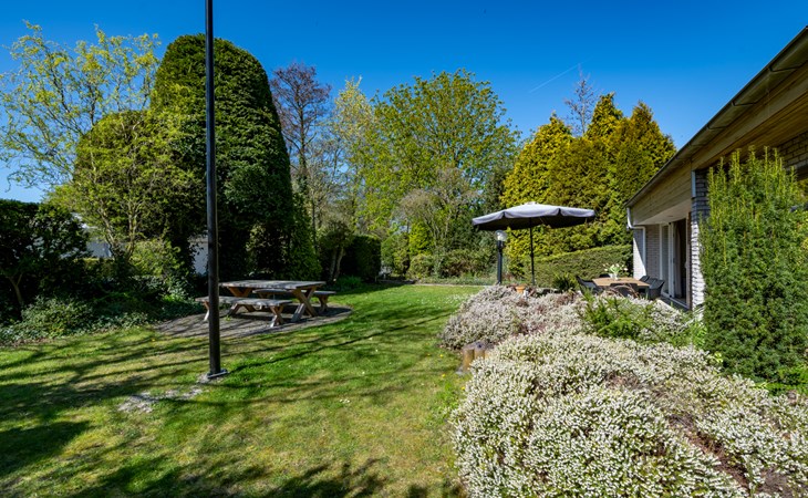 Tuin goed onderhouden met nieuwe tuintafel gemakkelijke stoelen inclusief nieuw tuinstel grote blank houen tafel en bijbehorende twee zitbanken achter in de tuin.