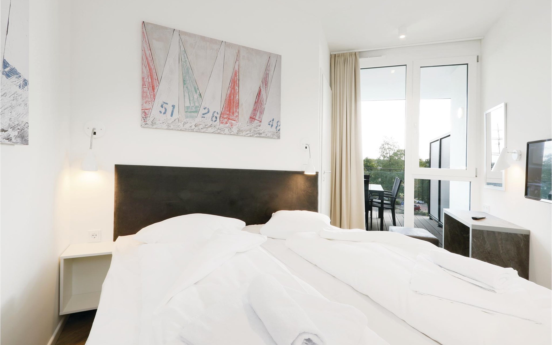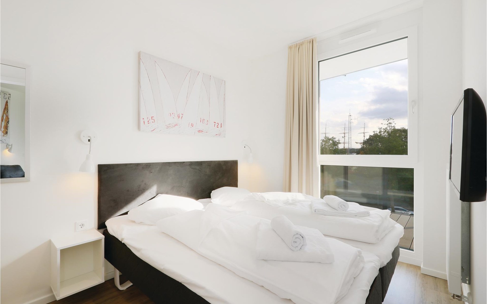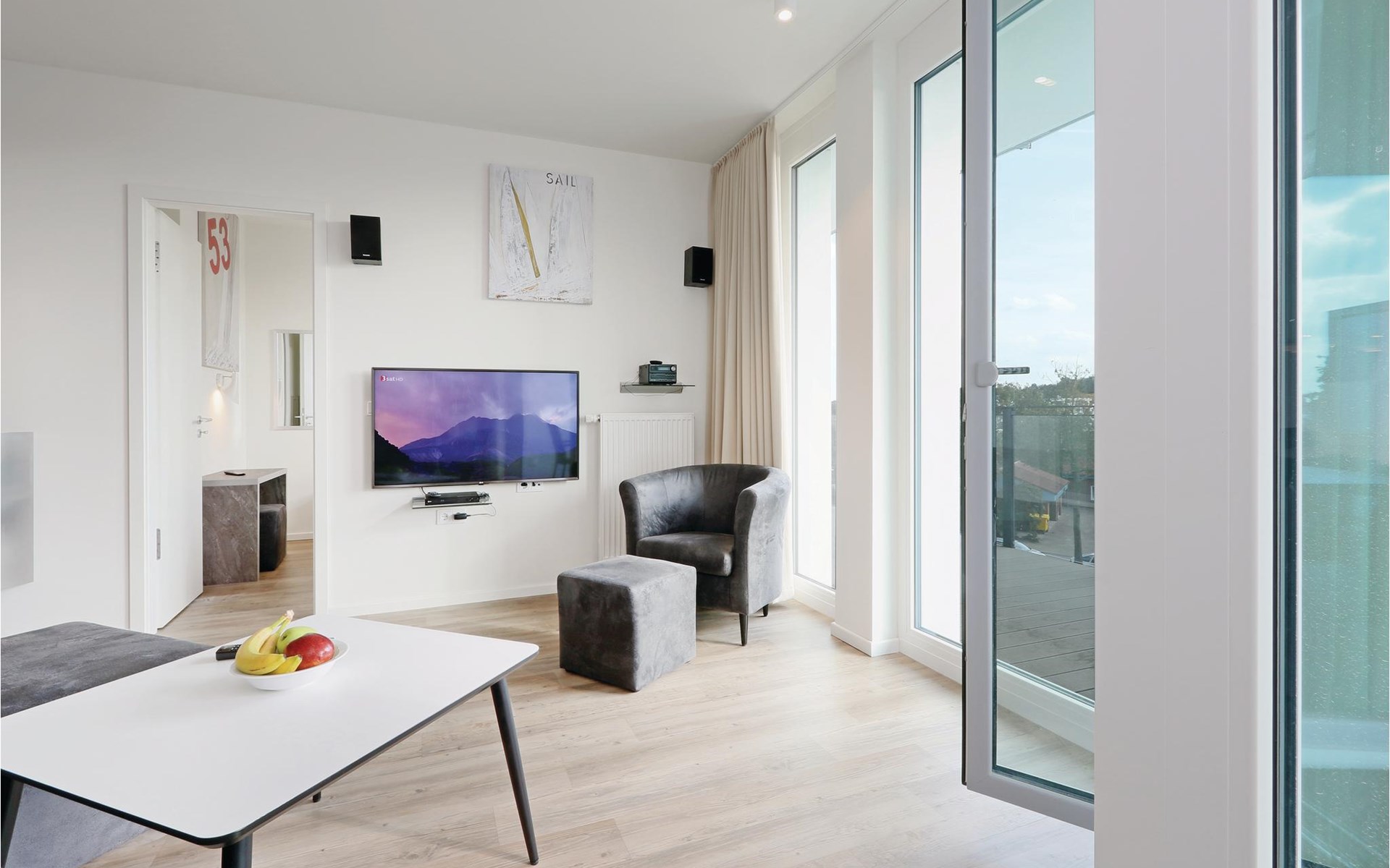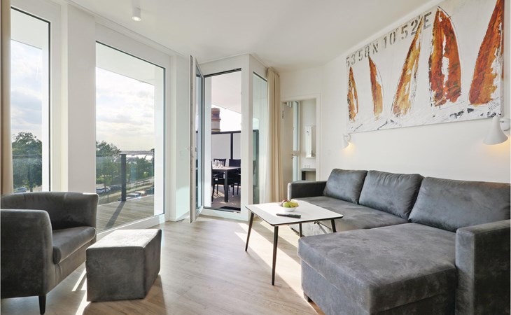 De moderne kitchenette biedt voldoende ruimte om te koken en is uitgerust met hoogwaardige merkapparatuur. Liefhebbers van geuren vinden hier een Nespresso-apparaat (neem uw eigen capsules mee), evenals een thermosfles en een handfilter om thuis te zetten, voor het geval u toch de voorkeur geeft aan de klassieke filterkoffie. Op het balkon, dat op het zuiden ligt, kunt u genieten van de frisse Oostzeelucht en het geluid van de golven of samen met het gezin eten. Geniet hier van het uitzicht op de haveningang en het strand van Priwall. Tegen een kleine borg kunt u bij de receptie een verrekijker lenen om de drukte in de omgeving en de natuur te observeren.