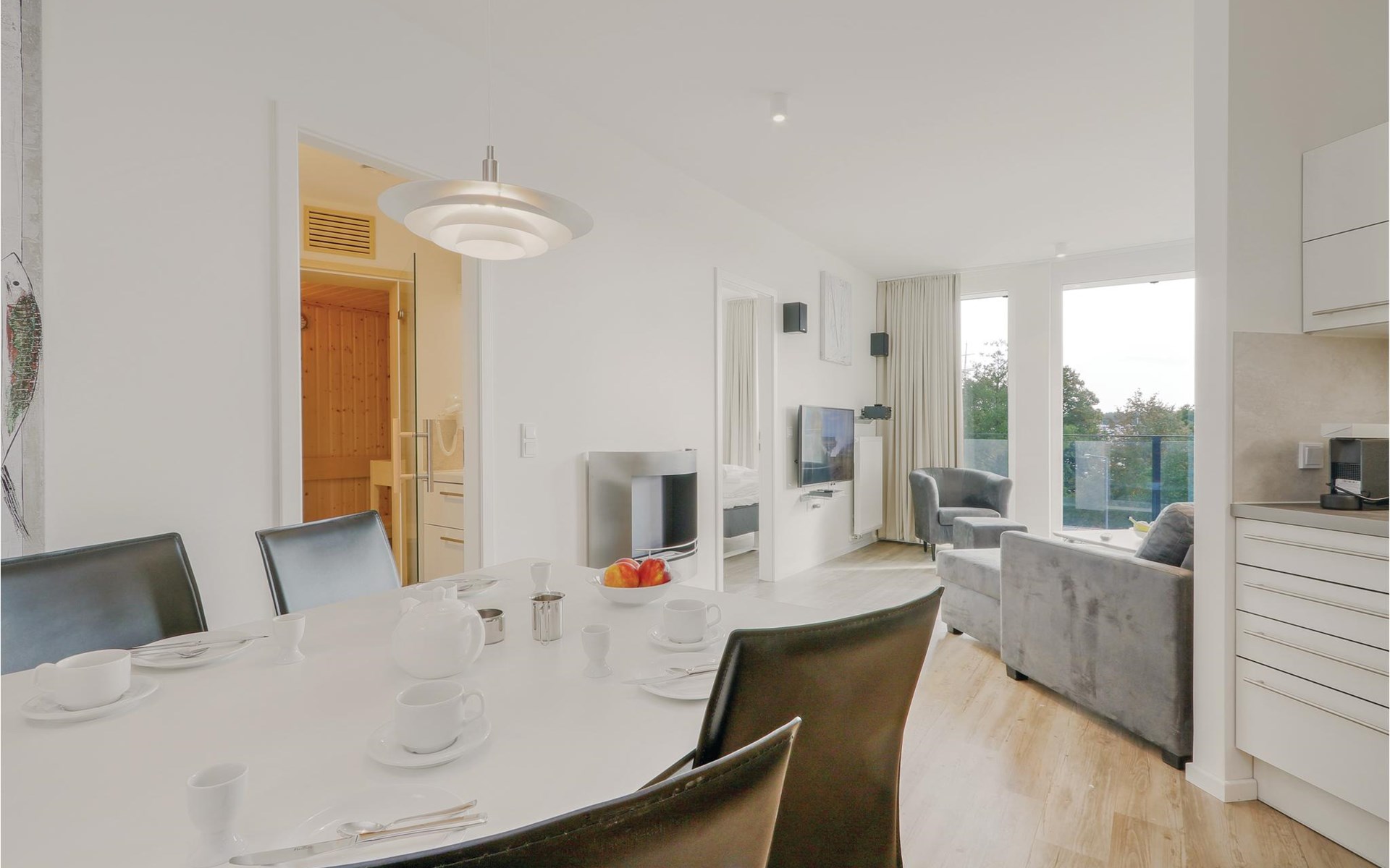 Het moderne entertainmentsysteem met Blu-Ray speler, muzieksysteem met MP3 aansluiting en 3 flatscreen TV's biedt voldoende entertainment. Alle kamers zijn ingericht in Scandinavische stijl en zijn helder en licht dankzij de ramen van vloer tot plafond.