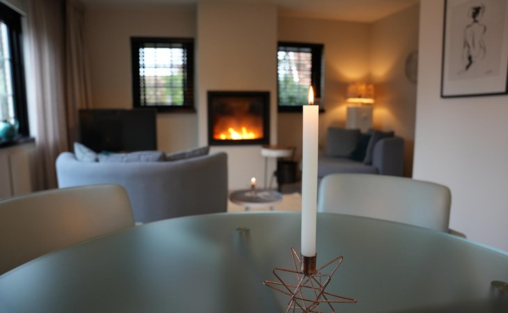 Binnen straalt de woning rust uit. Geniet van het gezellige houtvuur in de grote liftdeur openhaard terwijl je ontspant in de ronde loveseats. Luister naar muziek via SONOS, bekijk tv op de smart TV, of lees een boek; jij bepaalt het tempo. Verder staat er in de woonkamer ook een gezellige ronde eettafel met vier stoelen, de ideale plek om de dag gezellig te beginnen onder het genot van een goed ontbijt. De keuken is van alle gemakken voorzien en beschikt onder andere over een vaatwasser, combi-oven, keramische kookplaat, waterkoker, en een Nespresso koffieautomaat.