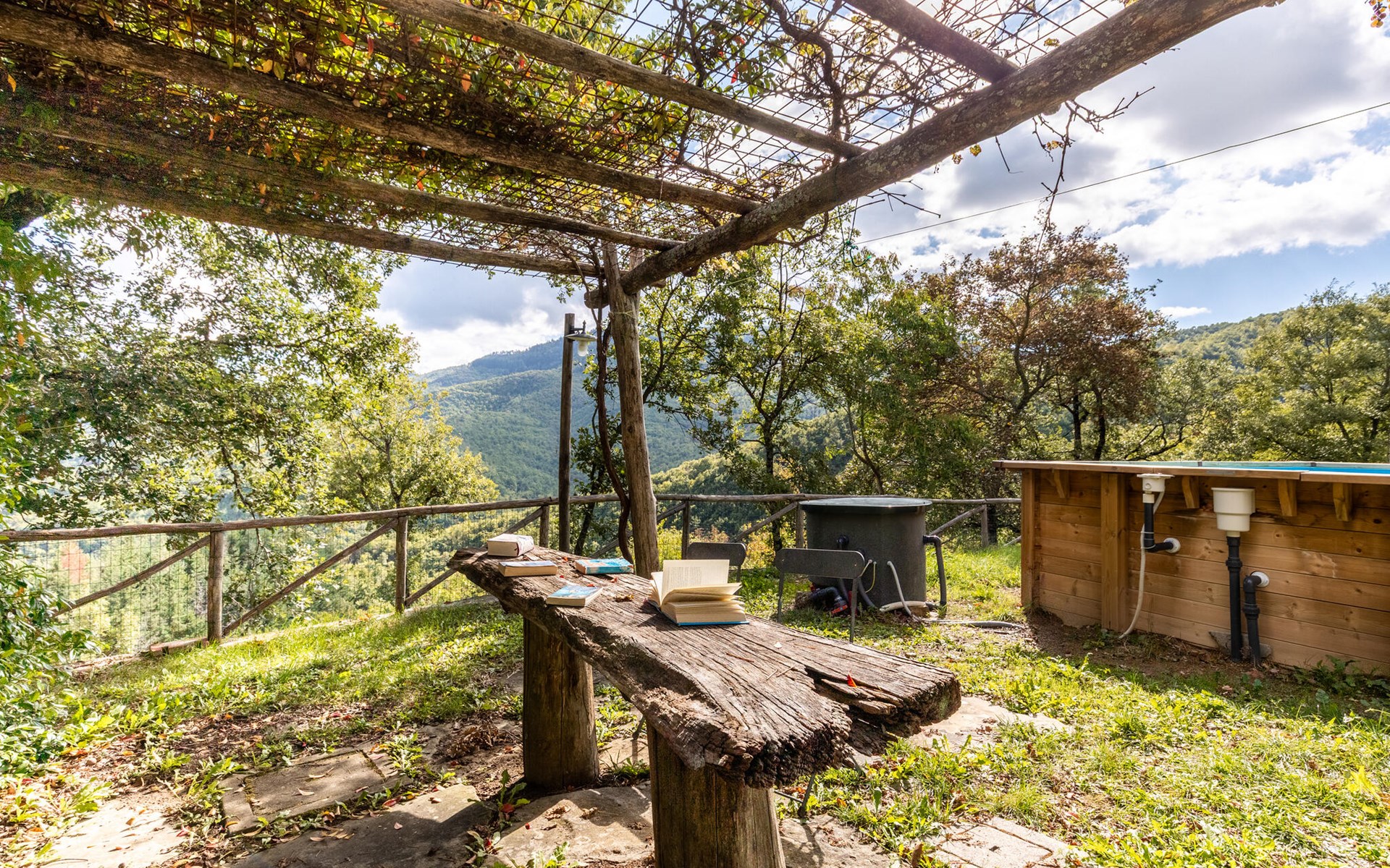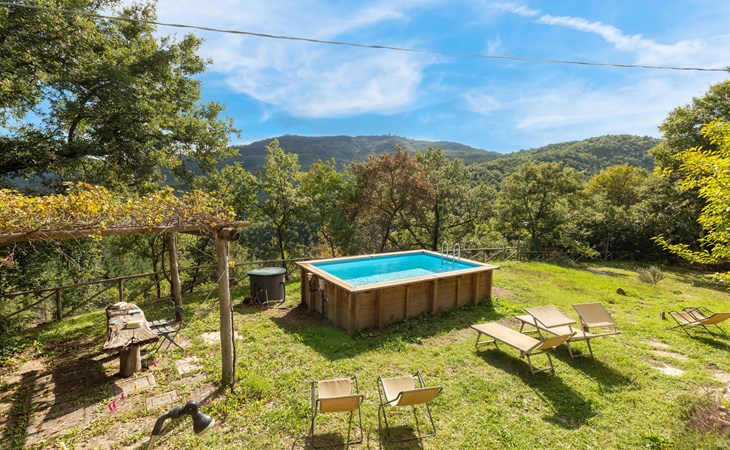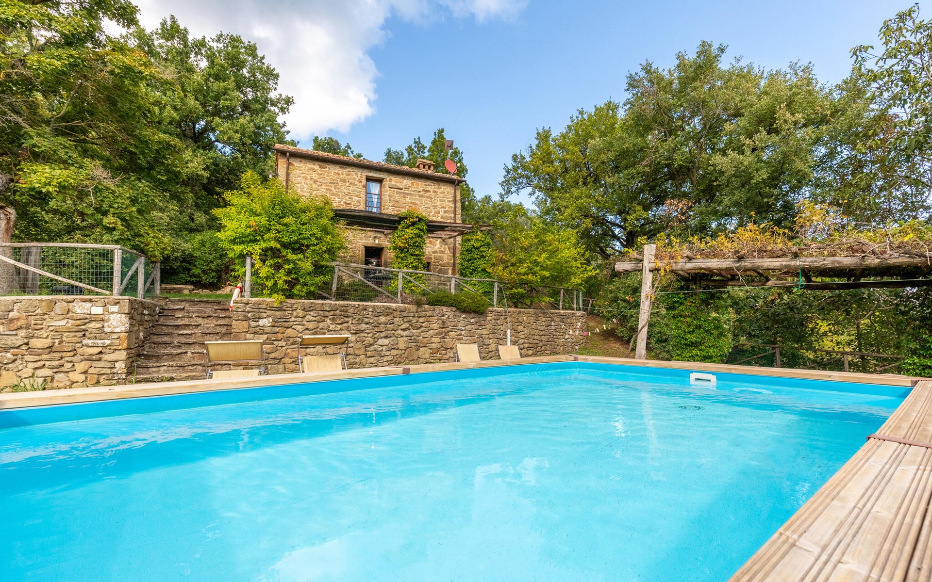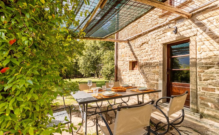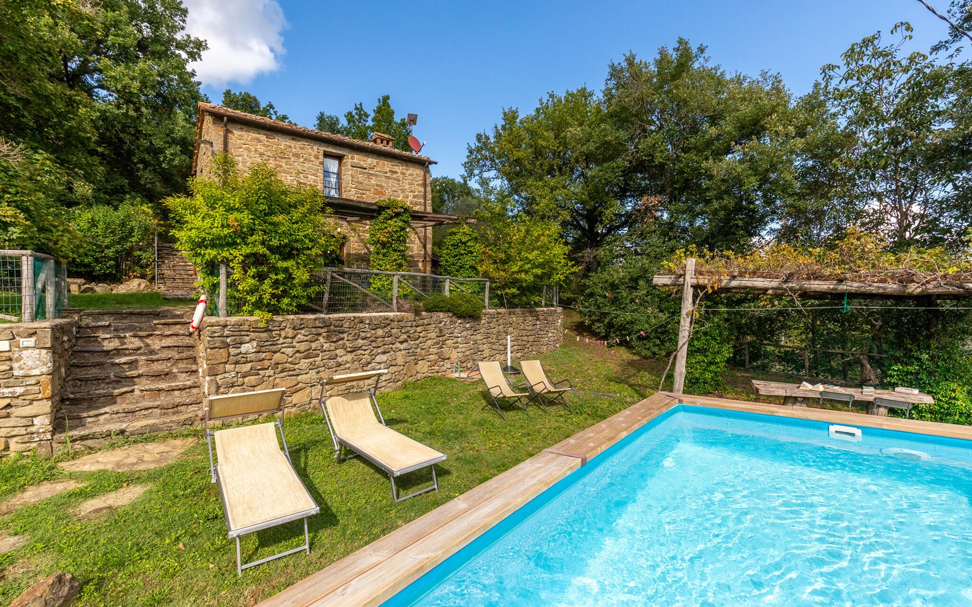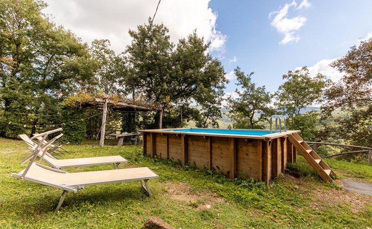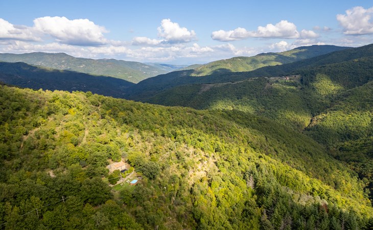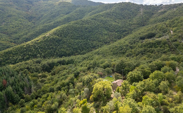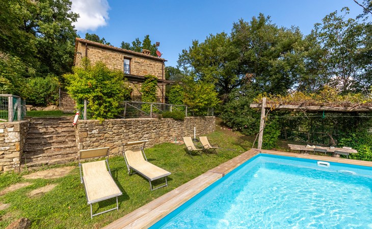 Rustig gelegen natuurstenen huis op een heuvel, omgeven door uitgestrekte bossen. Rustieke inrichting. Voor de keuken met open haard is een romantische zithoek met barbecue en pizza-oven. Iets lager op het terrein nodigt het zwembad uit tot verfrissing. Rondom zijn bossen - hier bent u echt helemaal alleen: ideaal om te ontspannen, te wandelen en te snuffelen. Van hieruit kunt u het Trasimenomeer met zijn zandstranden bezoeken (35 km), Arezzo (30 km), Montepulciano (45 km), Città di Castello (35 km), Castiglion Fiorentino met allerlei winkels, restaurants en een kleurrijke weekmarkt 18 km, Cortona 25 km. De toegangsweg (4,3 km) is niet geasfalteerd, deels hobbelig, steil, bochtig en daarom alleen geschikt voor 4x4 voertuigen. Airconditioning in de slaapkamers.