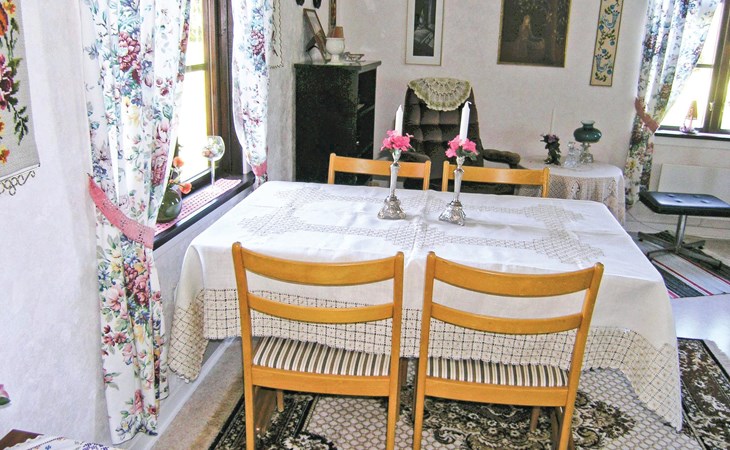 Geniet van de gezellige sfeer van je vakantiehuis. De kamers zijn liefdevol ingericht en voorzien van vele klassieke details die doen denken aan vervlogen tijden. In de woonkamer zorgt een comfortabele zithoek voor gezellige uurtjes terwijl je ontspant met een boek of een kopje thee. Je kunt samen eten in de eethoek en genieten van het uitzicht op het groene landschap door de ramen. De keuken is ook ontworpen in typische lokale stijl en uitgerust met alles wat je nodig hebt om je eigen maaltijden te bereiden.