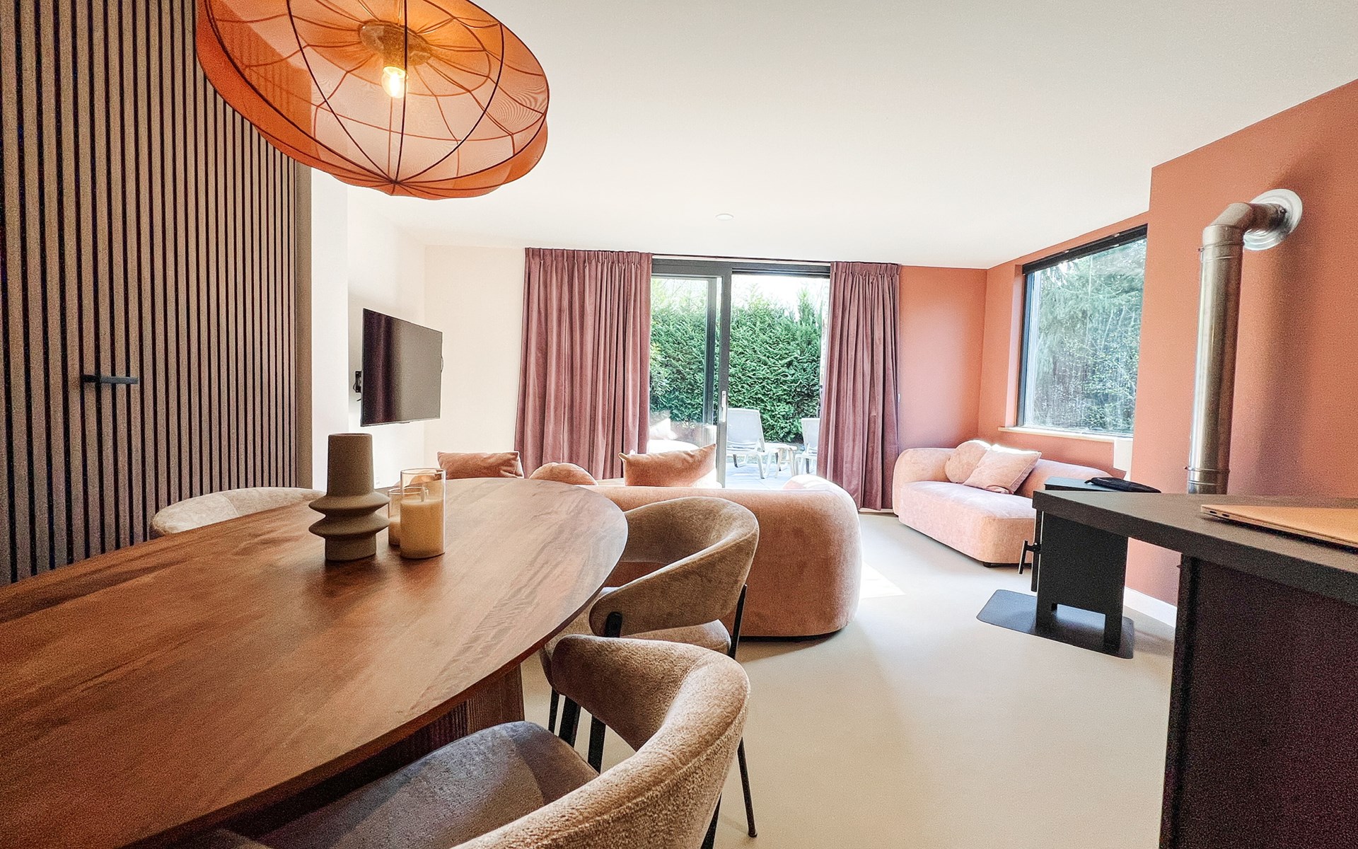 Binnen vind je een warme, moderne inrichting met zorg uitgekozen meubels. Geen standaard vakantiehuis, maar een plek met karakter en stijl. De houtkachel zorgt voor extra gezelligheid op koudere dagen, en buiten kun je genieten bij de vuurplaats met een goed glas wijn.