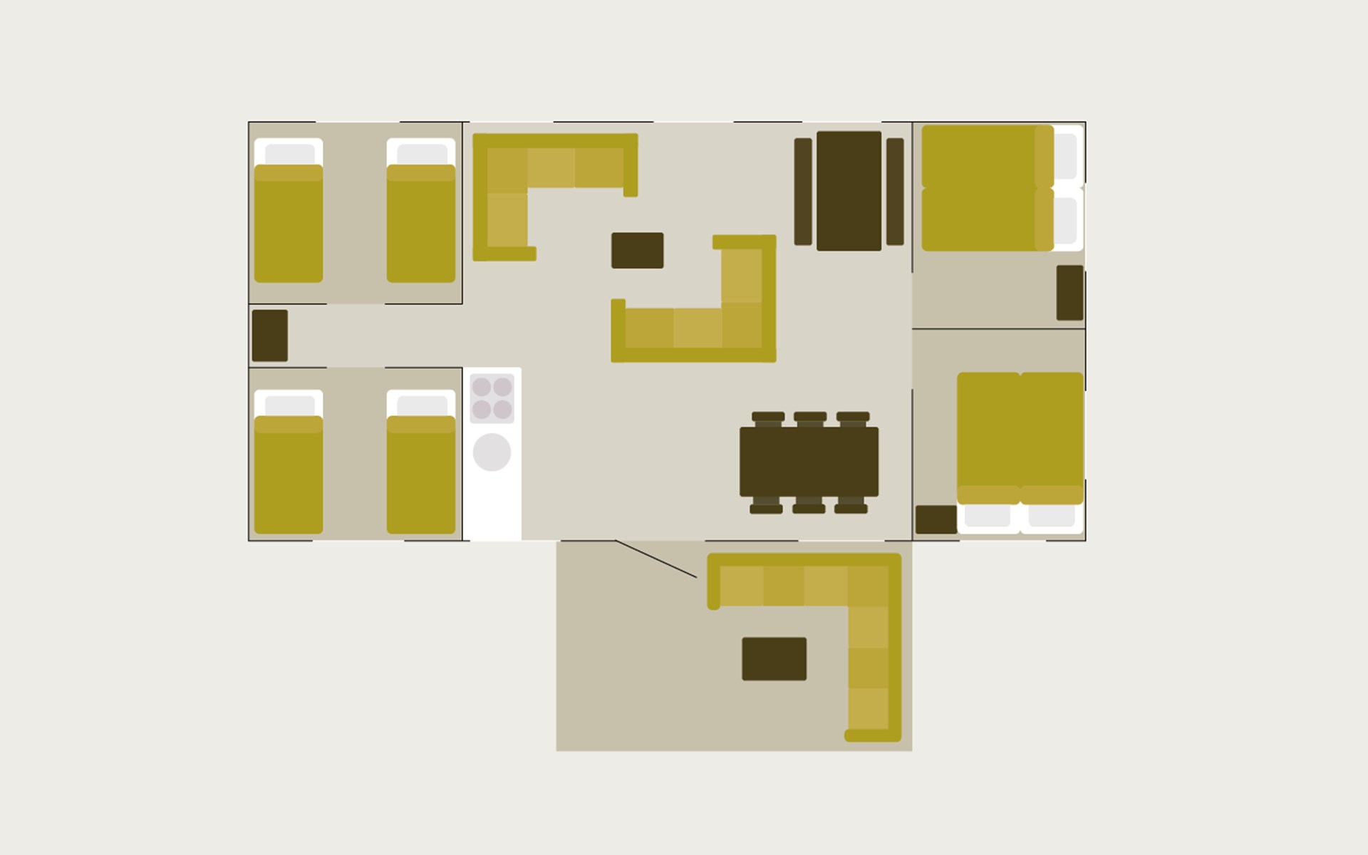 Bij Recreatiepark De Boshoek op de Veluwe vind je de ultieme vakantie-ervaring in de Safari Villa, een ruime glamping-accommodatie die comfort en avontuur perfect combineert. Deze Safari Villa biedt ruimte aan 12 personen, waardoor het de ideale keuze is voor een vakantie met de familie of een vriendengroep. Het interieur heeft een stoere en robuuste uitstraling door het houten meubilair en de unieke tent-look. De Safari Villa beschikt over vier slaapkamers, waarvan twee met stapelbedden en twee met twee eenpersoonsbedden. Voor de kleintjes is er ruimte voor een campingbedje in de tweepersoonskamers. De luxe van privé sanitair, met twee units die elk voorzien zijn van een douche, wastafel en toilet, maakt het verblijf extra comfortabel.