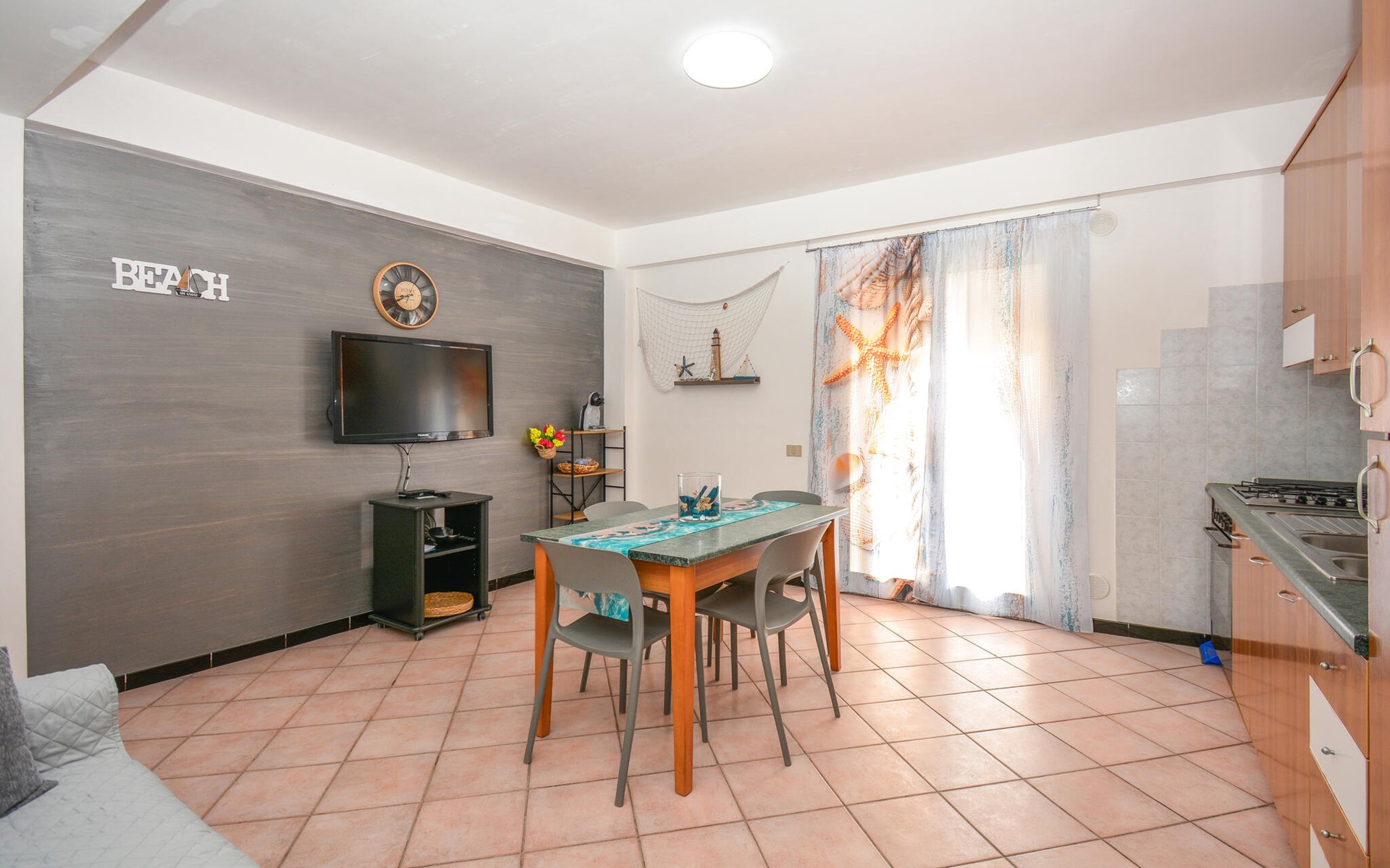 In Santa Croce Camerina im Süden Siziliens erwartet Sie diese praktische Ferienwohnung, die gute Voraussetzungen für erholsame Strandtage bietet. Starten Sie Ihren Morgen mit einer Tasse Kaffee auf Ihrem Balkon und spüren Sie die Vorfreude auf den bevorstehenden Urlaubstag. Der einladende Innenbereich mit kleiner Küche, Esstisch und Sofa sorgt für die nötige Entspannung und die Möglichkeit, gemeinsame Zeit zu verbringen. Relaxen Sie oder kommen Sie zu lustigen Gesellschaftsspielen zusammen.