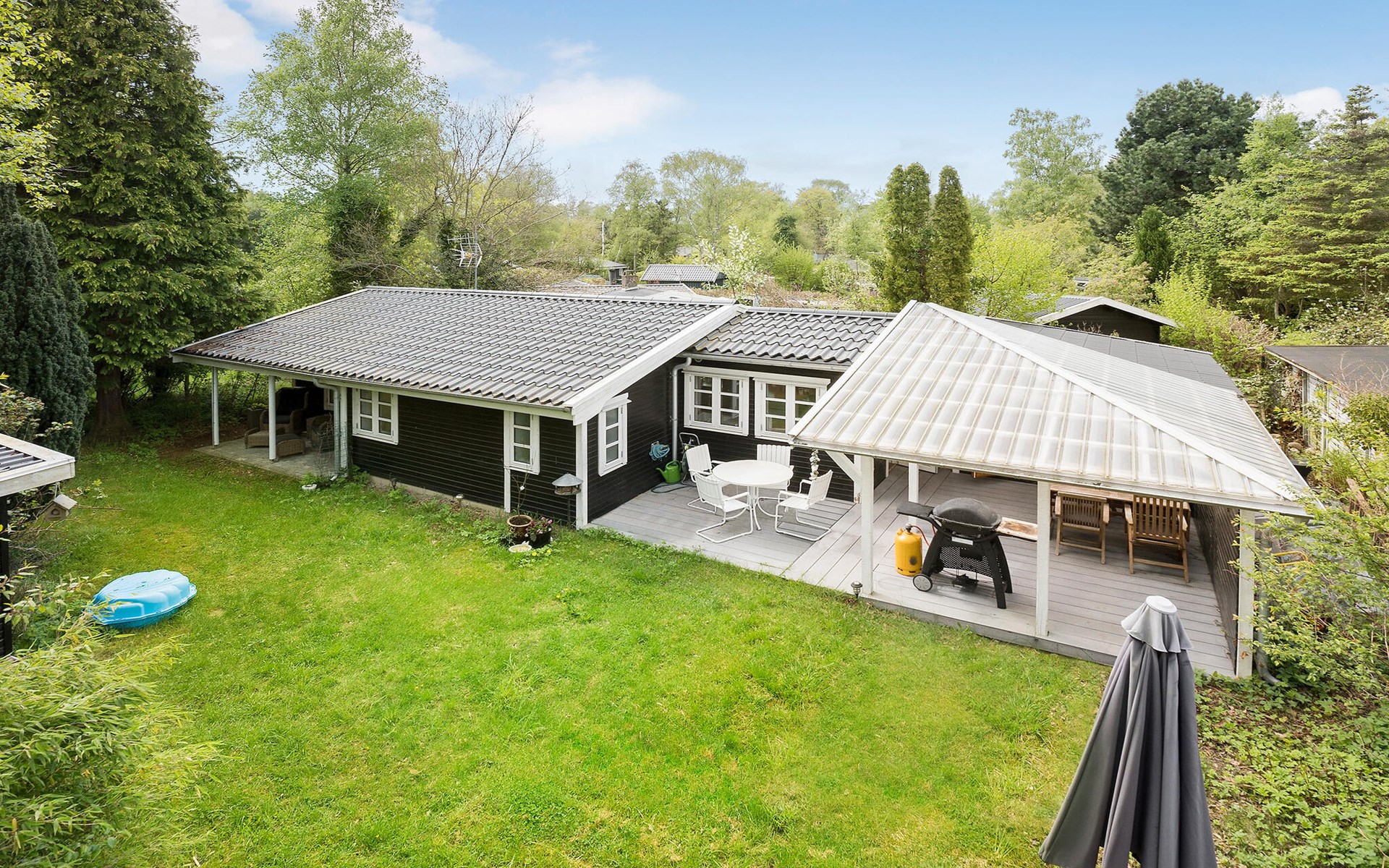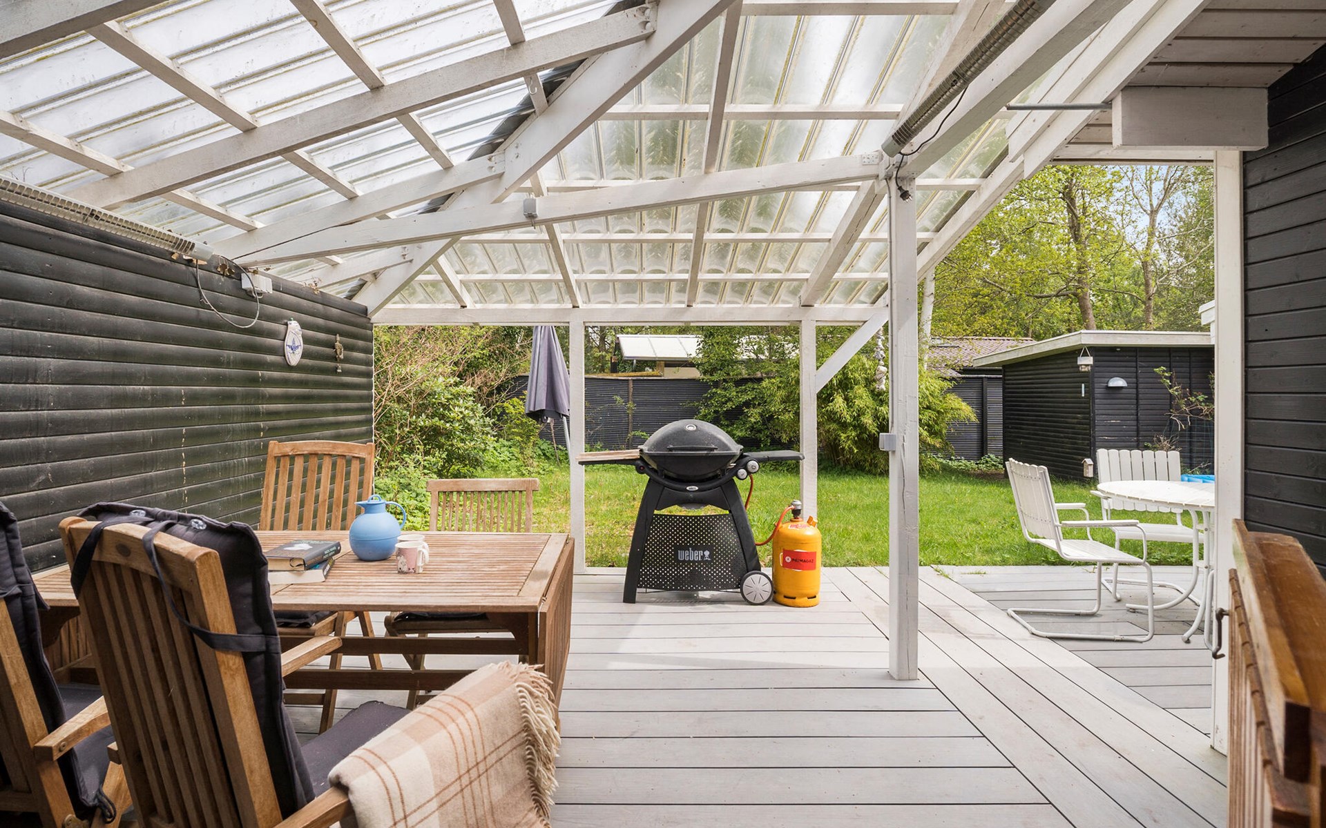 Der Außenbereich Ihres Ferienhauses bietet zahlreiche Möglichkeiten, die frische Luft und die Natur zu genießen. Die große, überdachte Terrasse mit komfortablen Sitzmöglichkeiten ist ideal für Grillabende und Mahlzeiten im Freien, auch wenn sich das Wetter mal nicht von seiner besten Seite zeigen sollte. Nutzen Sie auch den gepflegten Garten, der für Kinder viel Platz zum Spielen bietet. Ihr Ferienhaus liegt in einer ruhigen Umgebung, die zum Entdecken einlädt. Unternehmen Sie Spaziergänge in der Natur und entdecken Sie die zahlreichen schönen Strände an der nahe gelegenen Küste.