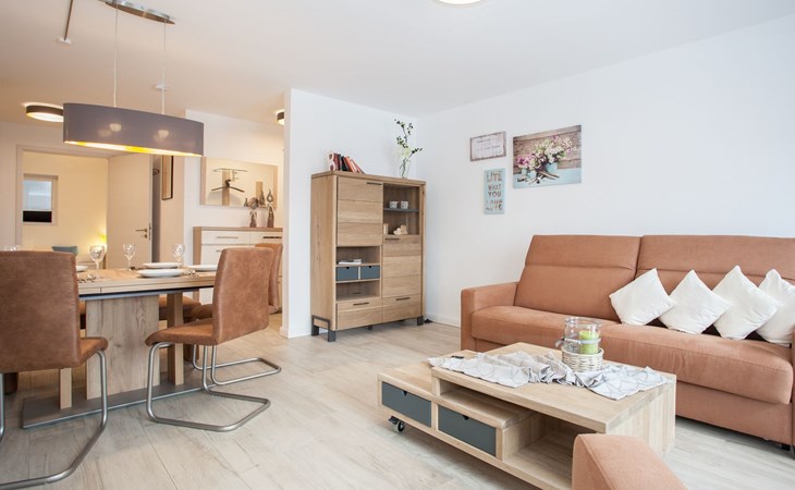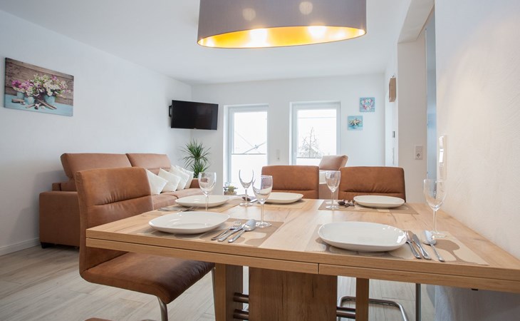 Kehren Sie dem Alltag den Rücken und genießen Sie in unserer exquisit eingerichteten Ferienwohnung, die malerische Landschaft und die abwechslungsreichen Angebote der Ferienwelt Winterberg! Der Wohnbereich ist mit einer Fußbodenheizung versehen und verfügt über eine gemütliche Sofaecke sowie einen Essbereich. Das Sofa lässt sich mit einem Handgriff zu einem Bett für „2“ mit Matratze und Lattenrost umfunktionieren. Babybett vorhanden. Ein Flachbildfernseher ist selbstverständlich vorhanden. Durch die großen Wohnzimmerfenster genießen Sie den Blick auf die Bobbahn und den Sessellift "Kappe" mit seinen Abfahrten. Unsere Küche verfügt über eine Kühl-, Gefrierkombination und eine Spülmaschine. Zudem verfügt sie über Ceranfeld, Backofen, Filterkaffeemaschine sowie einem Wasserkocher, Mikrowelle und einem Toaster. Im Schlafzimmer finden sie ein großes, luxuriöses Boxspringbett, welches Ihnen erholsame Nächte garantiert. Das zweite Schlafzimmer hat ein Bett mit einem ausziehbaren Bett darunter, wodurch ein "Doppelbett" entsteht, geeignet für Kinder oder kleinere Personen ergibt sich (1 Matratze 90x200cm und 1 Matratze 90x190cm). Das Badezimmer mit ebenerdiger Dusche ist ebenso wie der Wohnbereich mit einer Fußbodenheizung versehen. Im Sommer entspannen Sie auf unserer nach Süden ausgerichteten Sonnenterrasse.
