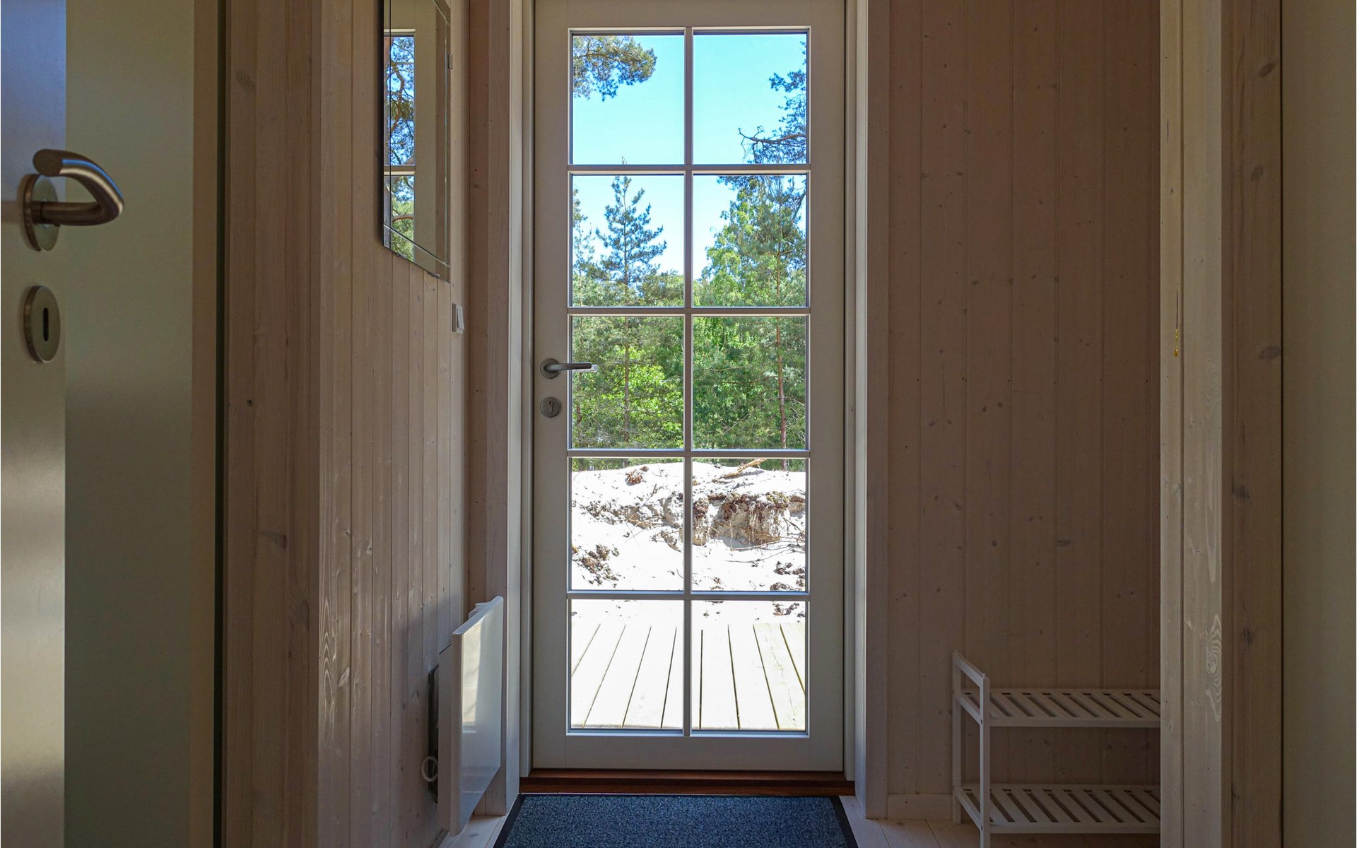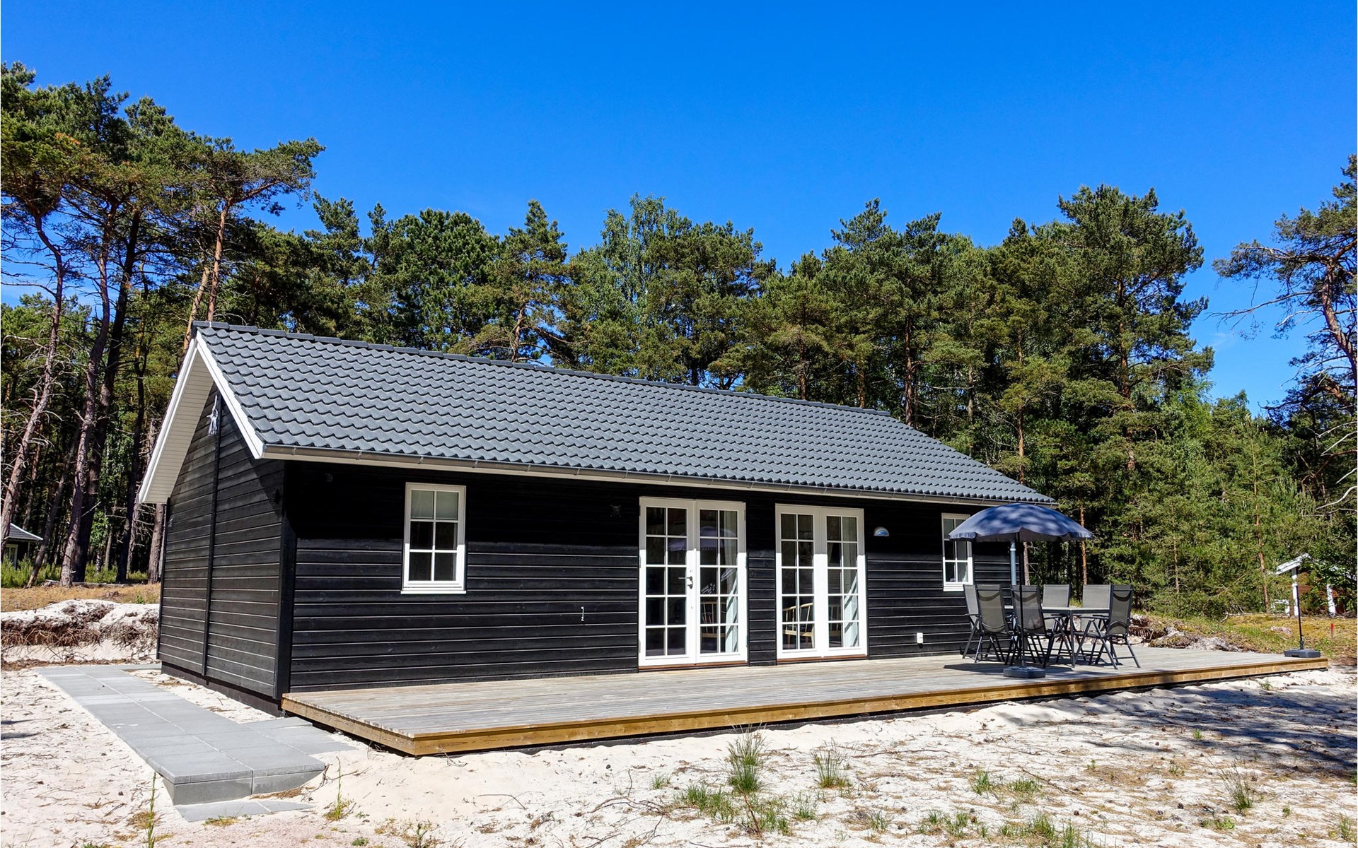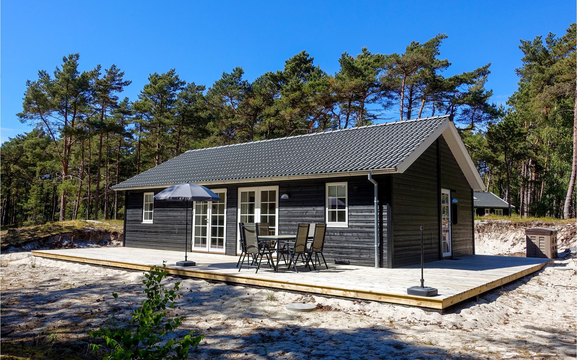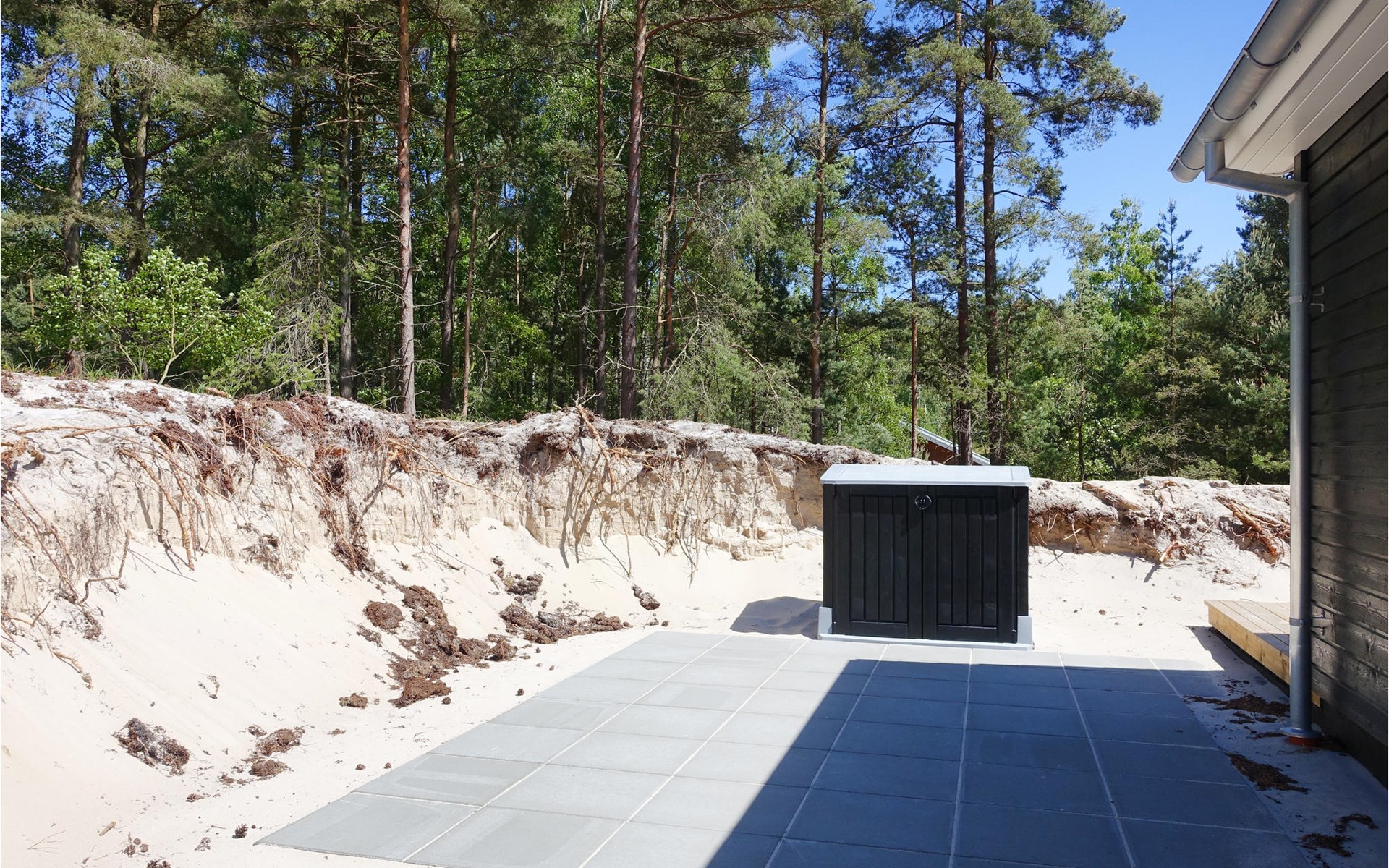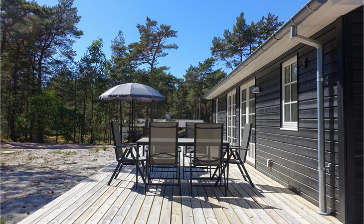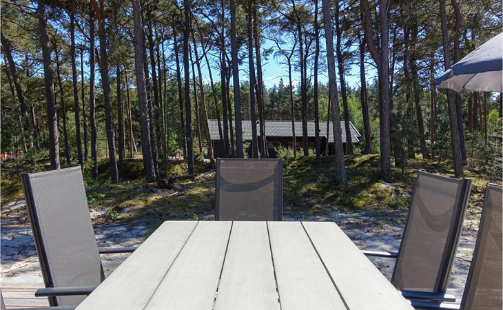Fast um das ganze Haus herum erstreckt sich eine Terrasse mit bequemen Loungemöbeln, sodass Sie immer einen wunderbaren Platz zum Sitzen finden werden. Hier lässt es sich gut Leben, die Sonne, die frische Luft genießen, ein gutes Buch lesen oder eine Tasse Kaffee oder ein Glas Wein trinken. Es steht auch ein Grill zur Verfügung, damit Sie köstliche Gerichte im Freien zubereiten können. Die Kinder werden es lieben, auf dem sandigen und bewaldeten Grundstück rund um das Haus zu spielen.