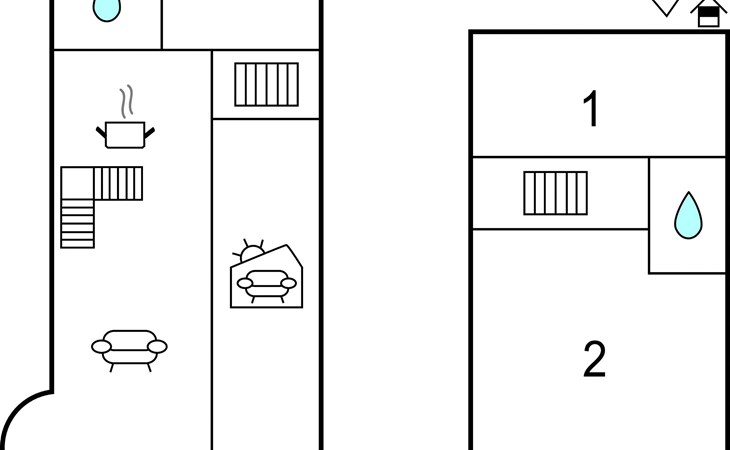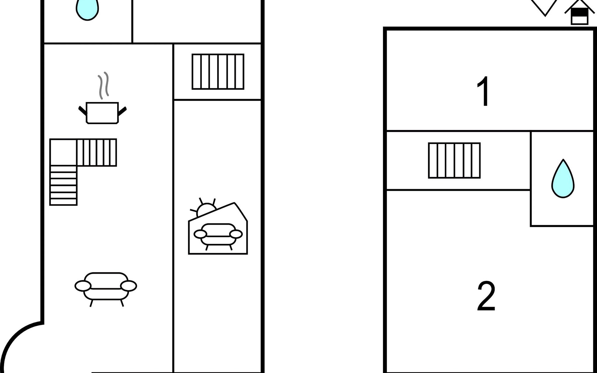 Das Obergeschoss ist über eine steile Treppe erreichbar. Hier befindet sich ein Schlafzimmer mit Doppelbett und ein Schlafzimmer mit ausziehbarem Doppelbett sowie ein Hochbett für ein Kind.