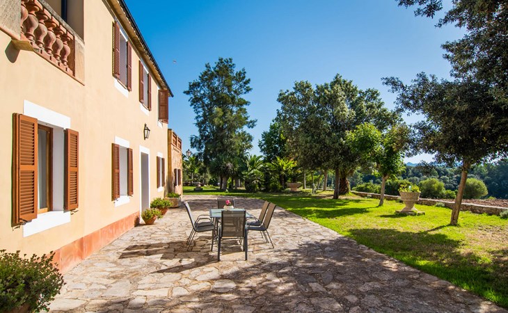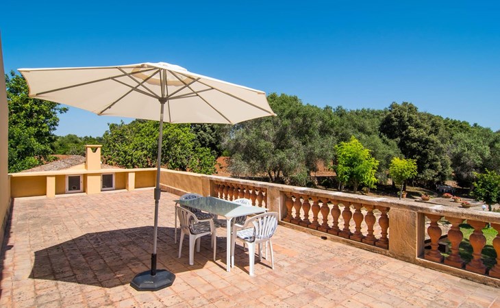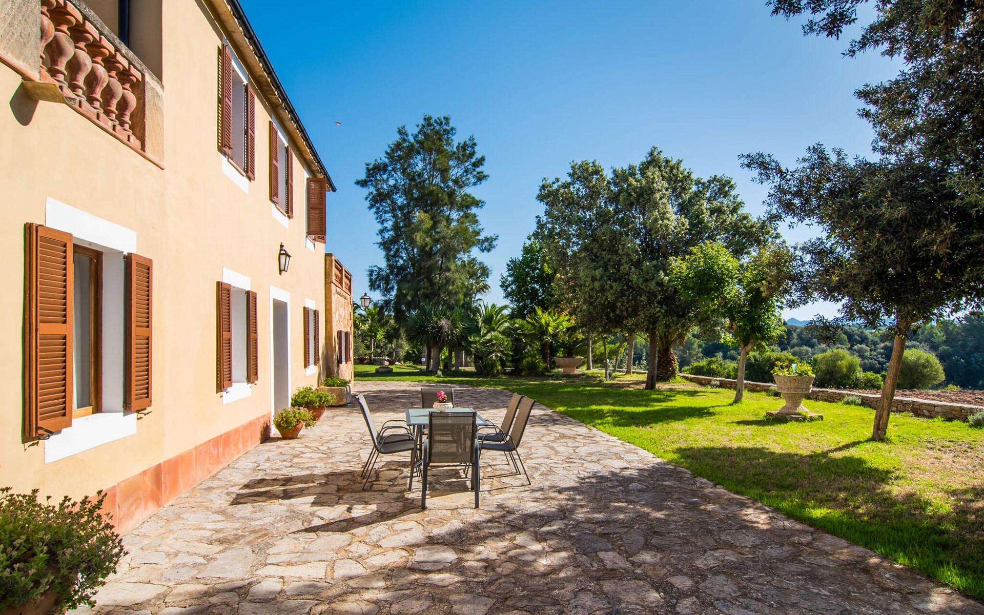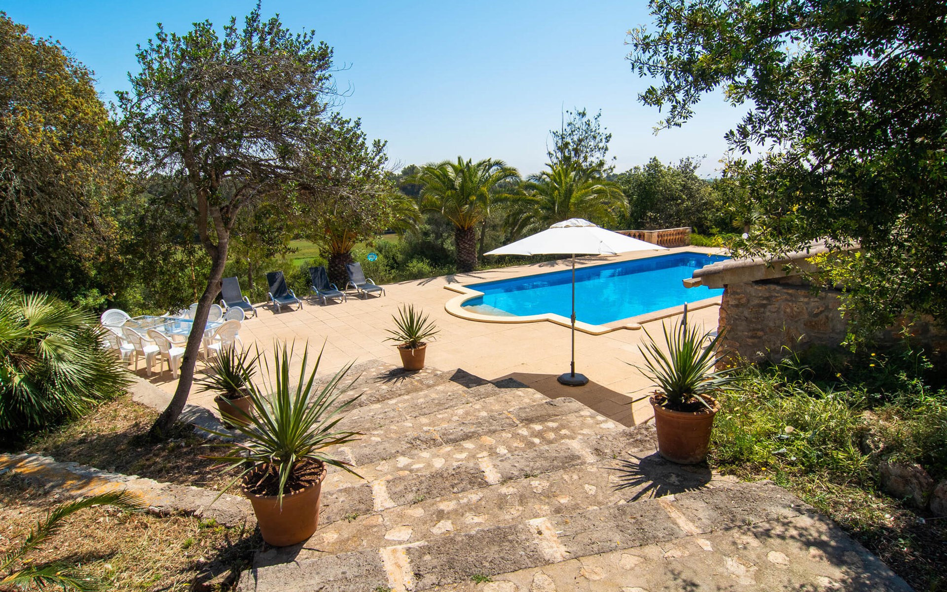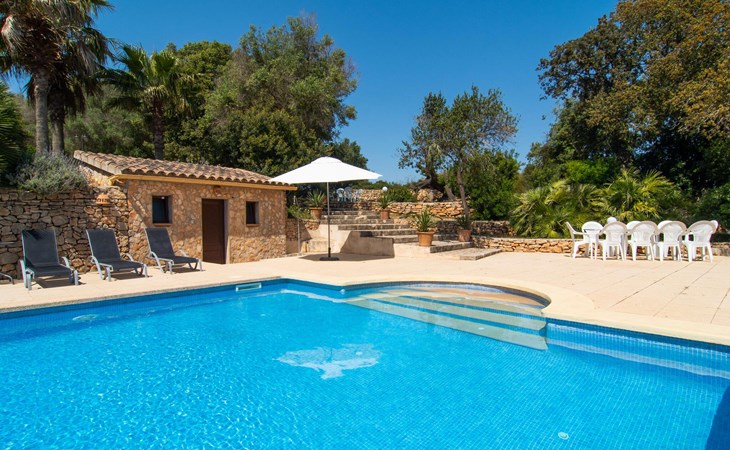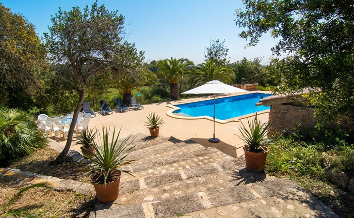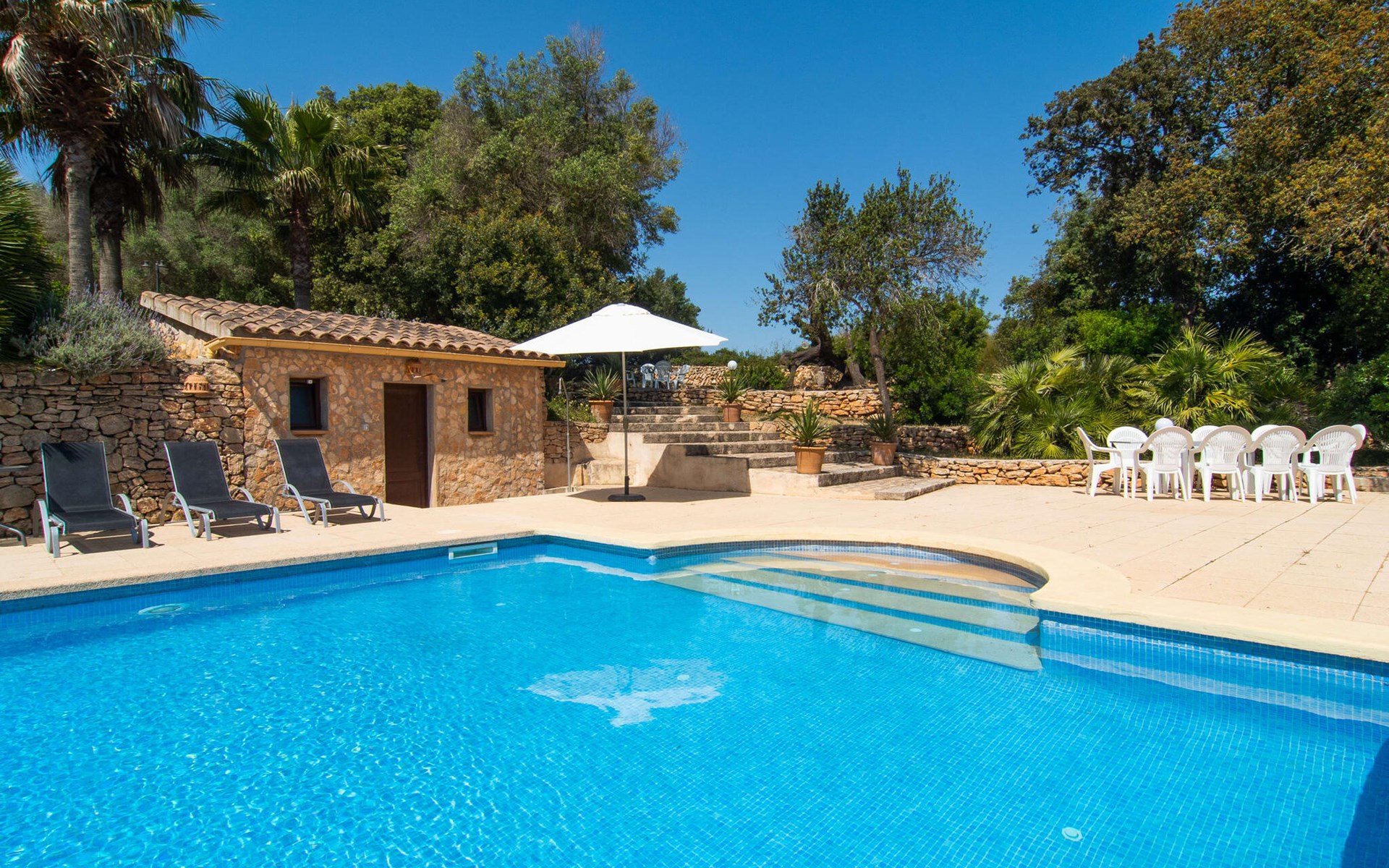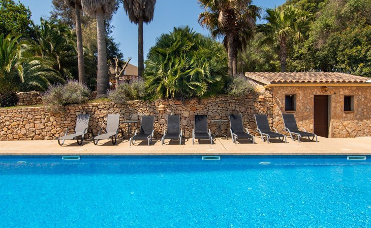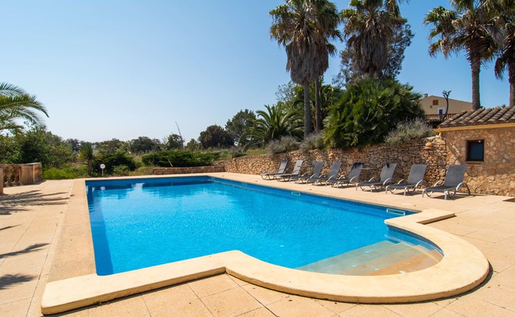 Wer sich für die Villa „Ses Cases de Son Isidros“ entscheidet, kann sich bei seinem Aufenthalt auf Mallorca guten Gewissens wie ein Großgrundbesitzer fühlen: das weitläufige Anwesen, das an einen wildromantischen Park erinnert und auf dem Palmen und andere mediterrane Pflanzen wachsen Bäume spenden Schatten, umfasst eine Fläche von knapp 100.000 m². Hier können Sie nach Lust und Laune spazieren gehen, sich an den intensiv leuchtenden Blumen erfreuen, mit den Kleinen Verstecken spielen, in einer der gemütlichen Sitzecken einen Nachmittagstee genießen oder einfach einen erfrischenden Sprung ins kühle Nass wagen Ihr stattlicher Pool. Anschließend können Sie am Steinrand Ihre Beine im Wasser baumeln lassen und sich dabei in eine unterhaltsame Urlaubslektüre vertiefen. Von der Poolterrasse, auf der mehrere Liegestühle zu einem Nickerchen in der Sonne einladen, führen Steinstufen hinauf zum Anwesen, an dessen Bruchsteinfassade sich eine überdachte Terrasse schmiegt. Vielleicht möchten Sie hier am späten Nachmittag den Grill aufbauen, um den Abend mit kulinarischen Köstlichkeiten der Insel ausklingen zu lassen. Eine große Dachterrasse und ein Balkon sind zudem ideale Orte, um sich die milde Inselluft, die angenehm nach Meer duftet, um die Nase wehen zu lassen.